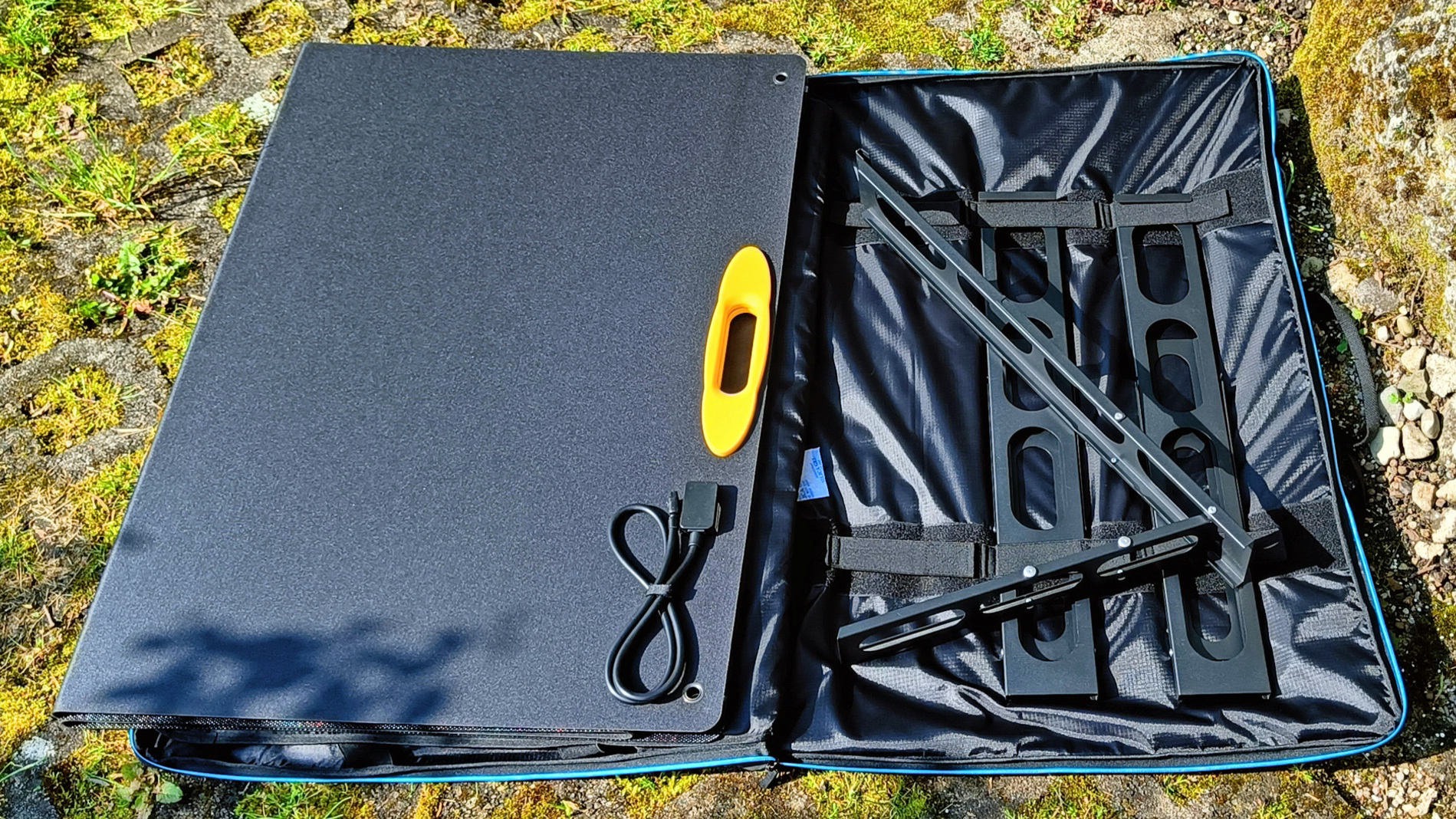 Das Solarpanel SP300 kommt sicher für den Transport verpackt zusammen mit drei kompakten Metallständern beim Kunden an. Zum Anschluss an die Powerstation kommt hier ein Anderson-Stecker zum Einsatz – eine ungewöhnliche Lösung. Die meisten Hersteller setzen bei den Panels auf herkömmliche MC4-Steckverbinder. Zusammengeklappt misst das Panel rund 90 x 63 x 5 cm und bringt 12 kg auf die Waage.