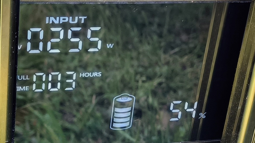 Nun geht es ans Aufladen der Powerstation. Dazu kommt zunächst das mitgelieferte Netzkabel zum Einsatz. Diese Lösung gefällt uns deutlich besser als ein externes Netzteil. Die Ladeleistung an der Steckdose beträgt ordentliche 1200 Watt, was sich positiv auf die Ladedauer auswirkt. Nach nur knapp zwei Stunden sind die internen Akkus wieder zu 80 Prozent geladen. Bis der Stromspeicher zu hundert Prozent gefüllt ist, vergehen noch einmal 40 bis 45 Minuten.