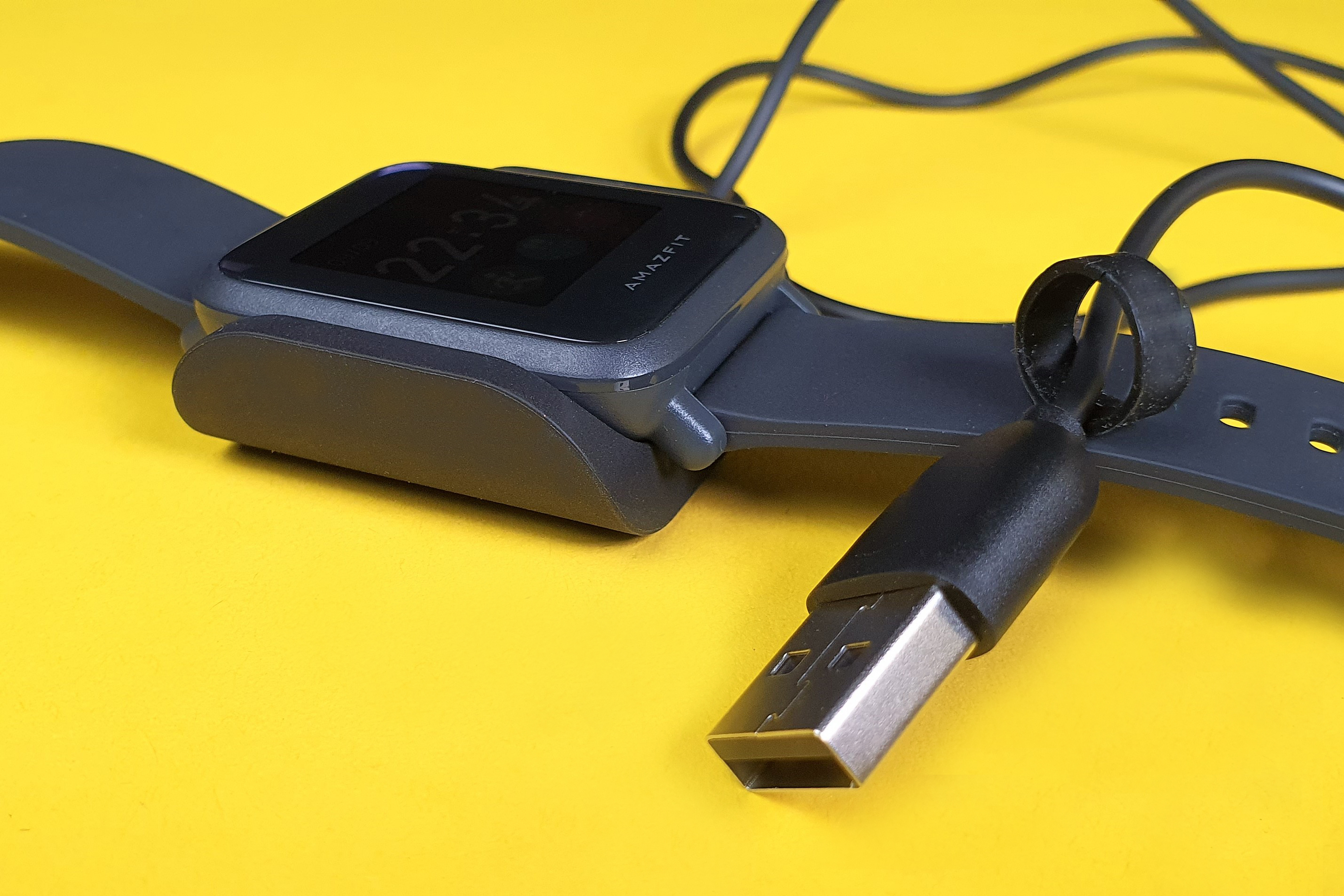 Geladen wird die Bip S in einem kleinen Adapter, in den die Uhr eingesetzt wird. Dieser bezieht den Strom per USB beispielsweise von einem Computer. Ein vollständiger Ladevorgang dauert etwa 2,5 Stunden.