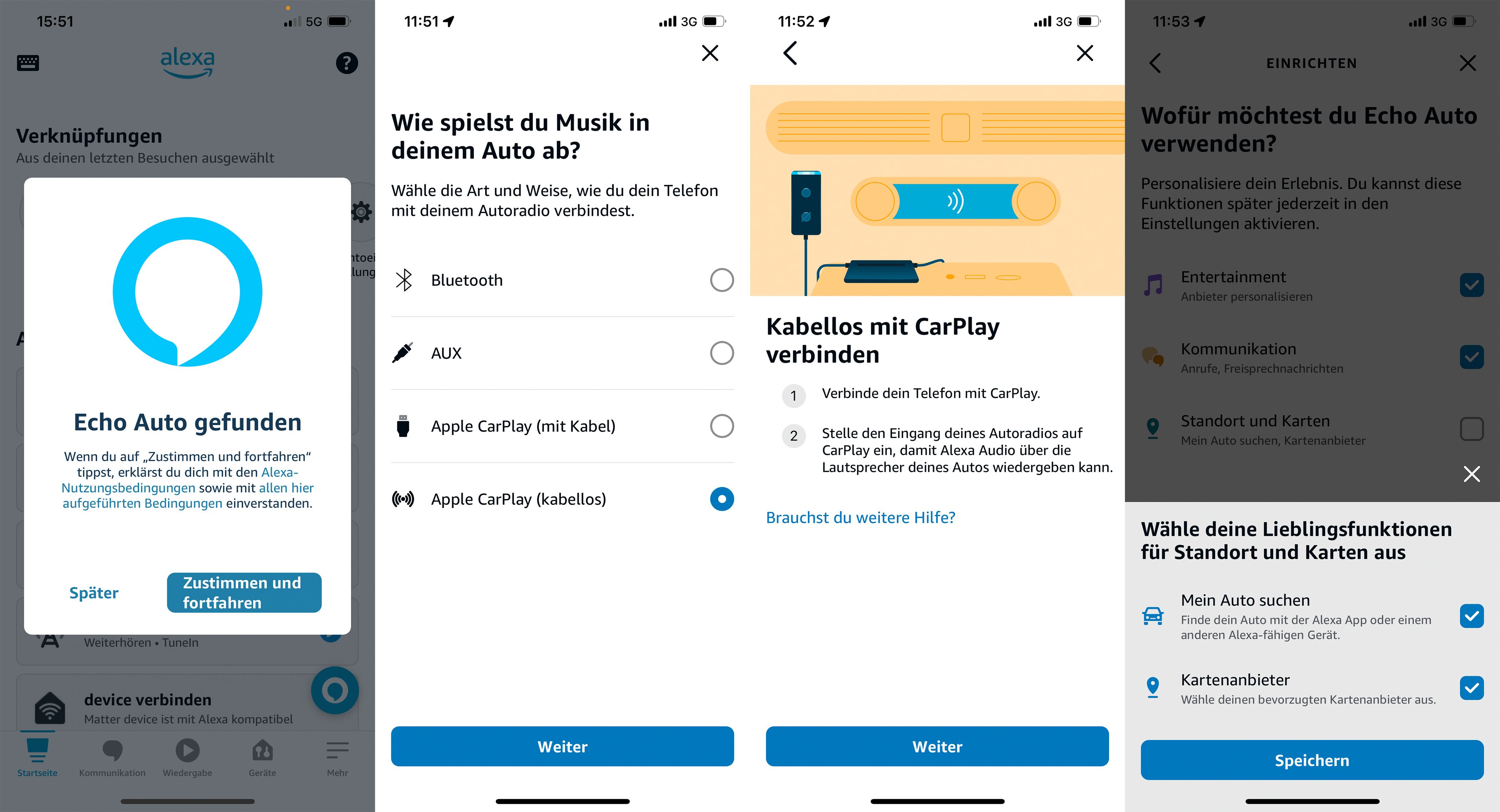 Sind die Voraussetzungen erfüllt, reichen für das Setup wenige Handgriffe. Man versorgt den Echo Auto 2 mit Energie und öffnet die Alexa-App auf dem Smartphone. Die Software findet den Smart Speaker von allein und fordert per Schaltfläche zum Start des Einrichtungsvorgangs auf. Ein Druck auf die Aktionstaste des Echo Auto 2 macht ihn mit dem Smartphone bekannt. Anschließend wählt man den Verbindungsweg zu den Autolautsprechern. Außer Aux und Bluetooth stehen dafür Apple Carplay und Android Auto zur Auswahl. Letztere beiden Optionen tun aber auch nichts anderes, als Signale per Bluetooth durchzuschleusen. Im Test nutzen wir Apple CarPlay. Für die Routen-Navigation legt man fest, ob ein Alexa-Sprachbefehl Apple Karten oder Google Maps aufruft.