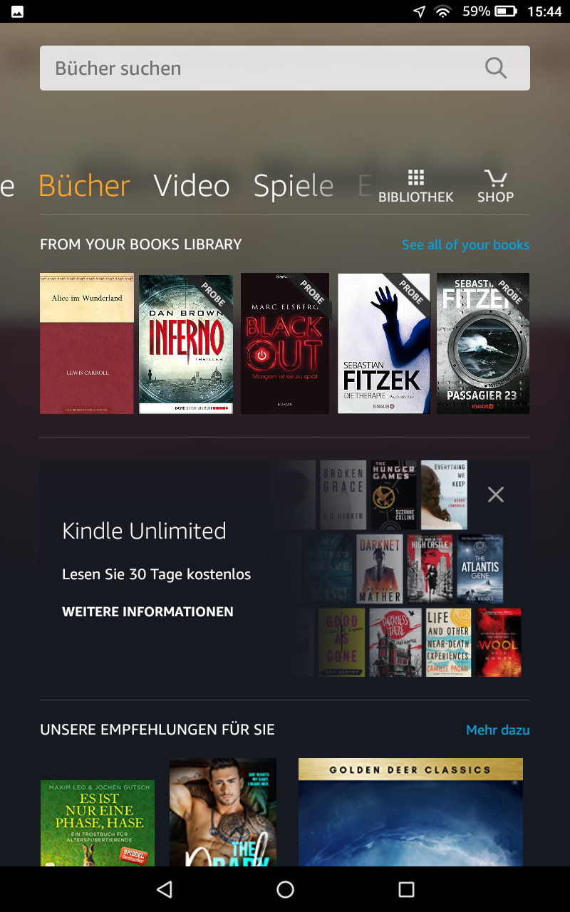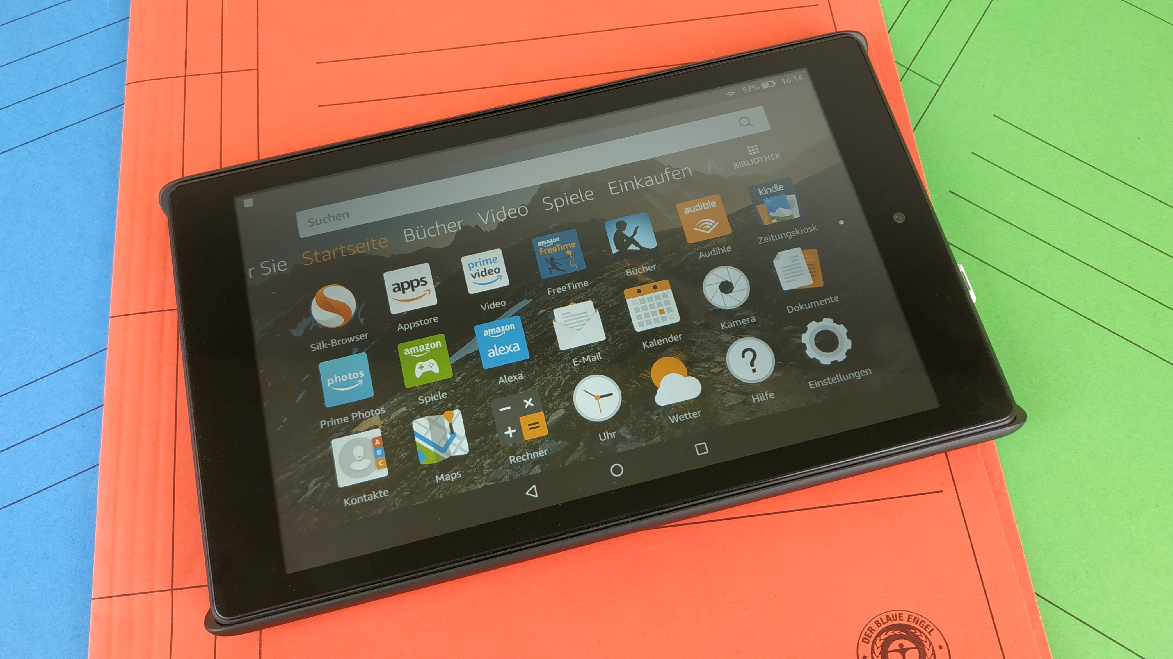 Auf 8 Zoll gibt es beim Fire HD 8 1280 × 800 Pixel mit einer Pixeldichte von 189 ppi. Dargestelltes ist scharf genug und die Blickwinkelstabilität ist zufriedenstellend. Was die Farbwiedergabe angeht, reißt uns das Gerät jedoch nicht vom Hocker: Diese kann man zwar nicht als schlecht bezeichnen, von satten Farben kann man jedoch auch nicht sprechen. Tendenziell erscheint uns die Abbildung von Inhalten des Panels etwas blass. Gemessen am geringen Preis kann man beim Fire HD 8 trotzdem von einem guten Bildschirm sprechen, zumal auch Fingereingaben gut erkannt und umgesetzt werden.