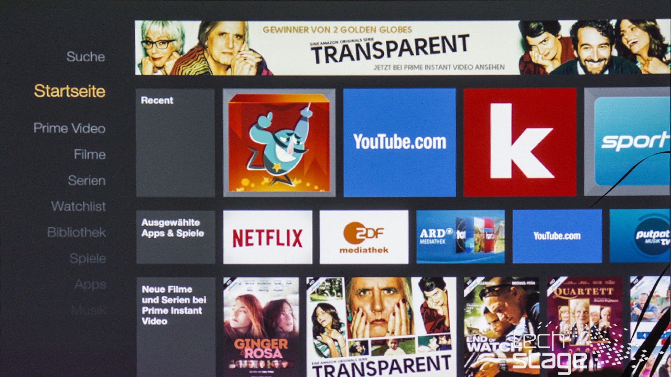 Der Fire TV Stick zielt natürlich stark auf Amazon-Prime-Kunden ab (Kosten: 49 Euro pro Jahr). Entsprechend prominent platziert der Hersteller hier auch seine eigenen Medieninhalte: Die ersten fünf Menüpunkte unterhalb von Suche und Home umfassen Amazon-Inhalte, aufgegliedert in Prime-Video, Filme, Serien sowie die Watchlist mit gemerkten und die Bibliothek mit gekauften beziehungsweise ausgeliehenen Inhalten.