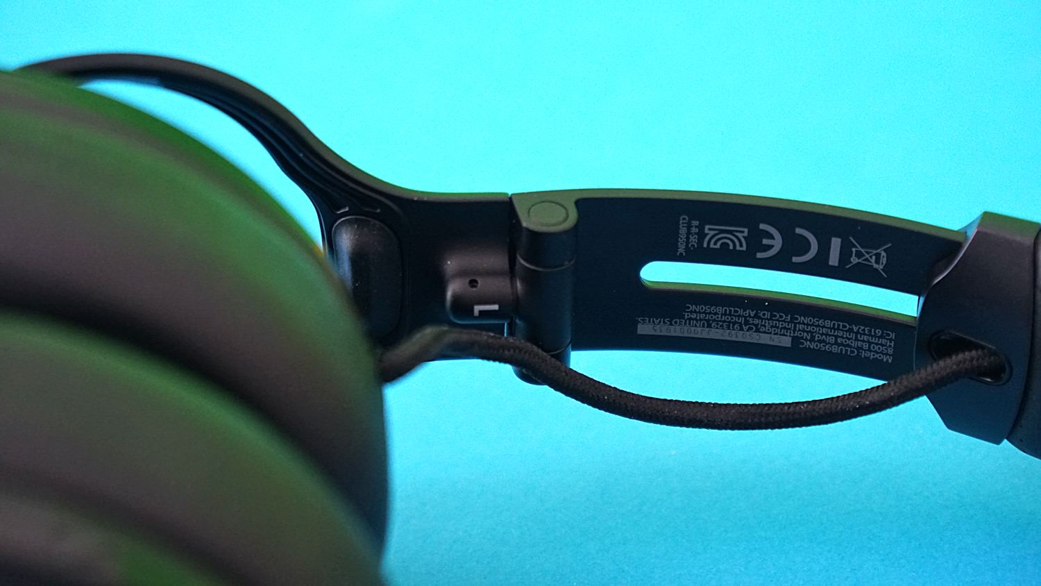 Der JBL Club 950 NC kann sich ganz schön klein machen: Nimmt man die relativ kleine Schutzhülle in die Hand, mag man kaum glauben, zu welcher Größe sich der Kopfhörer entfaltet. Der 372 g recht schwere Over-Ear-Kopfhörer liegt wuchtig in der Hand. Die Treiber und Batterien stecken im hochwertigen Kunststoff der Hörteile, die wiederum an einem Stahlbügel angebracht sind. Das flexible Scharnier erlaubt es, dass sich die Hörer leicht schwenken lassen, wodurch der JBL Club auf ganz unterschiedliche Kopfformen passt. Zieht man die Stahlhalterung aus dem Kopfbügel, hört man ein sattes Geräusch, was man bei Kopfhörern dieser Preisklasse eher selten wahrnehmen kann. Beim Verbindungskabel zwischen den beiden Hörteilen hat JBL aus der Not eine Tugend gemacht: Statt dieses möglichst zu verstecken – was bei dem Scharnier auch kaum möglich wäre – hat man auf ein Textilkabel gesetzt und es so wie ein Design-Element in Szene gesetzt. Die Verarbeitung ist sehr gut, alles fühlt sich wertig und vor allem stimmig an. Die dicken Polster aus Memory-Schaum sind mit weichem Kunstleder bezogen, zudem sind die Polster magnetisch befestigt und lassen sich so leicht austauschen. Auch der Kopfbügel ist gepolstert. Dadurch sitzt der JBL Club trotz des hohen Gewichts auch nach längerem Tragen sehr bequem.