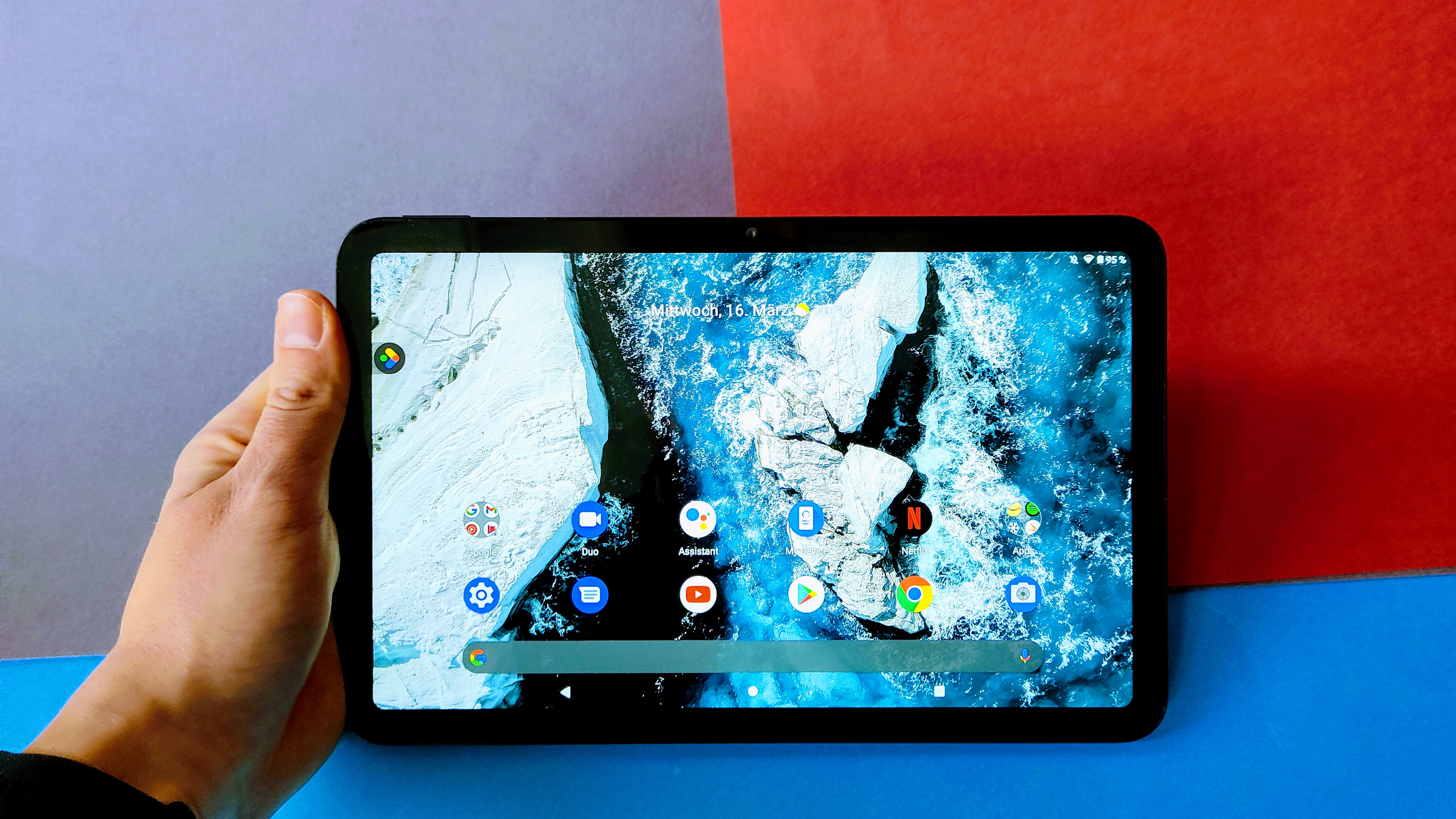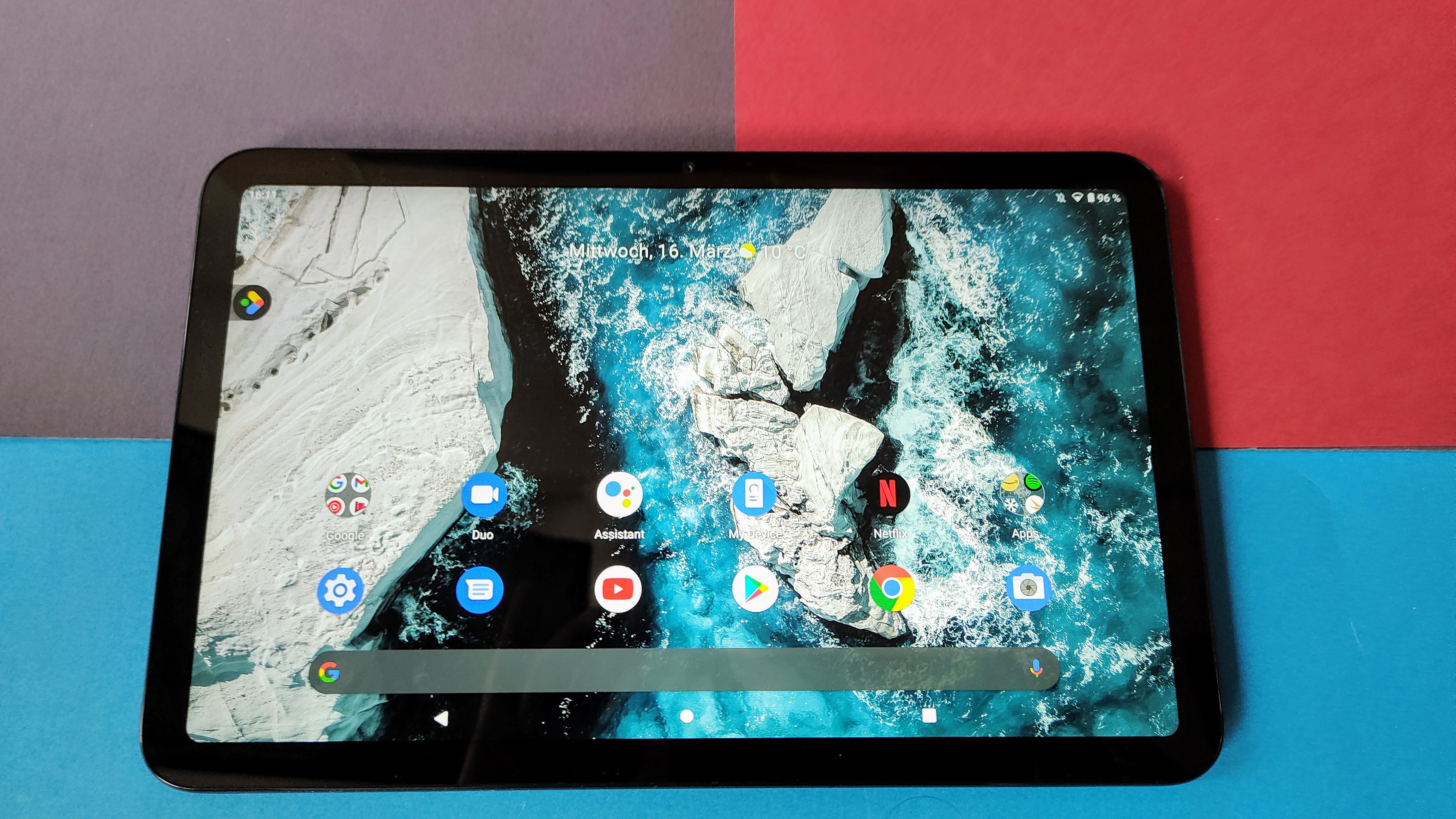 Das Display nutzt LCD-Technologie mit einem IPS-Panel und misst in der Diagonale 10,4 Zoll. Die Auflösung liegt bei 2000 x 1200 Pixel (Full HD). Nicht ganz typisch ist das Seitenverhältnisses des Bildschirms von 5:3 respektive 15:9. Üblich sind bei den meisten Android-Tablets eigentlich 16:9. Auf den ersten Blick fällt das aber kaum auf, lediglich bei der Wiedergabe von Filmen im Breitbildformat sind oben und unten dünne schwarze Balken zu erkennen.