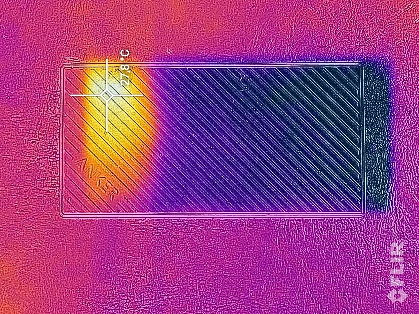 Im Ruhestand verhält sich die Powerbank unauffällig und hat Umgebungstemperatur. Beim Nichtladen erreicht der vordere Bereich des Gehäuses eine Temperatur von 22,5 °C. Beim Laden steigt die Temperatur auf 27,8 °C.