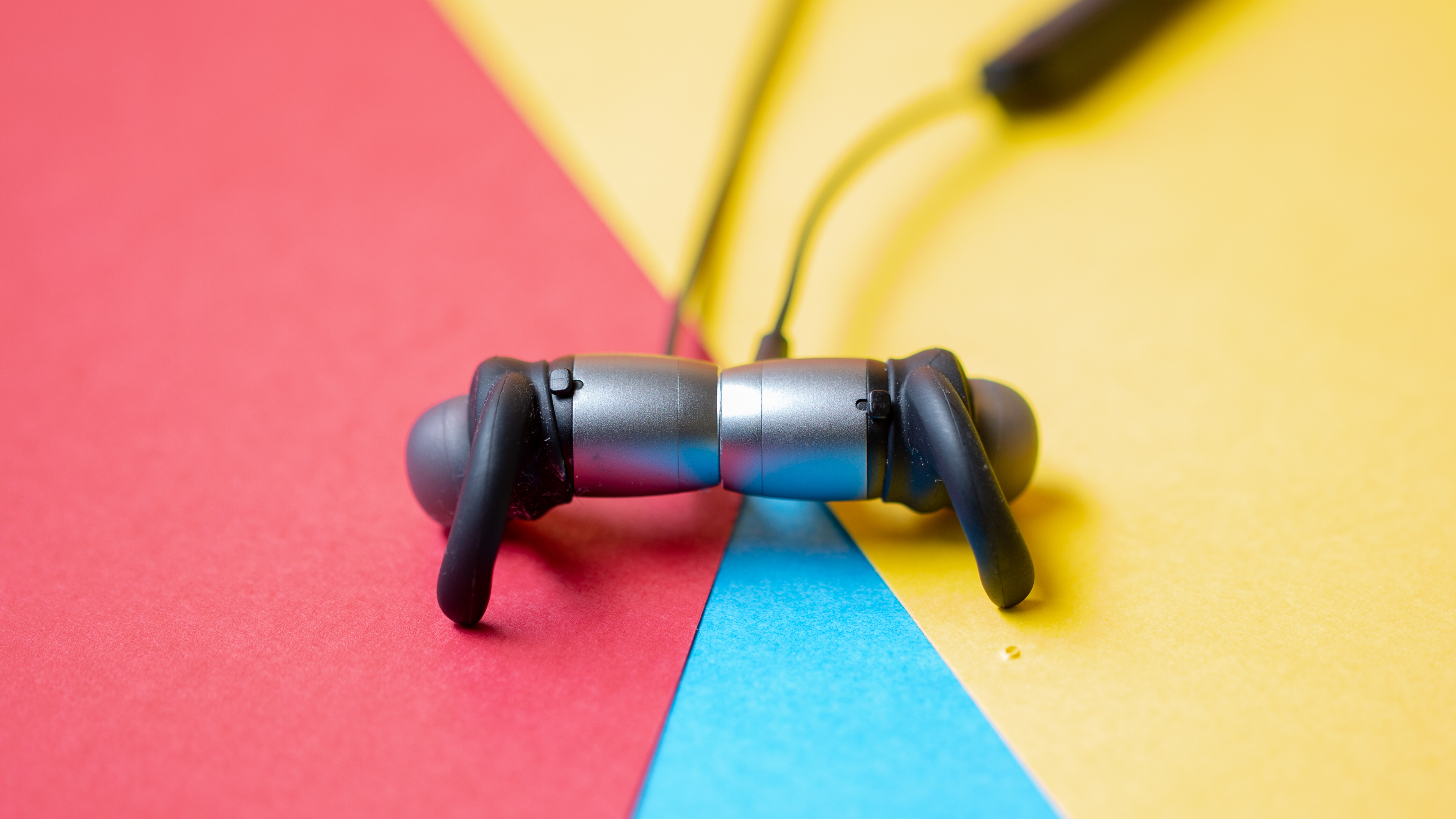 Die beiden Kopfhörer verbindet ein relativ dünnes Kabel, deutlich dünner als etwa bei den Bose Soundsport Wireless (Testbericht) . Daran befindet sich nicht nur eine Kabelfernbedienung samt Ladebuchse mit Micro-USB, sondern auch eine Einstellmöglichkeit, um das Kabel kürzer oder länger zu machen. Die flachen Seiten der Kopfhörer sind magnetisch und lassen sich so bequem vor dem Hals zusammenklippen. Sehr praktisch, so baumeln sie bei Nichtnutzung nicht unnötig herum.