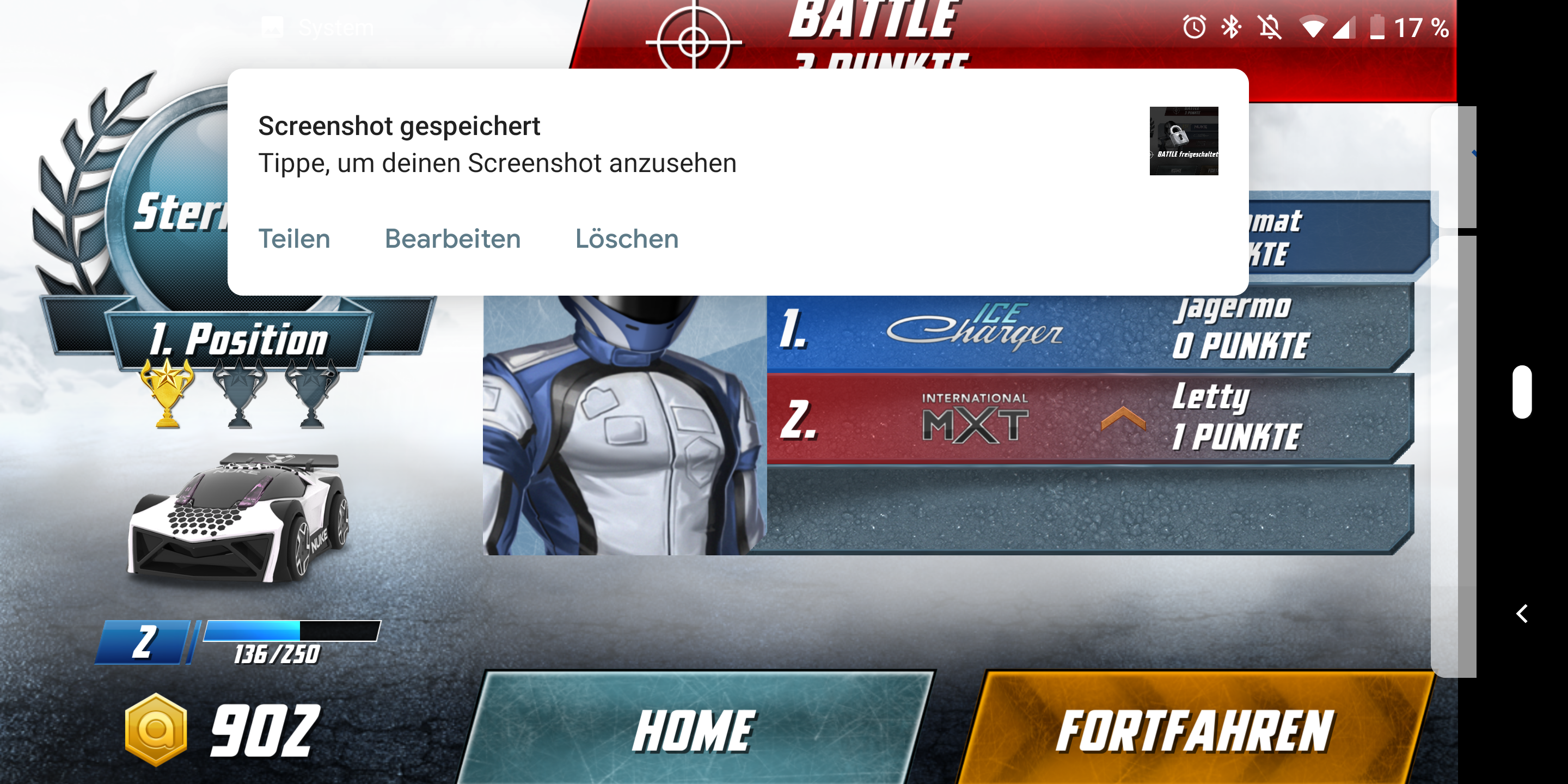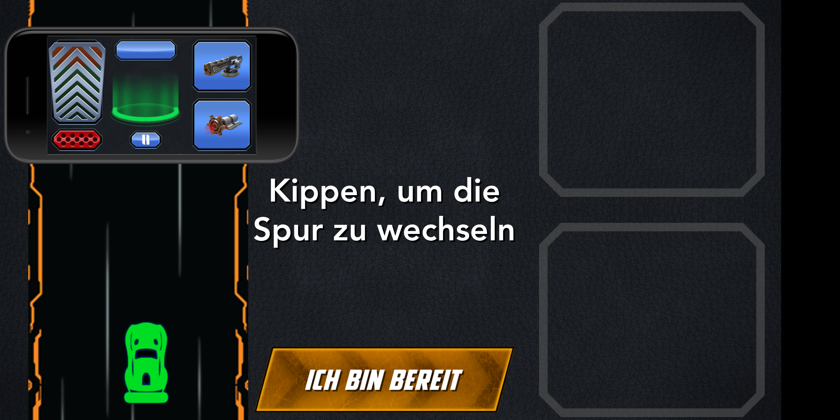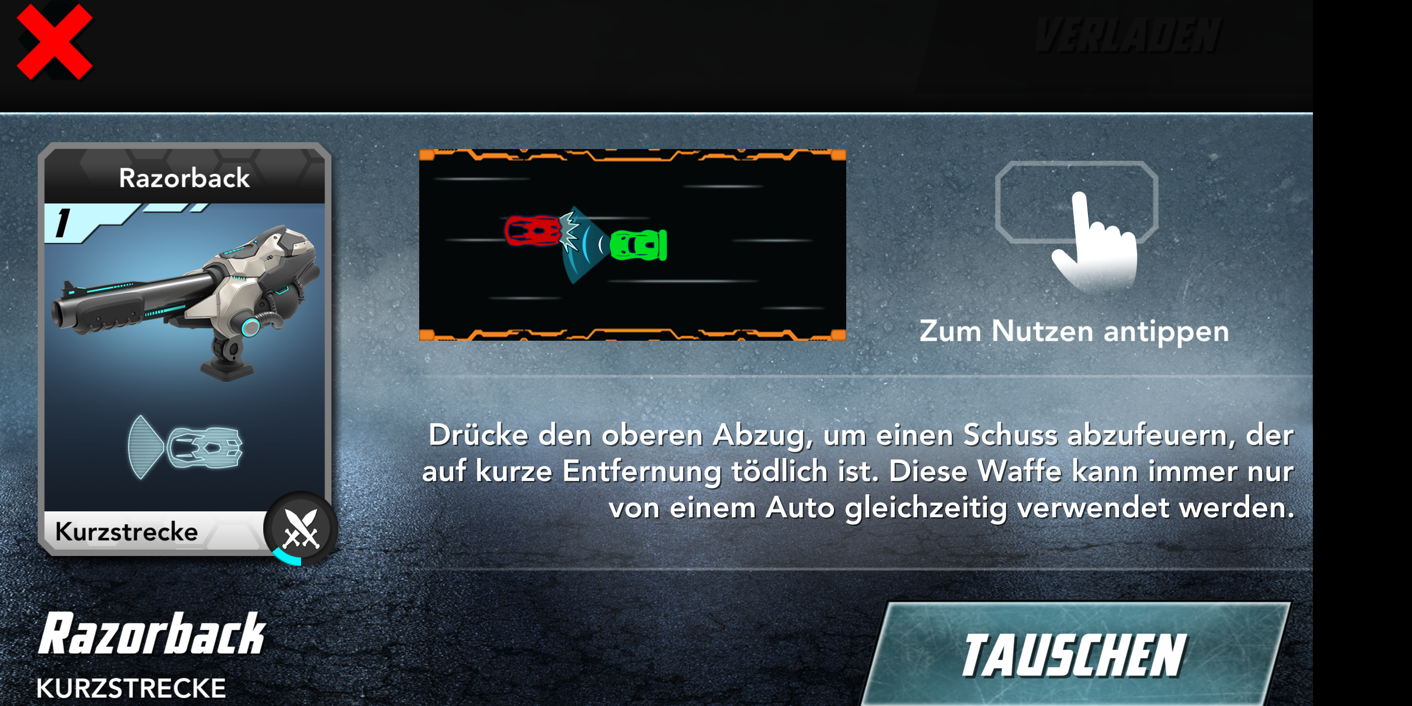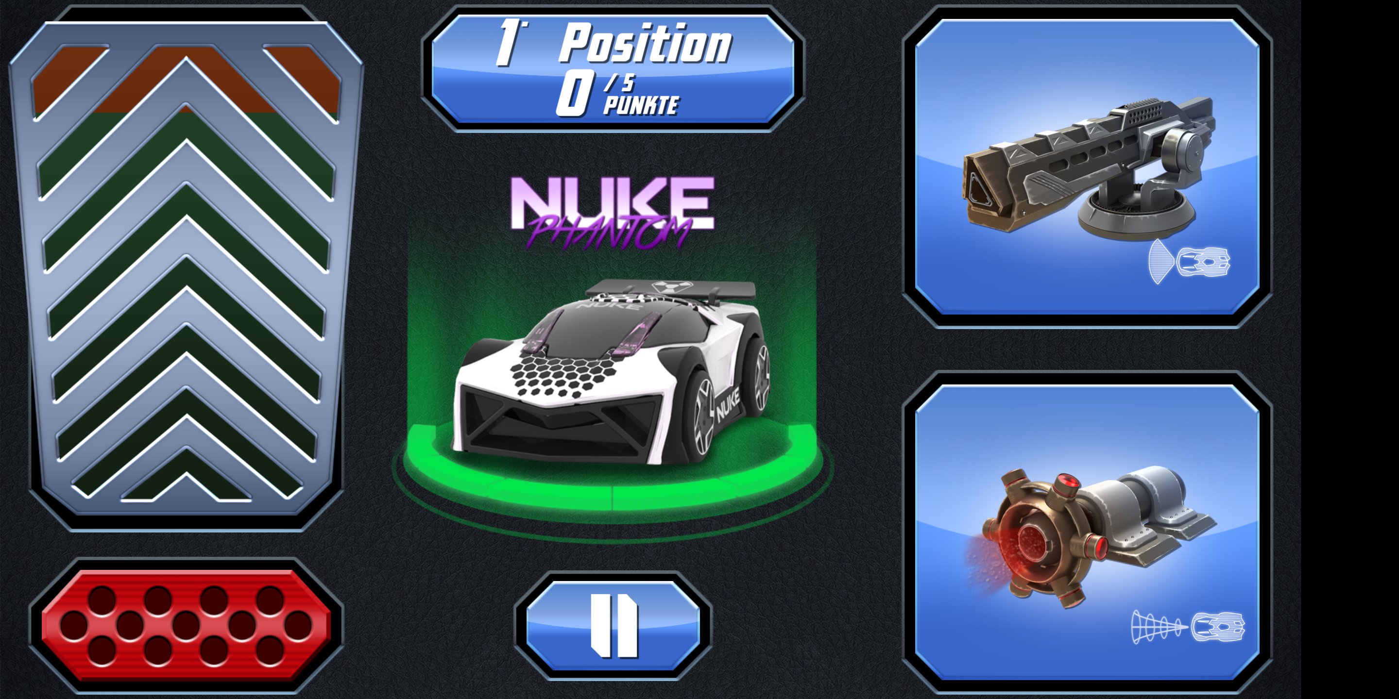 Im Rennen selbst beschleunigen und bremsen die Autos über eine Steuereinheit auf der linken Seite des Touchscreens. Auf der rechten Seite kommt das primäre und sekundäre Waffensystem zum Einsatz. Die Wagen halten auch bei voller Geschwindigkeit zuverlässig ihre Spur, gewechselt wird sie durch Neigen des Smartphones. Nettes Detail: Das Spiel bietet eine Pause-Option, in der die Fahrzeuge auf der Stelle stehen bleiben und nach dem Beenden der Pause weiter fahren als wäre nichts gewesen. Die App lief im Test flüssig und zuverlässig. In seltenen Fällen kam es jedoch in Multiplayer-Matches zu Verbindungsabbrüchen.