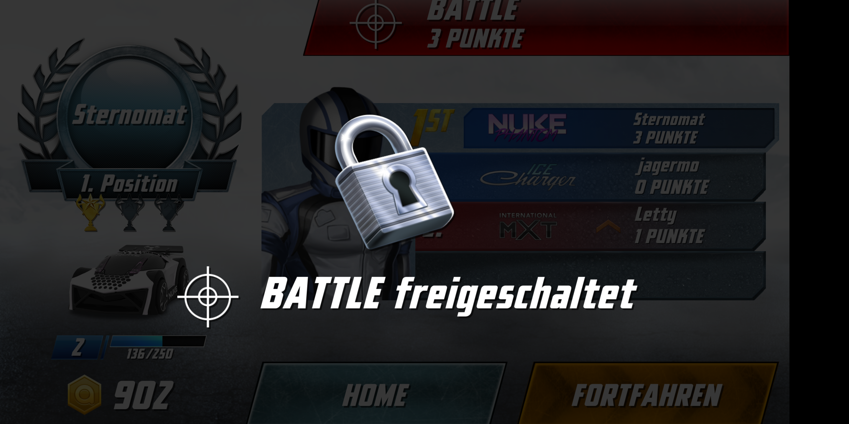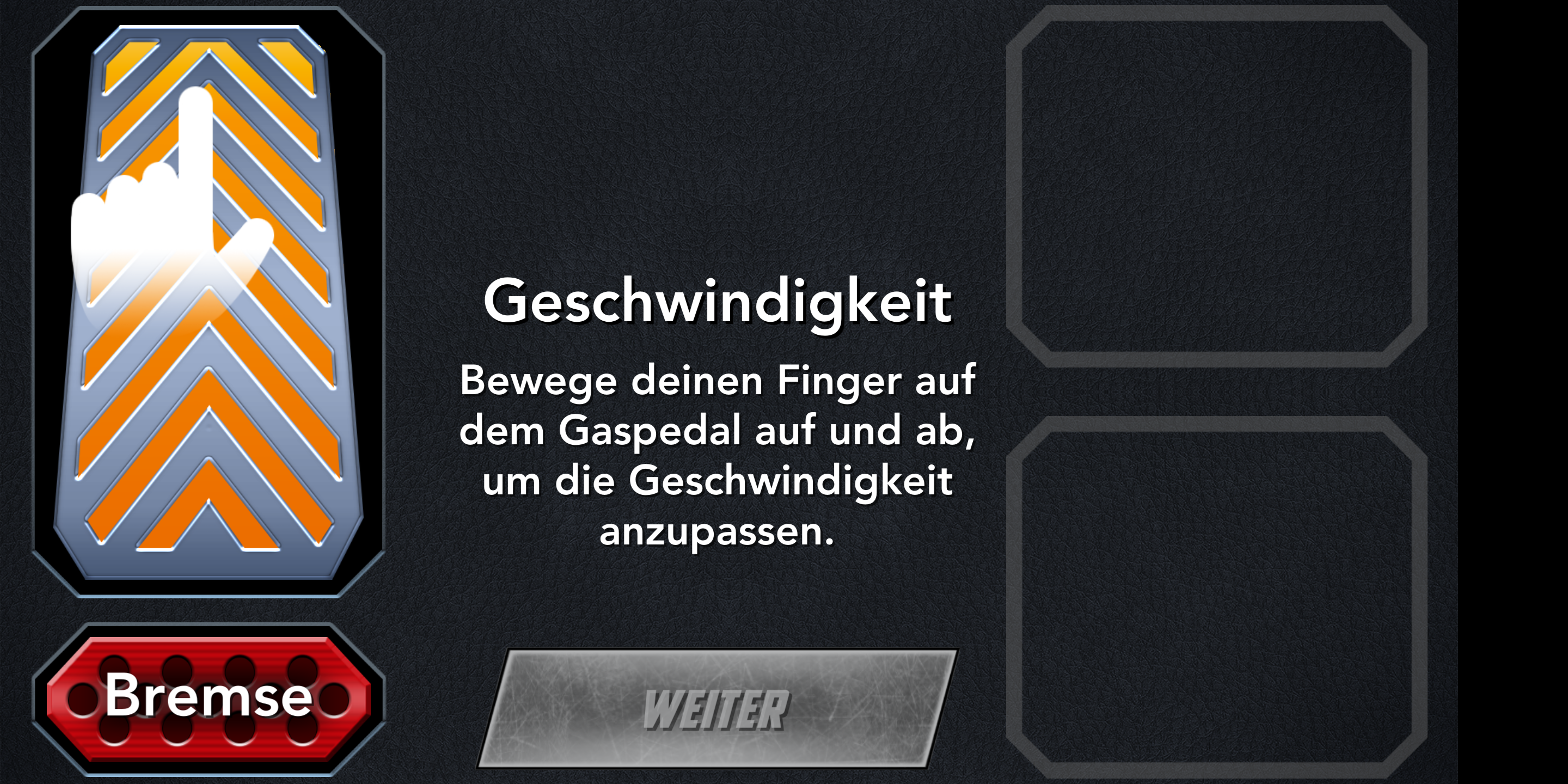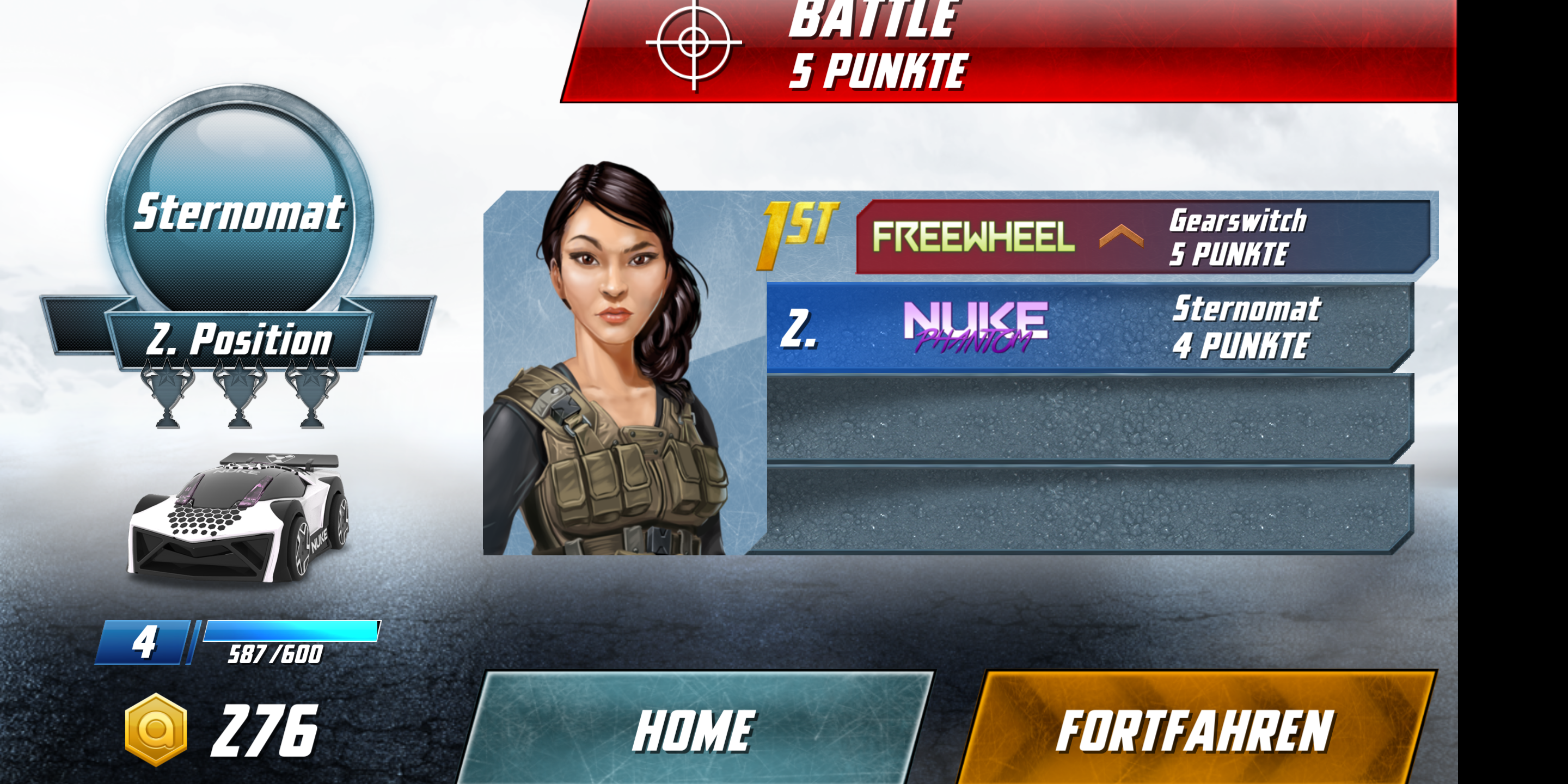 Im Rennen selbst beschleunigen und bremsen die Autos über eine Steuereinheit auf der linken Seite des Touchscreens. Auf der rechten Seite kommt das primäre und sekundäre Waffensystem zum Einsatz. Die Wagen halten auch bei voller Geschwindigkeit zuverlässig ihre Spur, gewechselt wird sie durch Neigen des Smartphones. Nettes Detail: Das Spiel bietet eine Pause-Option, in der die Fahrzeuge auf der Stelle stehen bleiben und nach dem Beenden der Pause weiter fahren als wäre nichts gewesen. Die App lief im Test flüssig und zuverlässig. In seltenen Fällen kam es jedoch in Multiplayer-Matches zu Verbindungsabbrüchen.