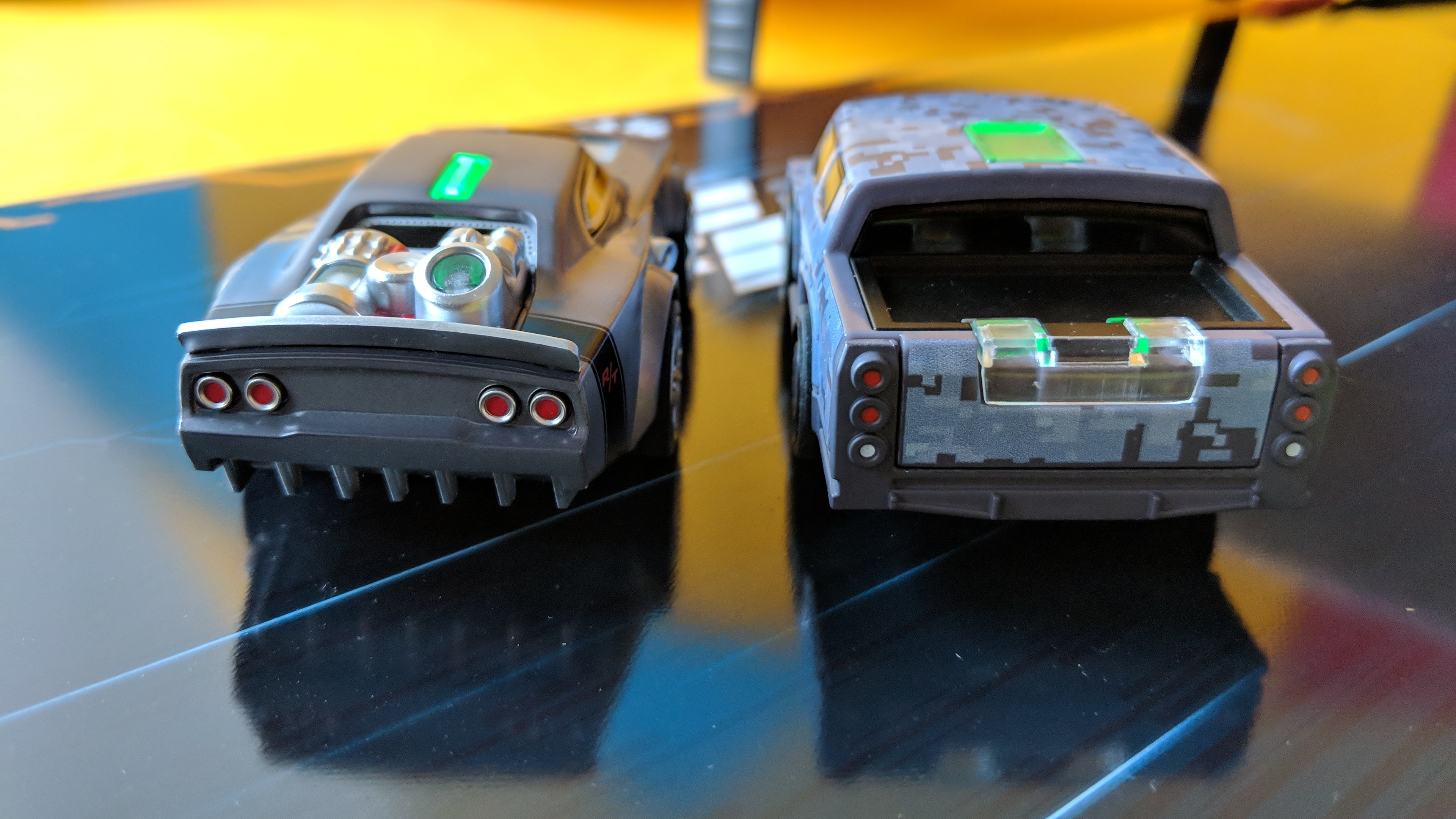 Die bis zu 10 cm langen Autos besitzen hinten, oben und vorne je eine geschickt integrierte LED, um den Zustand des Wagens, das Abfeuern von Waffen sowie den erhaltenen Schaden anzuzeigen. Die glatten Kunststoffräder an der Vorderachse sind starr und haben keinerlei Grip. Die gummierten Räder an der Hinterachse werden von zwei separaten Motoren angesteuert. Eine Akkuladung reicht für etwa 20 Minuten Fahrt, auf der Ladestation ist er in etwa zehn Minuten wieder voll.