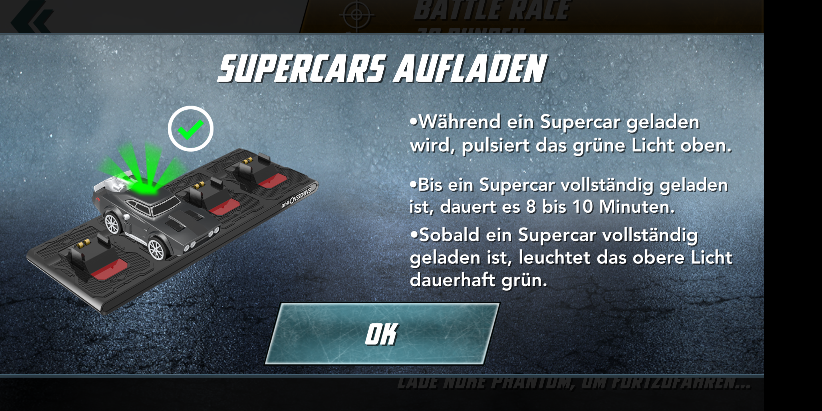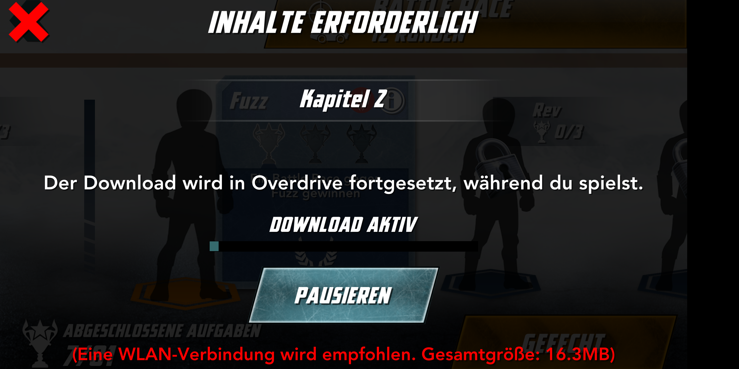 Um in der Praxis zu prüfen, wie Overdrive im Worst Case reagiert, haben wir die App im Offline-Modus gestartet. Weder WLAN noch mobiles Internet war verfügbar. Für den Spielfluss war das kein Problem, im Einzelspieler-Modus konnten wir sowohl die Kampagne wie auch freie Rennen spielen. Auch die Autos lassen sich Aufrüsten, die notwendige In-Game-Währung gibt es für Rennen. Eine Microtransaktion ist nicht vorgesehen. Mit aktiver Internetverbindung konnten wir das zweite Kapitel herunterladen, bei dem man nicht mehr gegen die Fast&Furious-Crew sondern die klassischen Anki-Gegner antritt. Auch diese Aufgaben ließen sich offline spielen.