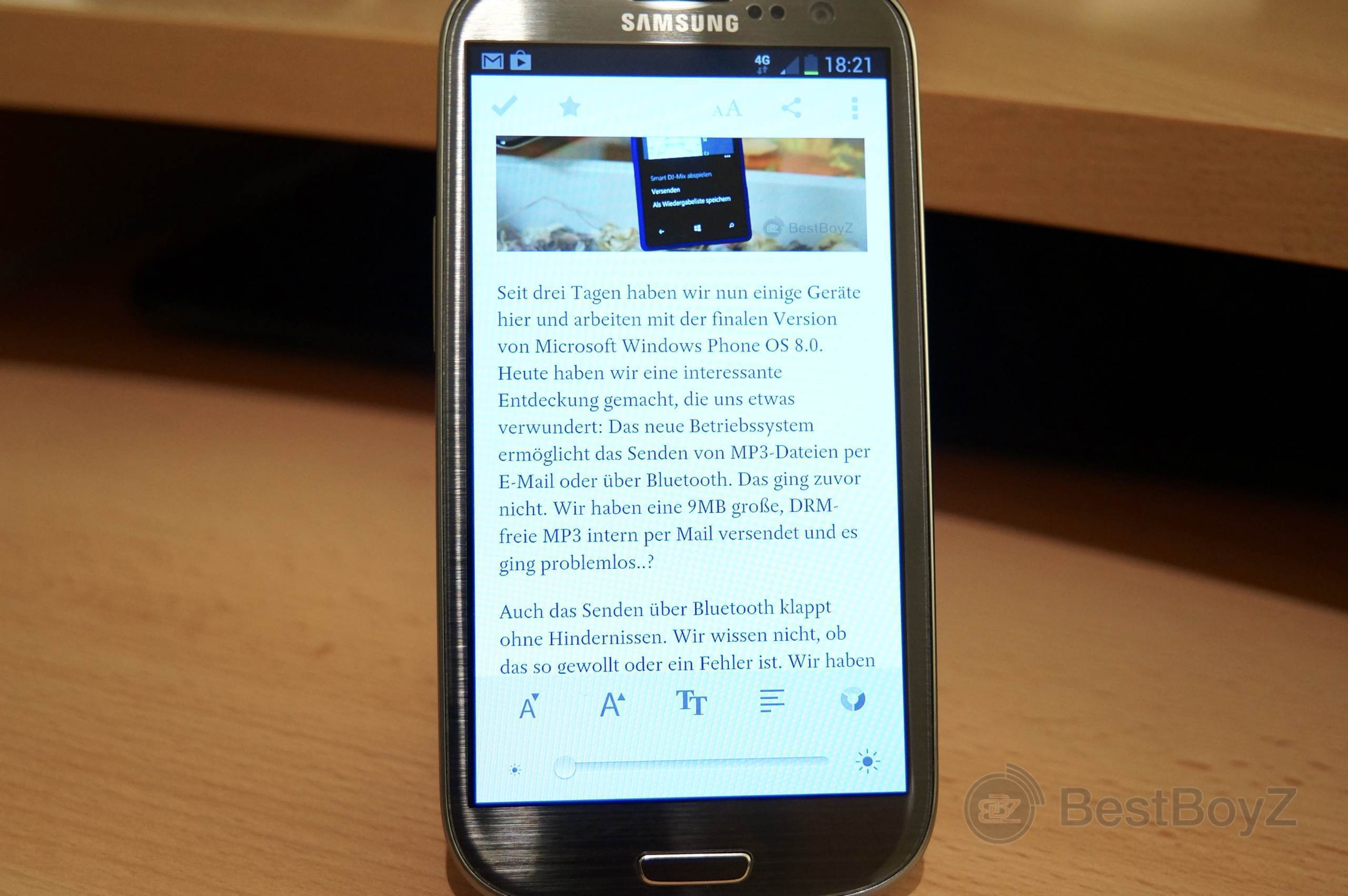 Navigiert Ihr nun in die Applikation zurück, seht Ihr auf dem Homescreen statt der „Save from your...“-Reiter nun Eure gespeicherten und chronologisch sortierten Inhalte. Wählt Ihr eines jener aus, so wird Euch der Text- sowie Bildcontent als offline Variante eingeblendet. Du brauchst also nur dann eine Internetverbindung, wenn Du den Inhalt speichern möchtest. Ist er schon gespeichert, so kannst Du Dir den Inhalt stets ohne das www anschauen. Oben in der Leiste lassen sich noch einige Parameter justieren: Die beiden nebeneinander und zentral positionierten Buttons ermöglichen die Wahl zwischen Web- sowie offline-Version. Weiter rechts kann der Anwender den Text aktualisieren und auch formatieren: Wer also einen serifenlosen oder größeren Text besser lesen kann, kann dies so einstellen. Außerdem kann man den Inhalt auch an dieser Stelle mit Lieblingsmenschen teilen.