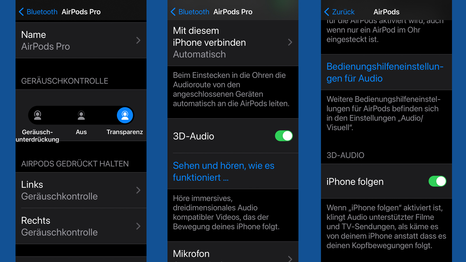 Es gibt keine dezidierte App für die Airpods Pro, allerdings können iOS-Nutzer ein paar Einstellung direkt über das Smartphone-Betriebssystem vornehmen. Dafür tippt man in den Bluetooth-Einstellungen unter den verbundenen Geräten bei den Airpods Pro auf das kleine eingekreiste „i“. Im darauffolgenden Fenster lässt sich der Name ändern, die Geräuschkontrolle deaktivieren und festlegen, welche ANC-Funktion beim längeren Druck des Buttons aufgerufen wird. Auch 3D-Audio lässt hierüber aktivieren.