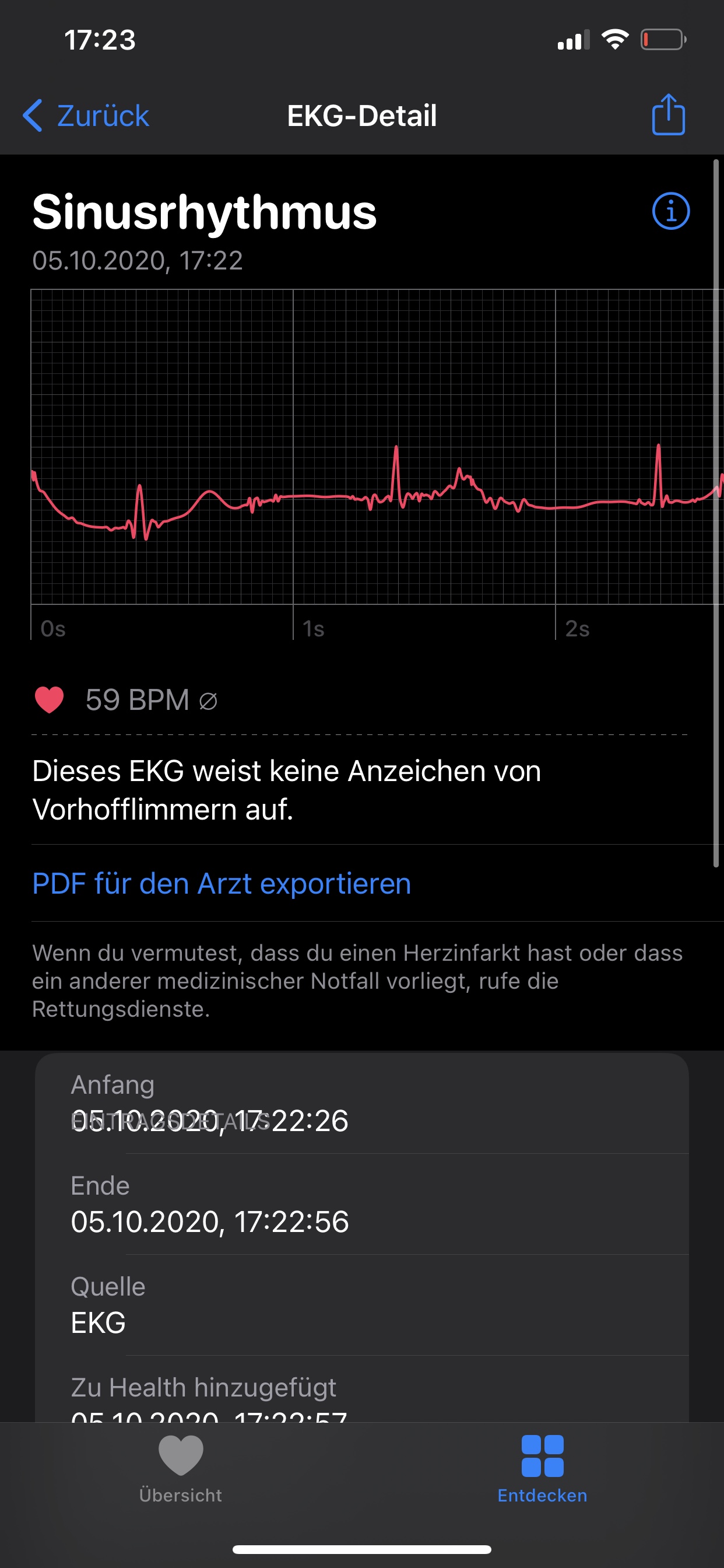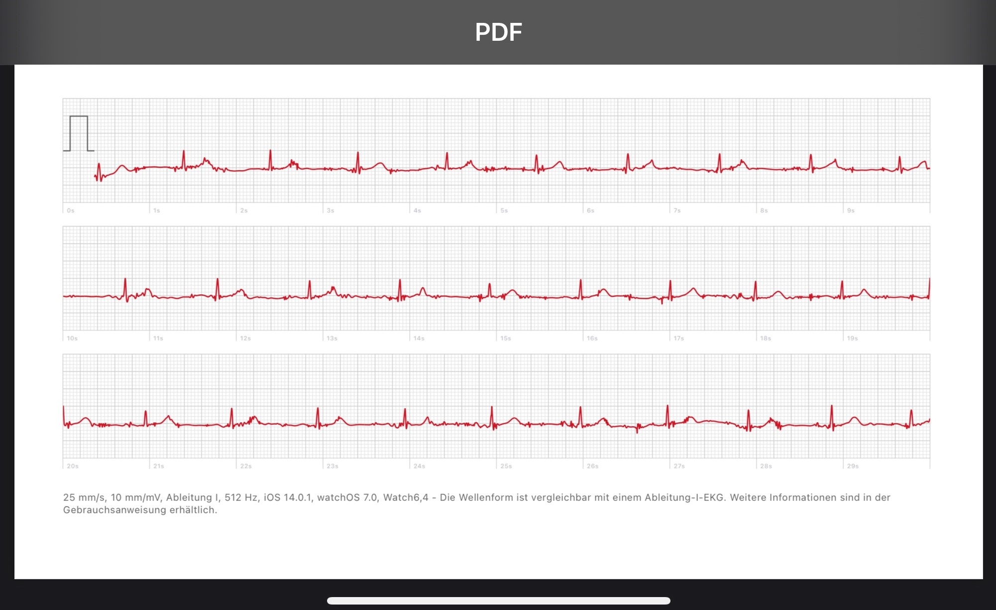 Geblieben ist die praktische EKG-Funktion. Zum Schreiben eines Elektrokardiogramms muss man einen Finger auf die Krone der Apple Watch legen, wodurch ein Stromkreis geschlossen wird. 30 Sekunden später erfährt man, ob Vorhofflimmern festgestellt wurde. Ein ausführliches Ergebnis steht in der EKG-App zur Verfügung und kann als PDF heruntergeladen sowie mit zum Arzt genommen werden. Auch hier ersetzt die clevere Uhr keine professionelle Untersuchung.