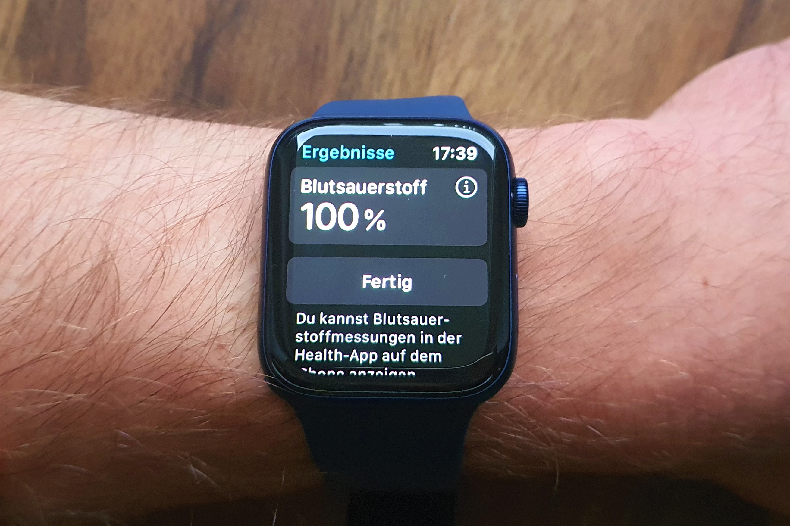 Bei der Ausstattung hat die aktuelle Apple Watch gegenüber dem Vorgänger noch ein wenig draufgepackt. Eine der spannendsten Neuheiten ist der Blutsauerstoffsensor, der aus vier LED-Clustern und vier Photodioden in der Unterseite der Uhr besteht. Grüne, rote und infrarote LEDs leuchten in die Blutgefäße im Handgelenk, und Photodioden messen, wie viel Licht zurückgeworfen wird. Über spezielle Algorithmen und die Farbe des Blutes kann die Uhr über einen Blutsauerstoff-Sensor die O2-Sättigung messen. Dazu benötigt sie 15 Sekunden und zeigt das Ergebnis in der Blutsauerstoff-App an. Unsere Testwerte lagen zwischen 94 und 100 Prozent, was plausibel erscheint. Apple weist explizit darauf hin, dass der ermittelte Blutsauerstoffwert nicht für medizinische Zwecke bestimmt ist.