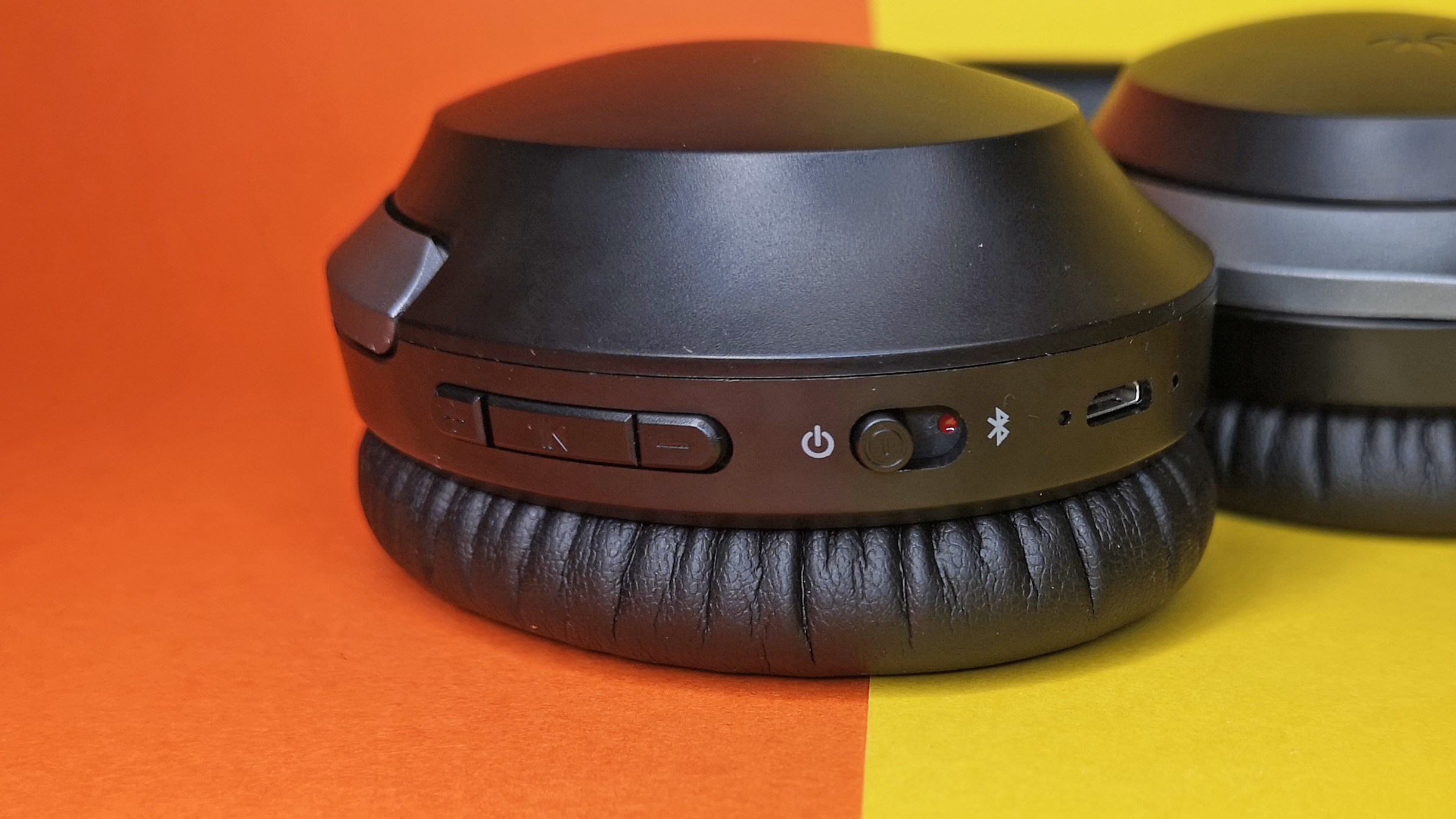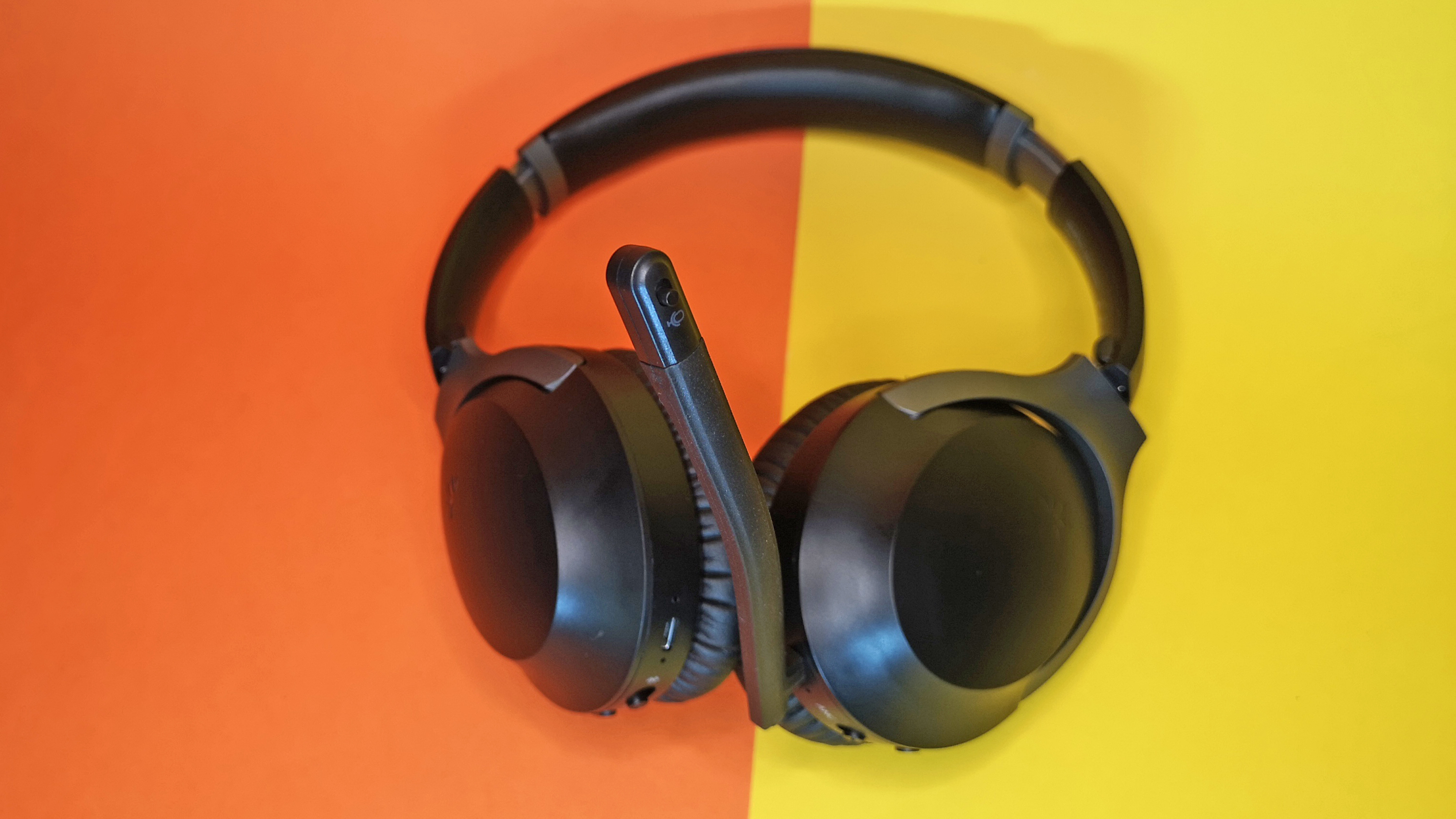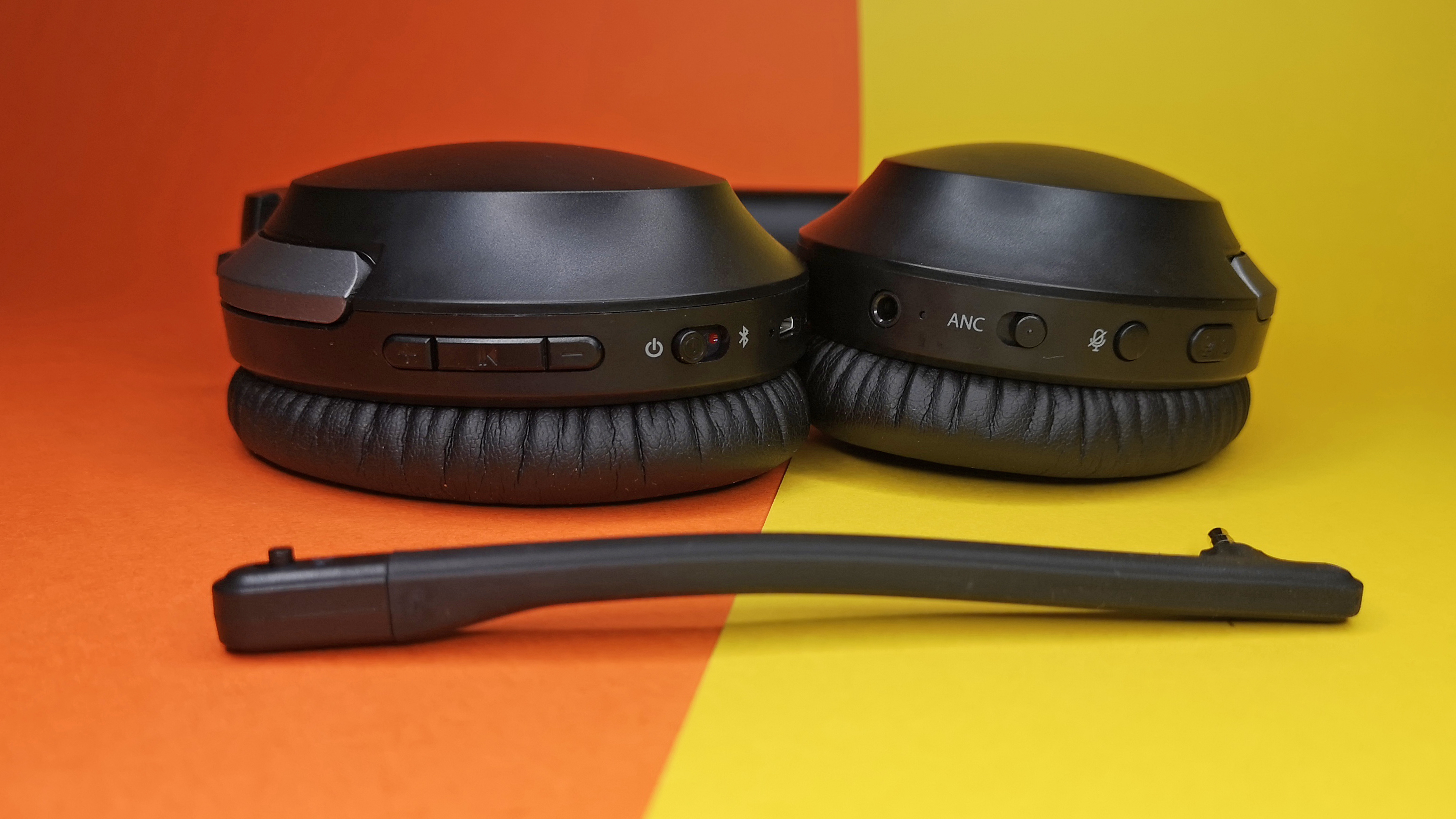 Unterhalb der linken Ohrmuschel sind eine Mute-Taste, eine Taste für Anrufe und Sprachassistenten, die Klinkenbuchse und ein Schiebeschalter für die Aktivierung der ANC-Funktion zu finden.