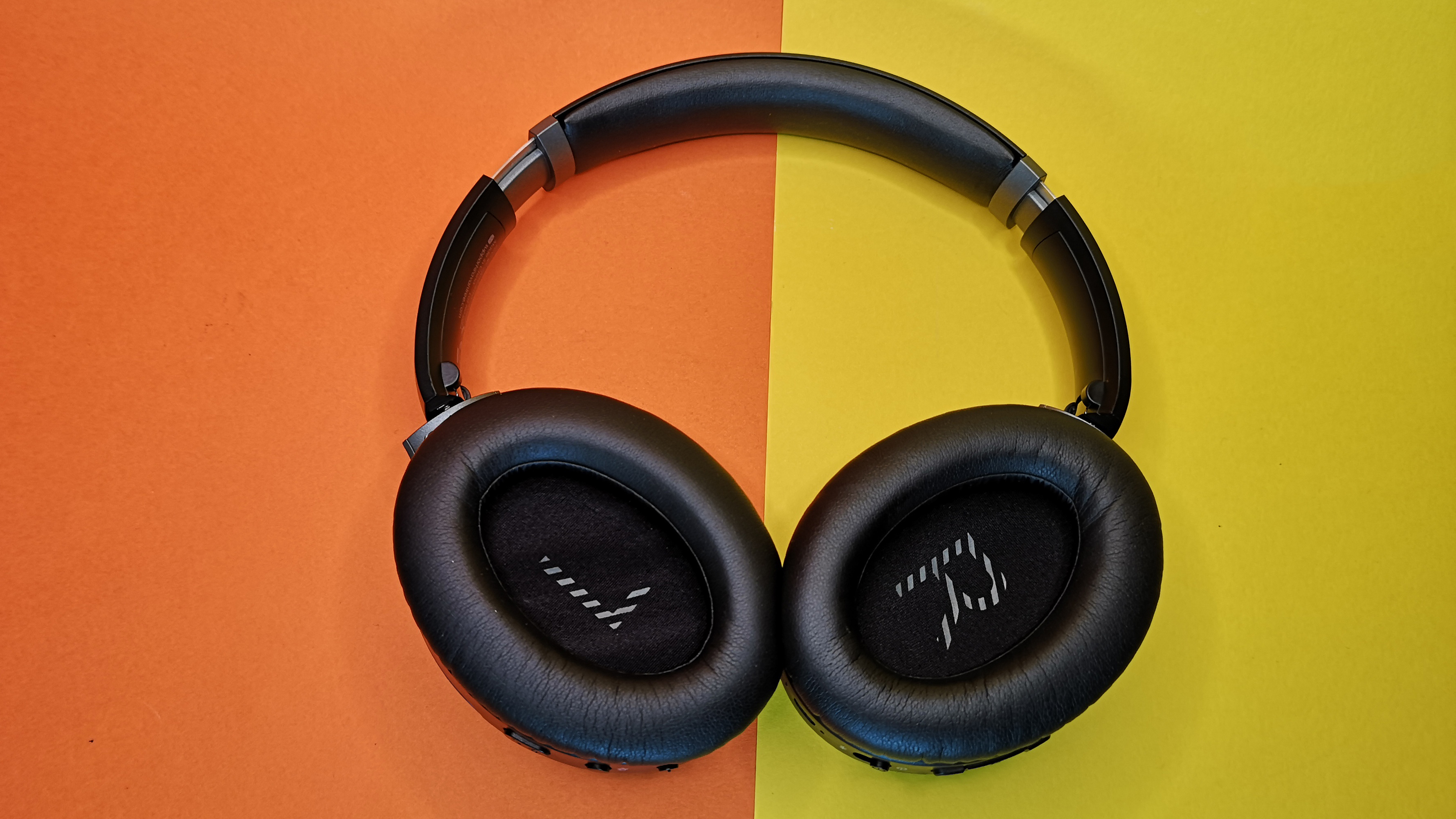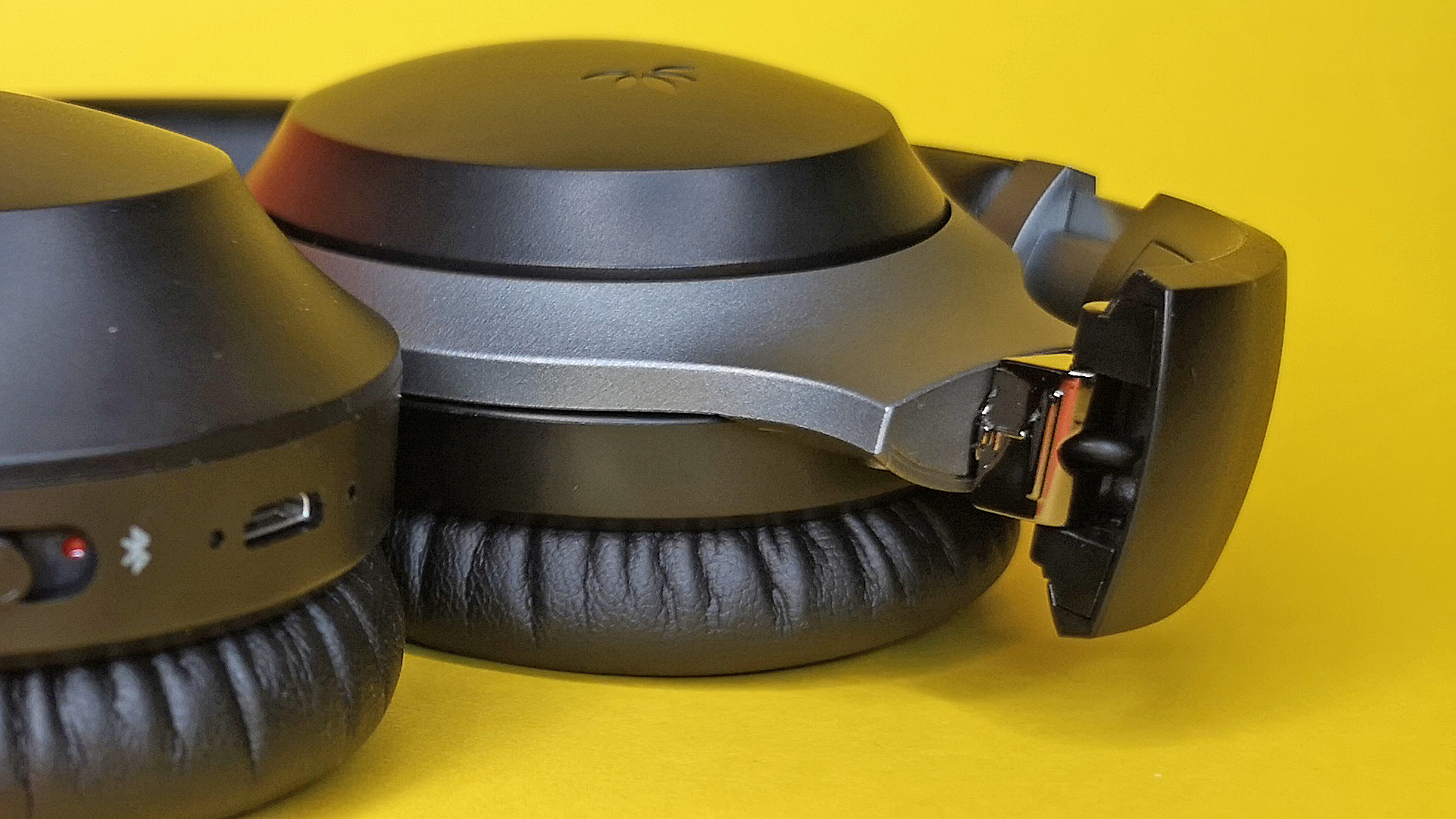 Insgesamt erinnert das Design des Kopfhörers an die WH-1000XM-Serie von Sony. Von einem Klon würden wir allerdings nicht sprechen, dafür sind die Unterschiede, wie die Hersteller-Logos auf den Seitenteilen, zu offensichtlich. Die Verarbeitung des Aria Pro ist insgesamt ausreichend, aber nicht hochwertig. So sitzt beispielsweise die Stoffbespannung der Lautsprecher nicht straff, was einen billigen Eindruck hinterlässt. Der matte Kunststoff hat zudem keine besonders hochwertige Haptik und Fingerabdrücke sind schnell sichtbar. Immerhin ist die Gesamtkonstruktion stabil und es klappert nichts.