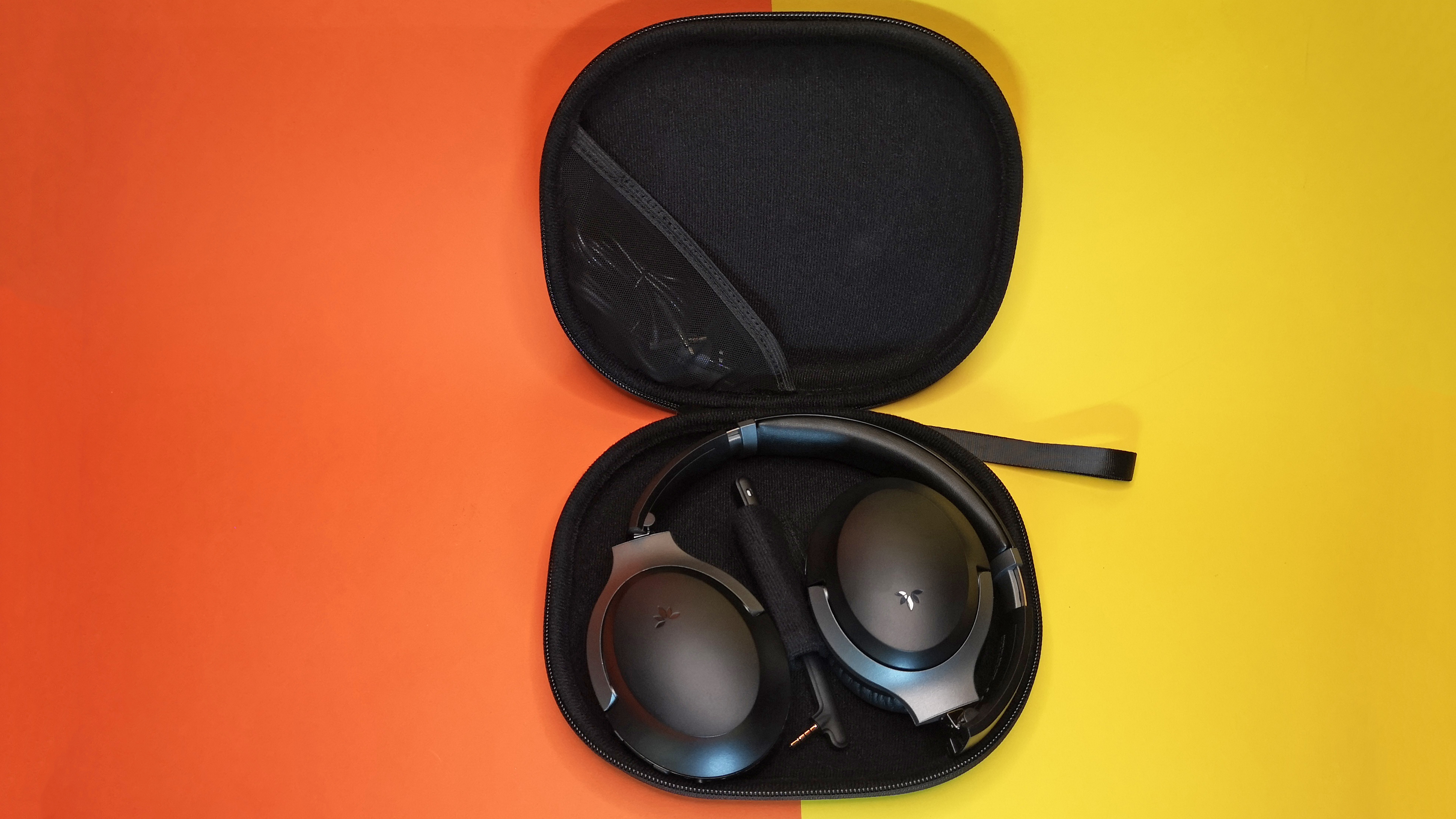 In der Verpackung des Aria Pro liegt neben der Anleitung die Transporttasche inklusive Kopfhörer und Zubehör. Die Kunstledertasche schützt den ANC-Kopfhörer beim Transport und bietet ausreichend Platz für das beigelegte Micro-USB-Kabel zum Aufladen, das Klinkenkabel und den abnehmbaren, flexiblen Mikrofonarm.