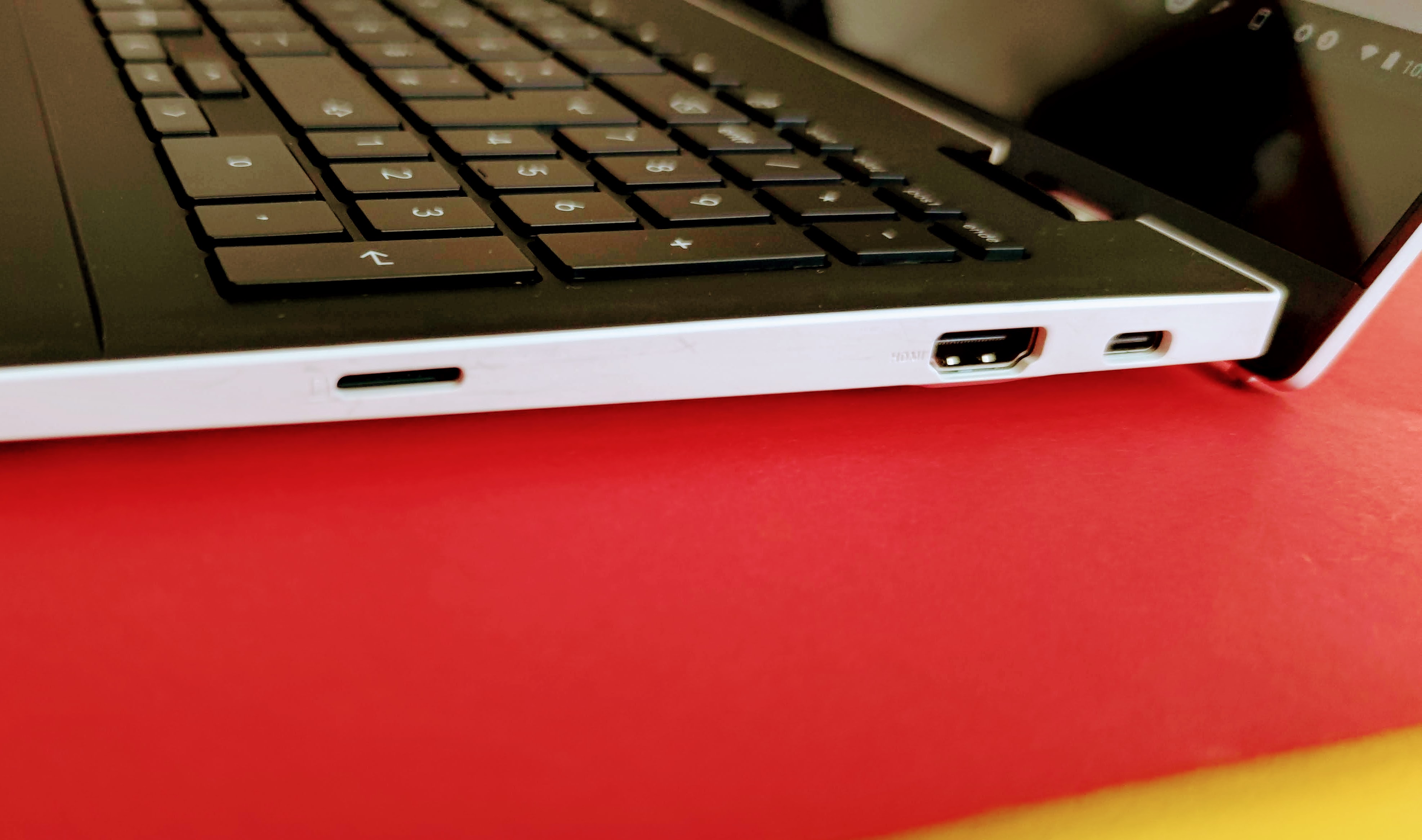 Der Arbeitsspeicher beim Testexemplar fällt mit 16 GByte RAM für ein Chromebook groß aus. Es gibt aber auch günstigere Varianten mit Core i3-1115G4 und i5-1135G7, die 8 GByte RAM nutzen. Der Arbeitsspeicher ist fest verlötet, eine nachträgliche Erweiterung ist also nicht möglich. Unser Testmodell bietet mit 512 GByte ausreichend viel Speicherplatz. Dabei handelt es sich um eine flotte NVMe-SSD. Das ist für ein Chromebook mehr als ausreichend. Über den integrierten Micro-SD-Kartenleser kann man den Speicherplatz auf Wunsch noch erweitern. Es gibt zudem günstigere Varianten mit 128 GByte und 256 GByte Speicher.