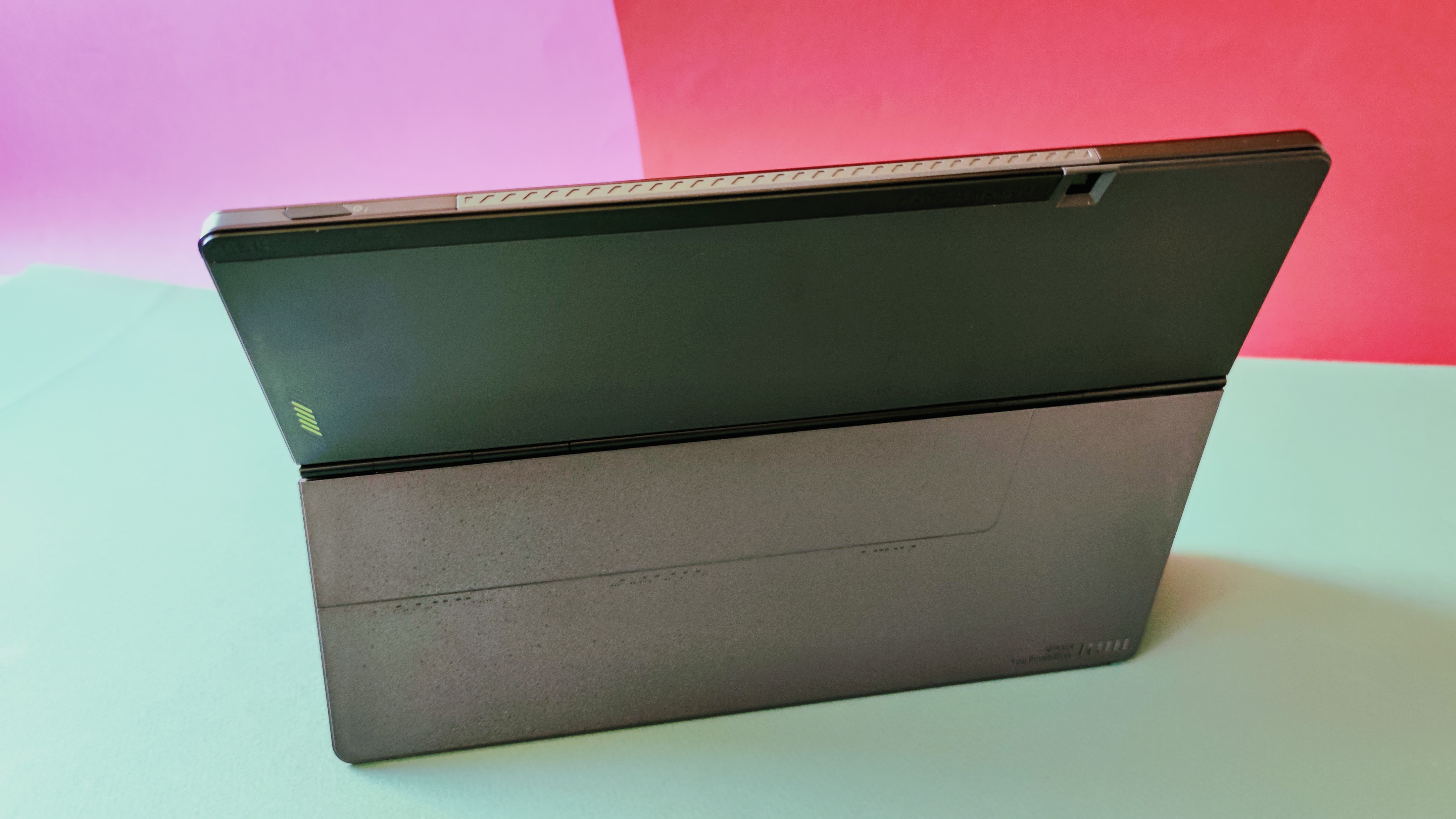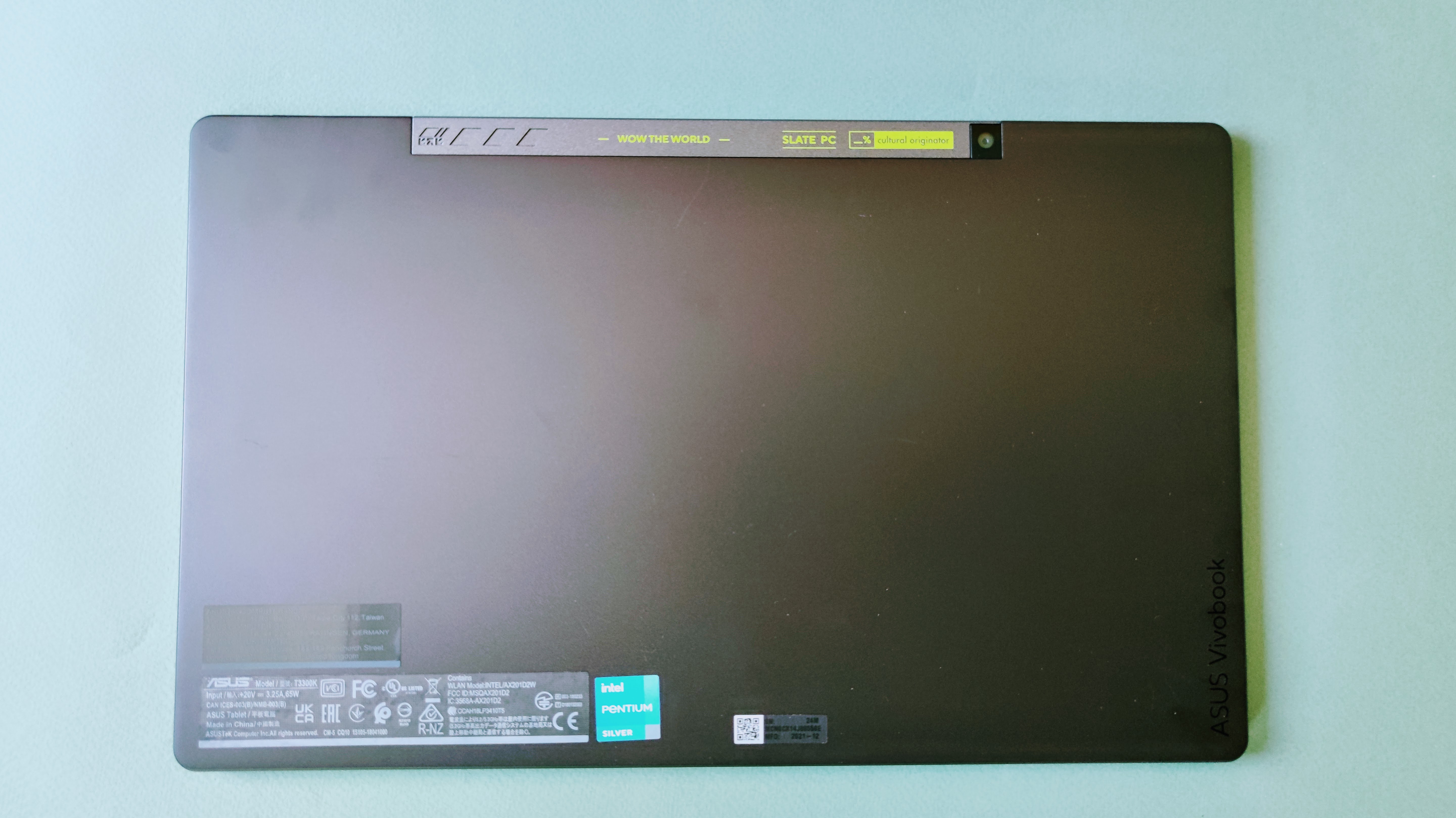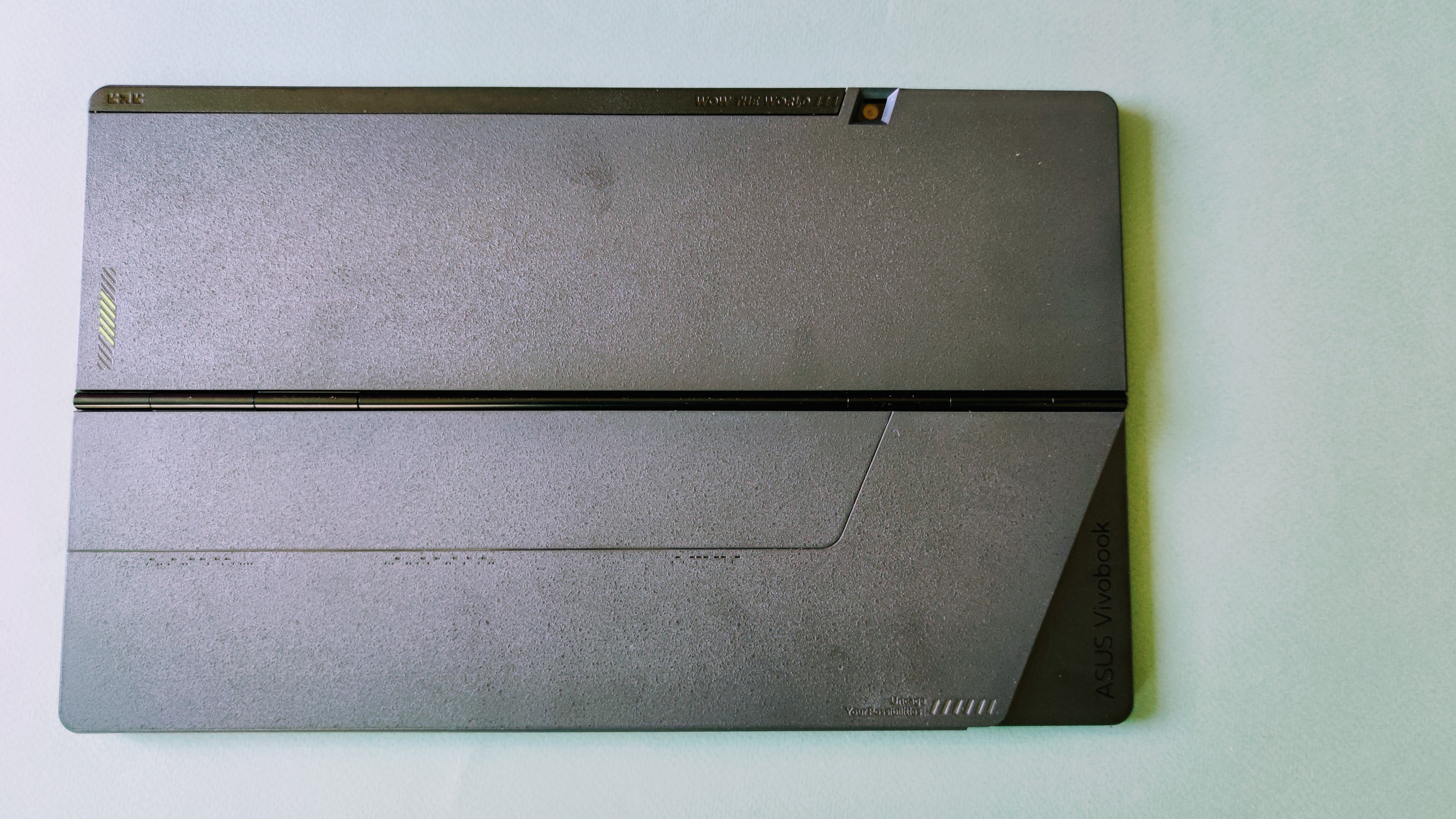 Optisch nimmt das Vivobook 13 Slate einige schicke und kantige Elemente auf, wie man sie von Laptops der Vivobook-Reihe her kennt. Dazu gehören feine Lüftungsschlitze seitlich im Rahmen. Markant ist zudem ein geriffeltes Element in Mittelgrau auf der Oberseite der Rückseite mit dem neongrünen Schriftzug „Wow the World“. Das verleiht dem Tablet insgesamt einen "frecheren" Charakter als man es von vergleichbaren Geräten gewohnt ist. Rechts davon befindet sich die eben aufliegende Hauptkamera. Die Webcam vorne ist im Displayrahmen eingebettet. Dieser wirkt ober- sowie unterhalb des Screens recht breit. Links und rechts fällt die Begrenzung ums Display hingegen deutlich schmaler aus.