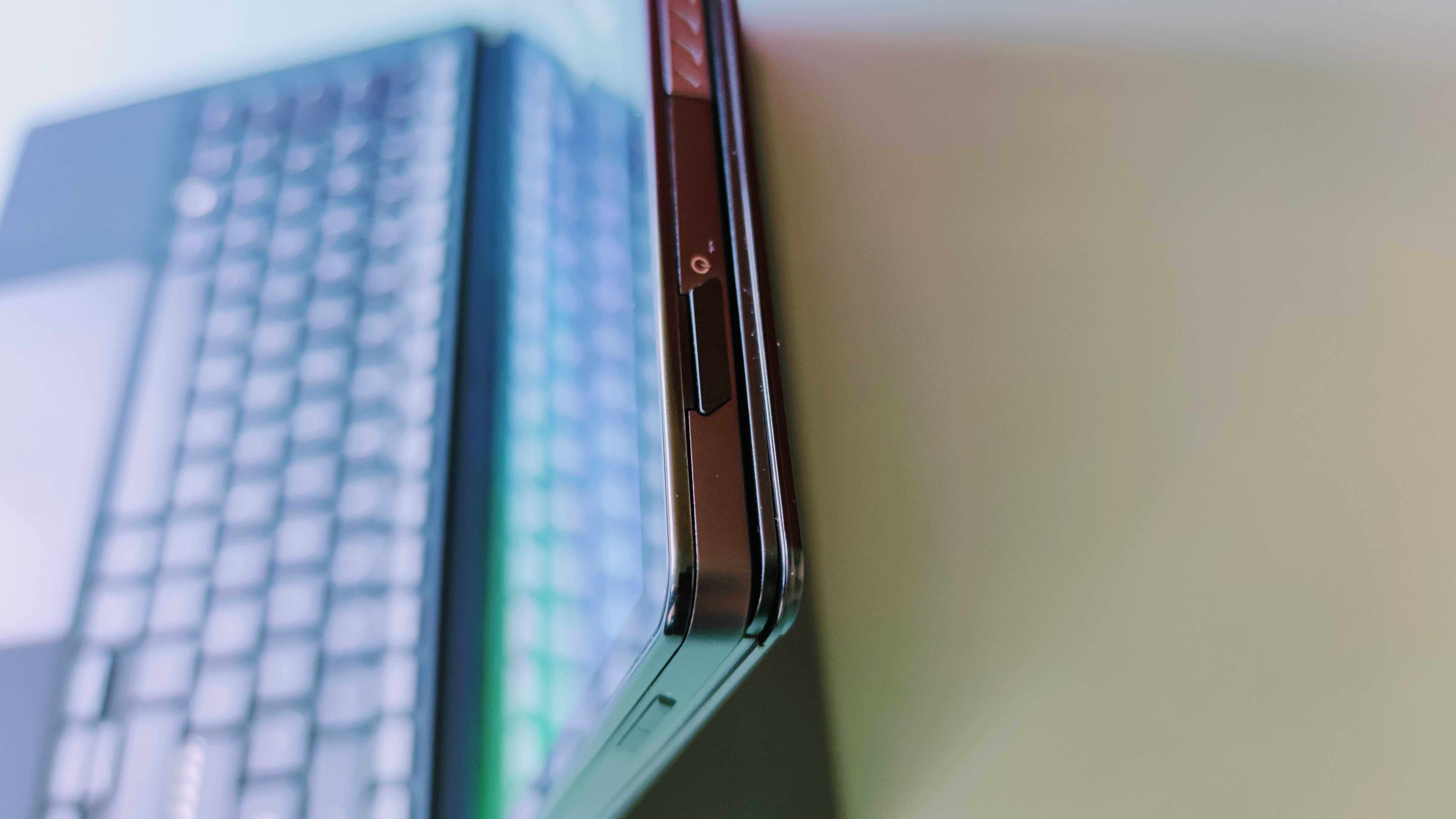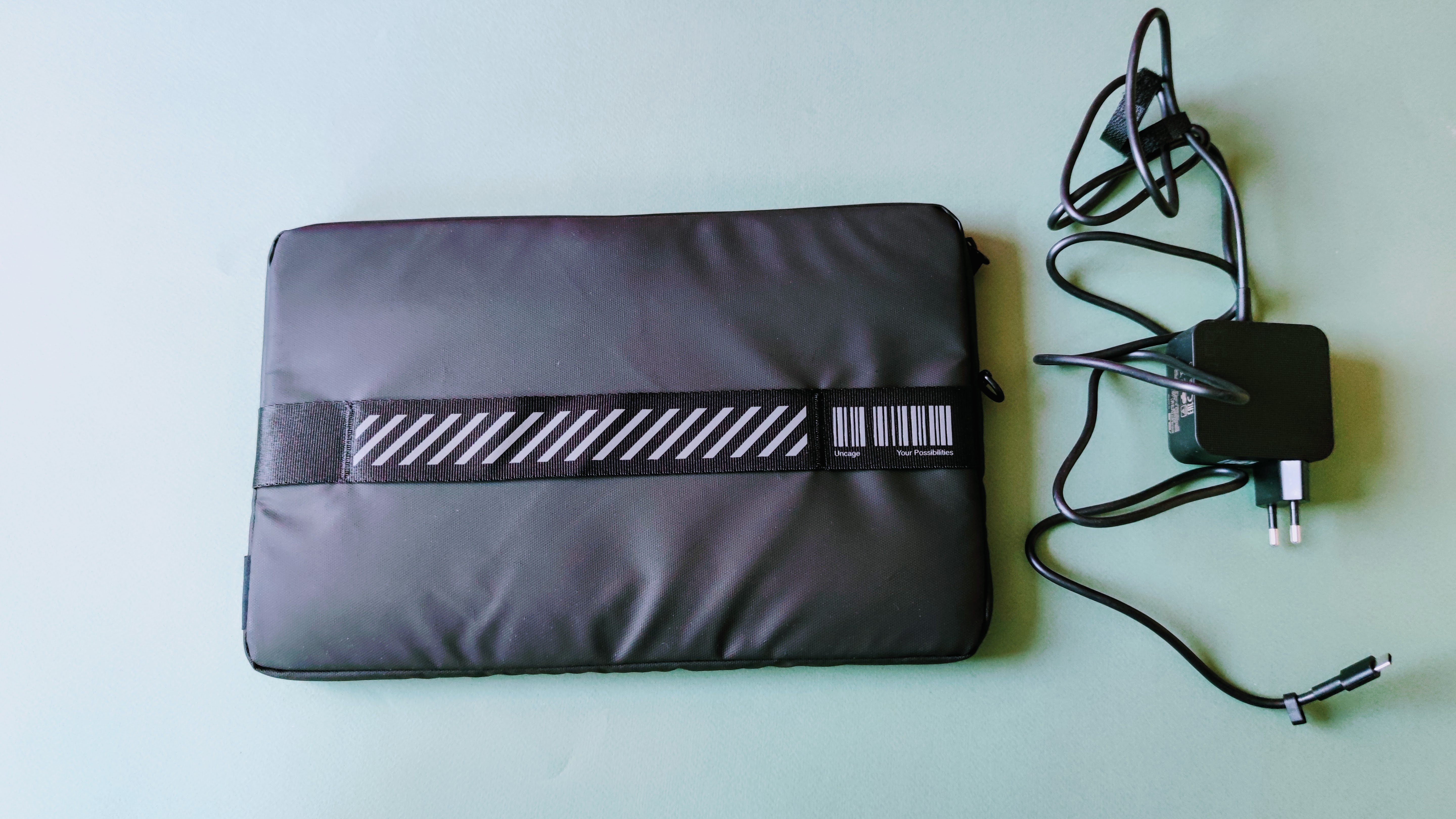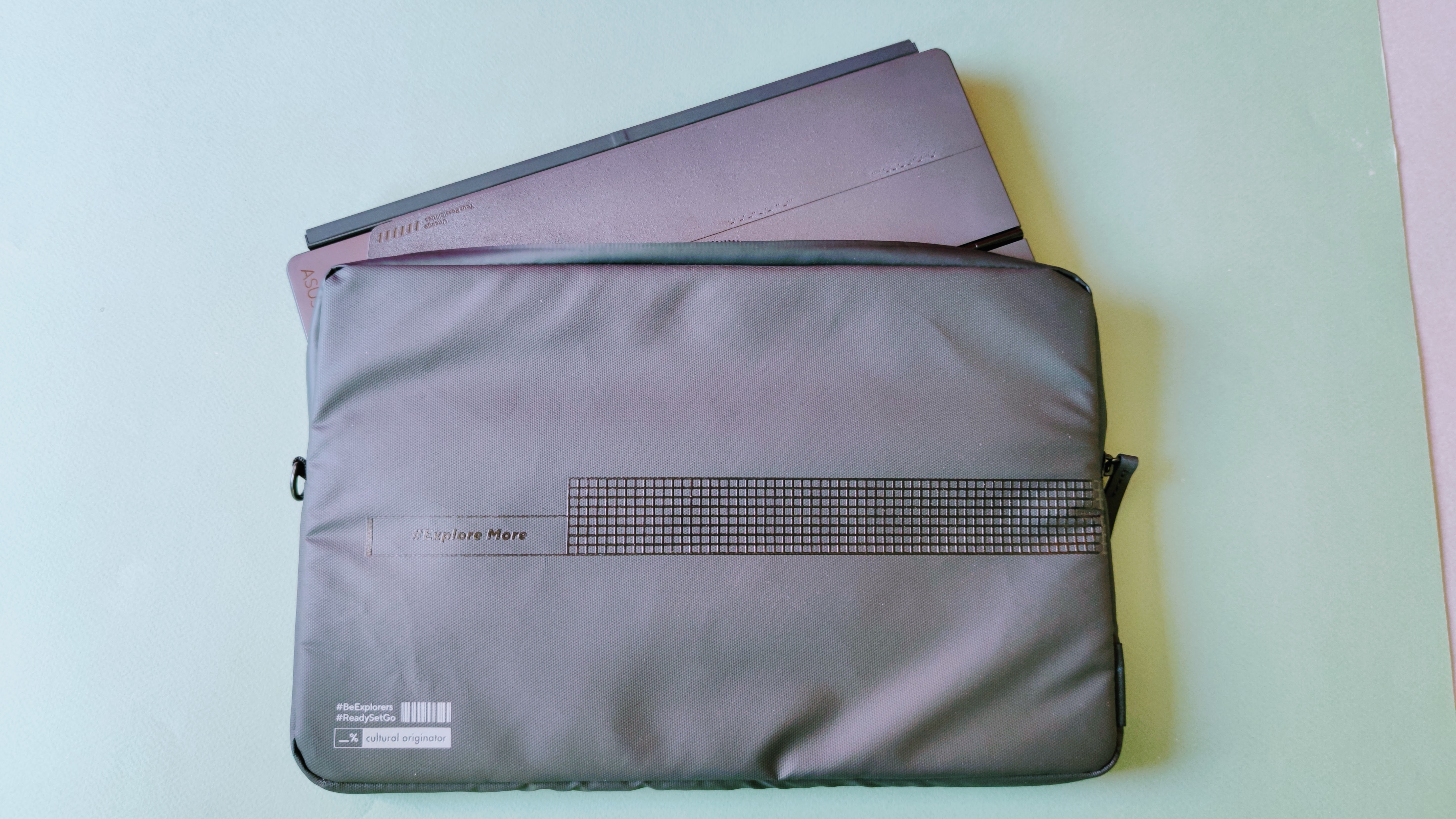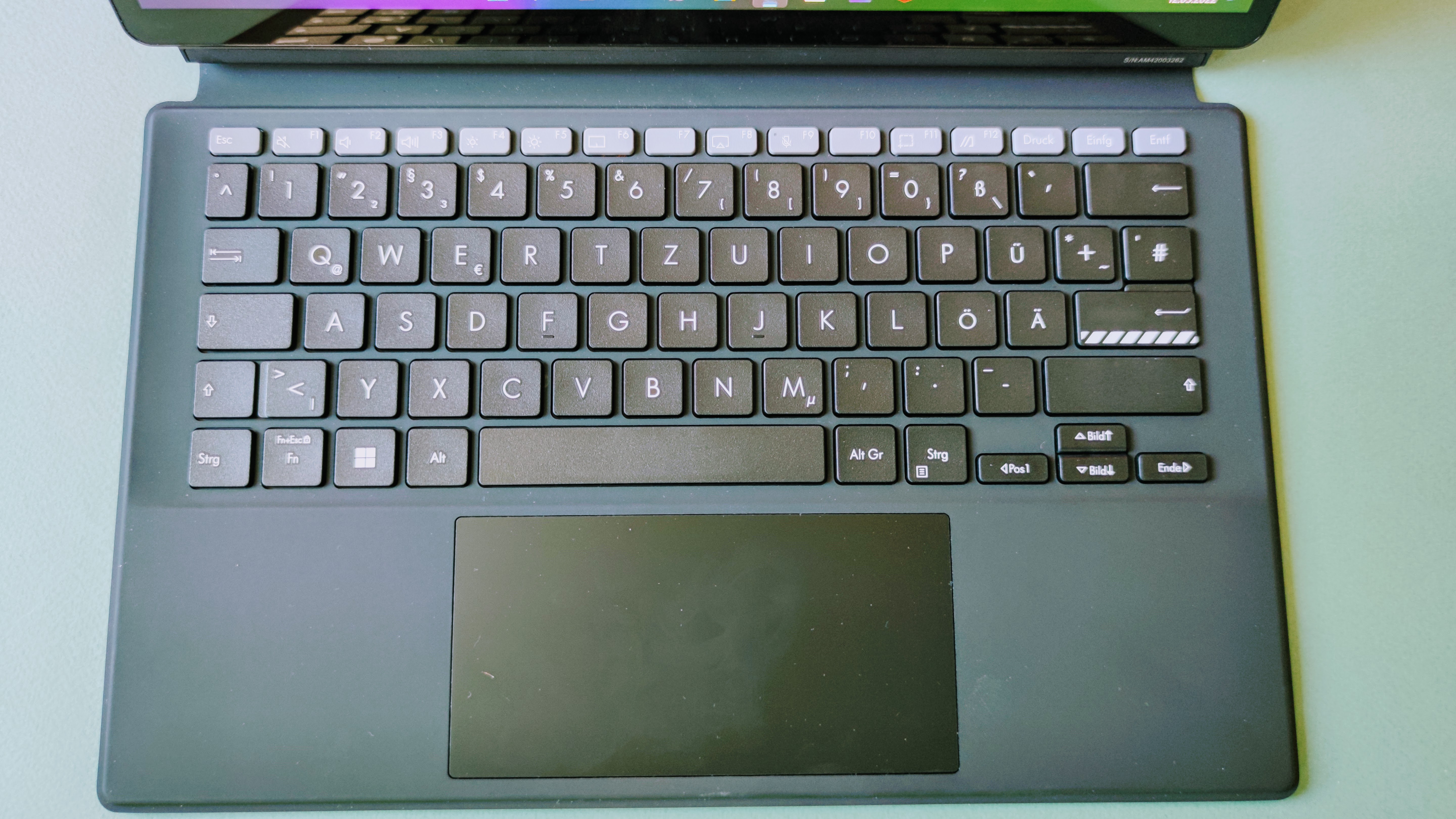 Optisch nimmt das Vivobook 13 Slate einige schicke und kantige Elemente auf, wie man sie von Laptops der Vivobook-Reihe her kennt. Dazu gehören feine Lüftungsschlitze seitlich im Rahmen. Markant ist zudem ein geriffeltes Element in Mittelgrau auf der Oberseite der Rückseite mit dem neongrünen Schriftzug „Wow the World“. Das verleiht dem Tablet insgesamt einen "frecheren" Charakter als man es von vergleichbaren Geräten gewohnt ist. Rechts davon befindet sich die eben aufliegende Hauptkamera. Die Webcam vorne ist im Displayrahmen eingebettet. Dieser wirkt ober- sowie unterhalb des Screens recht breit. Links und rechts fällt die Begrenzung ums Display hingegen deutlich schmaler aus.