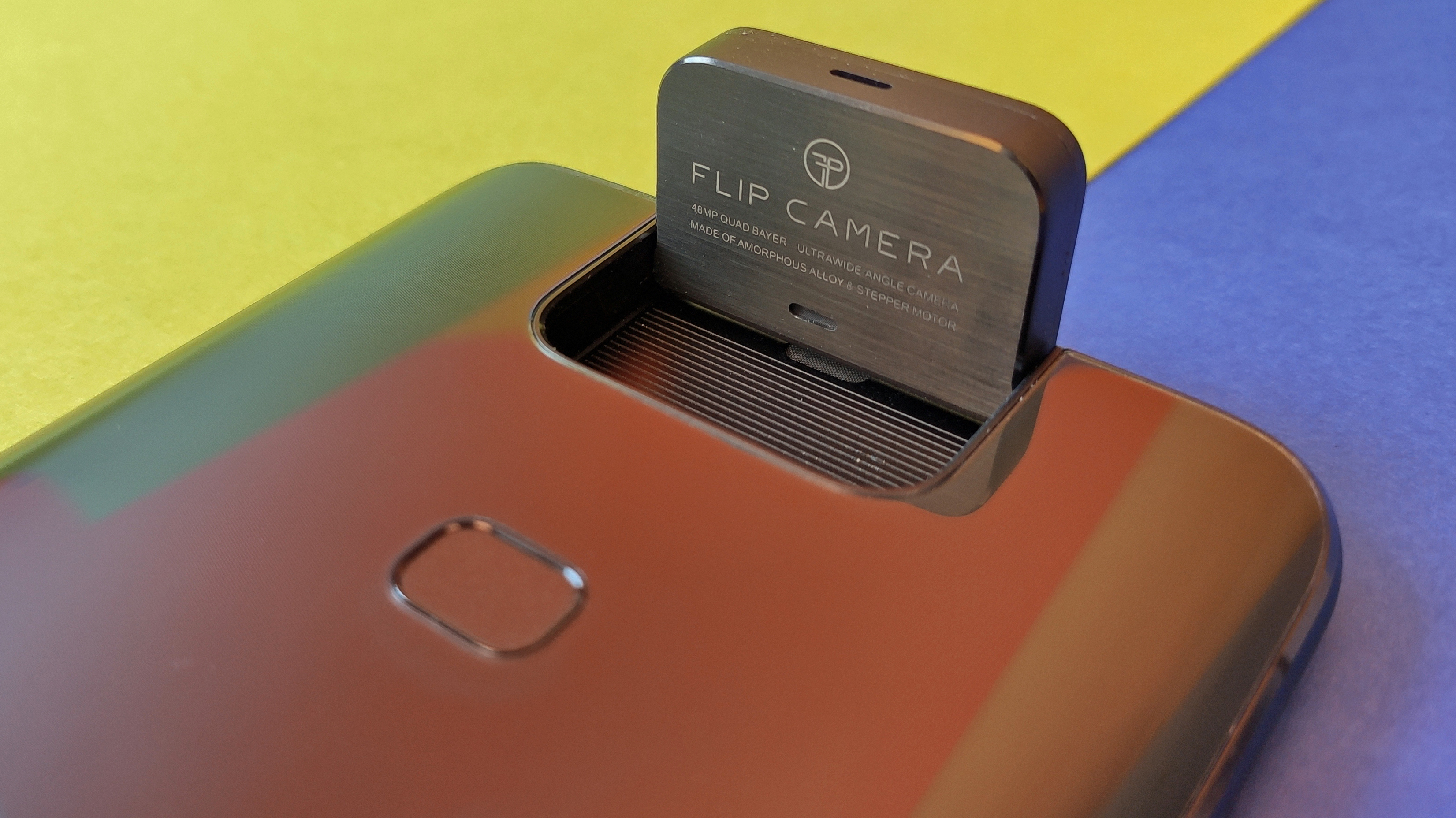 Unser Testgerät in der Farbe „Midnight Black“ sieht unspektakulär aus. Die Front überzeugt mit guter Display-zu-Gehäuse-Rate, die Ränder rings um den Screen sind ausreichend schmal geraten. Eine Notch gibt es nicht, die Frontkamera hat der Hersteller auf der Rückseite untergebracht. Das kling widersinnig, doch die Kamera schwenkt dank eines motorbetriebenen Mechanismus von der Rückseite auf die Front. Das lässt sich beim Blick auf die Rückseite nur erahnen. Zwar sieht man – wenn man es weiß – die Stelle, an der die Schwenkmechanik ins Gehäuse versenkt ist, doch das könnte auch als Designmerkmal der ansonsten eher schmucklosen Rückseite durchgehen. Außer einem vergleichsweise kleinen Fingerabdrucksensor und einigen metallisch blauen Schriftzügen gibt es hier nämlich nichts zu sehen.
