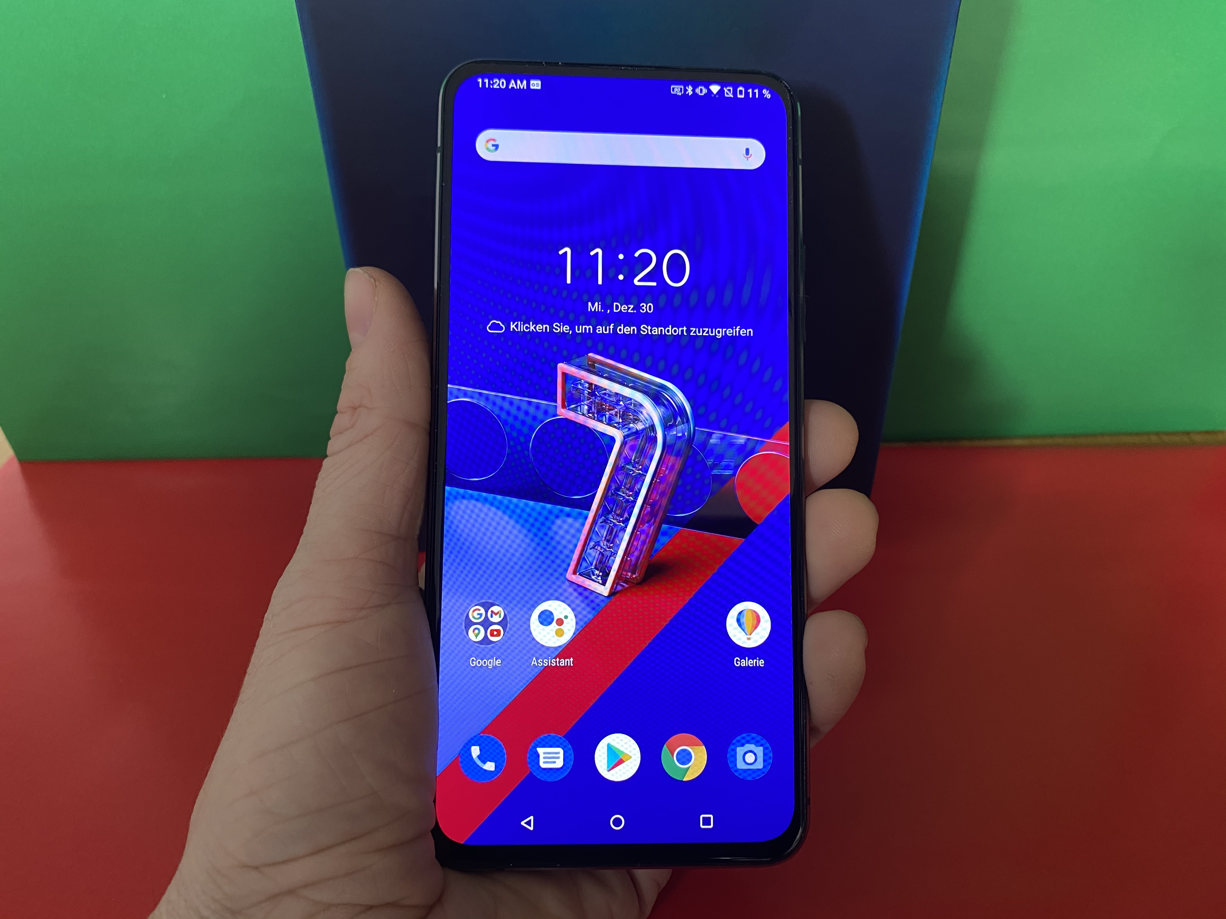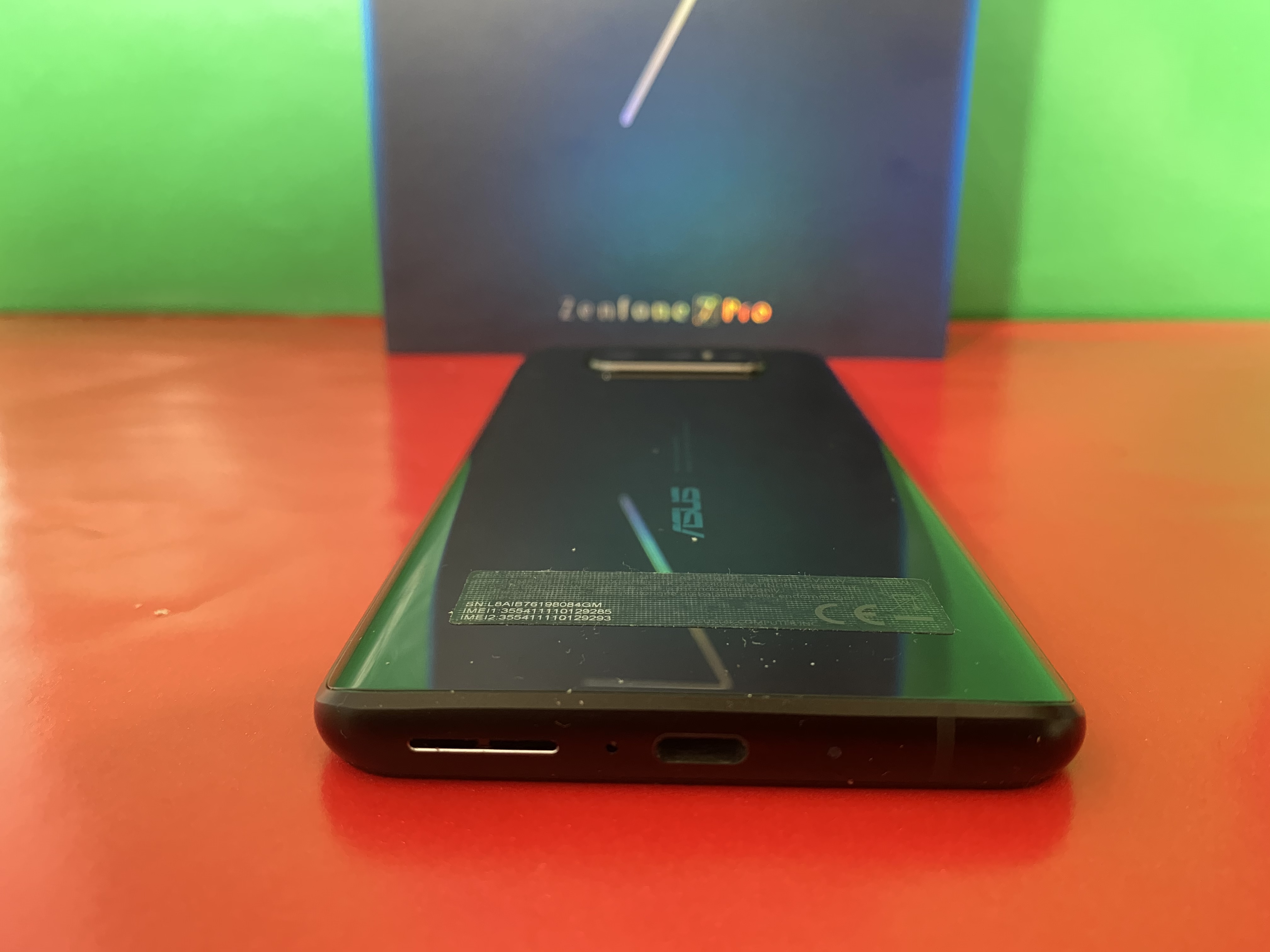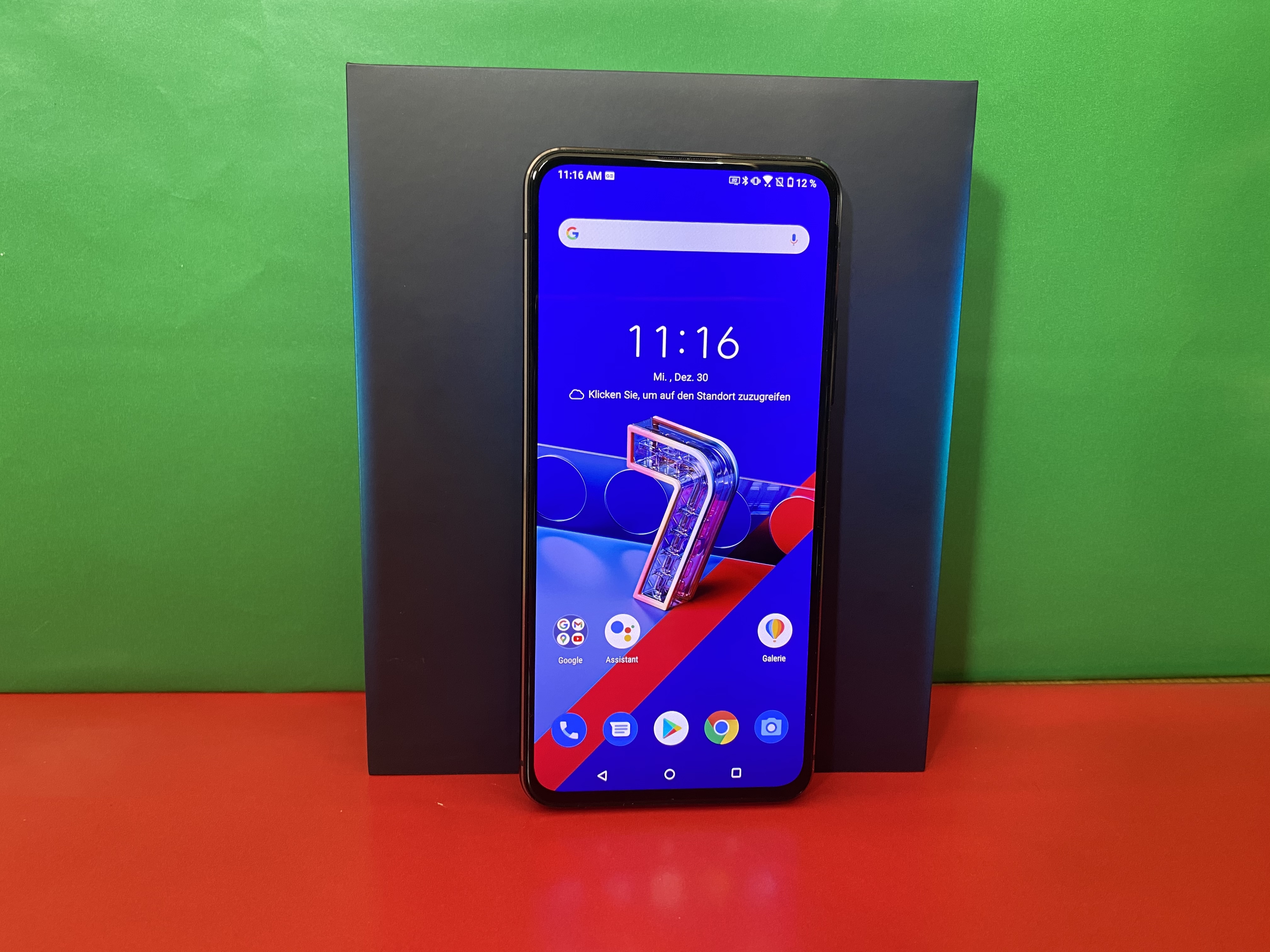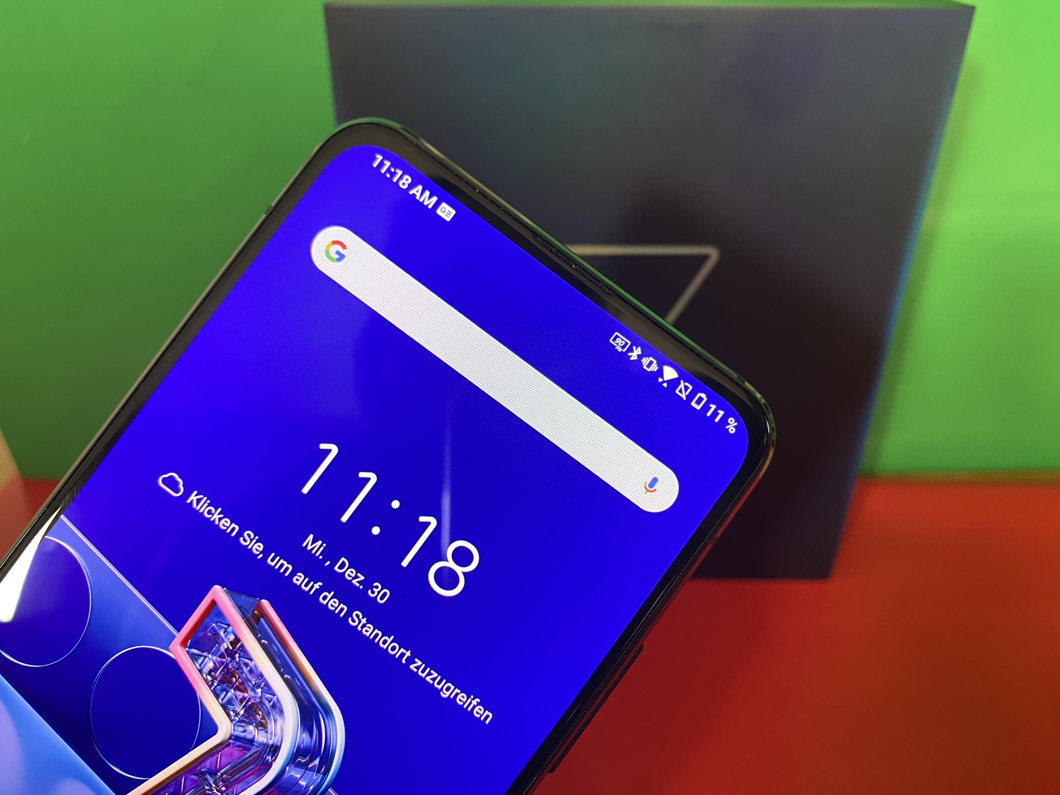 Aufgrund der Flip-Kamera entfällt die Notch auf der Vorderseite, wodurch die Darstellung auf dem Display nirgendwo gestört wird. Der schmale Bildschirmrand fügt sich mit je 3 Millimeter links und rechts sowie 4 Millimeter oben und unten gut in das moderne Gesamtbild. Die Flipkamera steht etwas aus der Rückseite heraus, schließt mit der mitgelieferten Hülle jedoch nahezu bündig ab. An der rechten Seite befinden sich der Volume-Regler sowie die Power-Taste, die gleichzeitig auch per integriertem Fingerabdruck-Scanner das Handy entriegelt. Der Hub des Volume-Reglers geht soweit in Ordnung, allerdings ist die Führung etwas wackelig, wodurch sowohl Power- als auch Volume-Schalter wenige Millimeter Spiel besitzen. Das sollte in der Oberklasse nicht vorkommen, allerdings ist Asus nicht der einzige Hersteller mit solchen kleinen unschönen Details. An der Fußseite befinden sich USB-C-Anschluss, Lautsprecher und eine Status-LED.