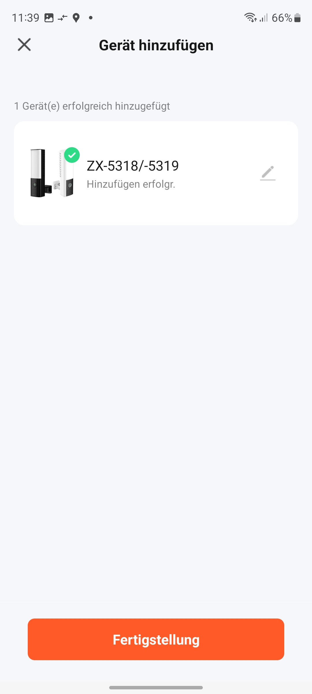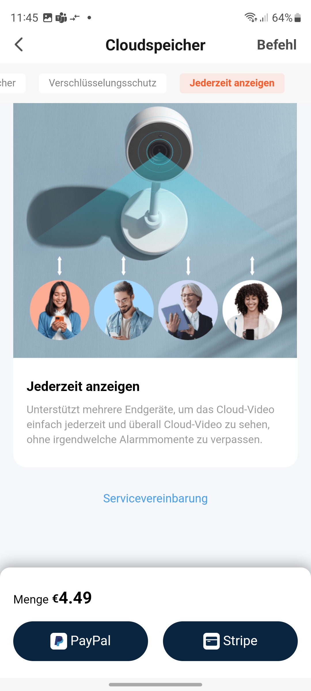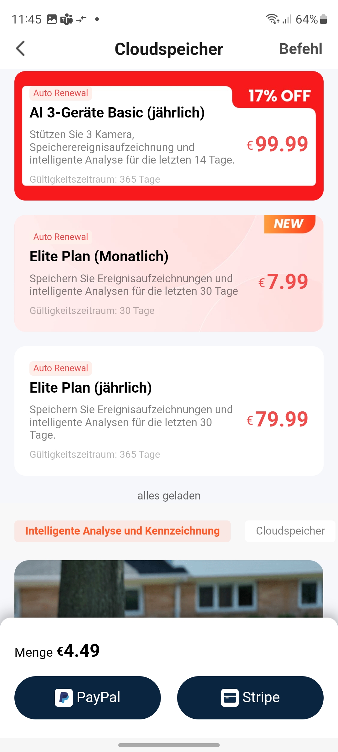 In der App wird das Gerät mit der Bezeichnung ZX-5318/-5319 registriert (5318 steht für das Modell in Schwarz). Tippt man auf die Kachel mit dieser Gerätebezeichnung, öffnet sich die Live-Ansicht. Im unteren Bereich können Anwender über Symbole die Vollbildansicht aktivieren, einen Screenshot erstellen, ein Gespräch mit einer Person vor der Kamera führen und ein Video aufzeichnen. Letztere nimmt die Kamera mit maximal 2304 × 1296 Pixel und 20 fps im H.264-Codec auf. Den deutlich platzsparenden Codec H.265 alias HEVC unterstützt das Modell nicht. Über das Symbol ganz rechts, dargestellt mit zwei Linien mit Pfeil nach oben, kommen weitere Schaltflächen zum Vorschein. Neben der Möglichkeit bestimmte Funktionen wie Bewegungserkennung, PIR, Sirene, Licht, Nachtmodus, Themenfarbe zu aktivieren, hat man über Wiedergabe und Galerie Zugriff auf die von der App (Wiedergabe) und die vom Anwender (Galerie) aufgenommenen Videos. Somit stehen viele wichtigen Funktionen direkt in der Live-Ansicht zur Verfügung. Weitere Einstellungen erreicht man über das Drei-Punkte-Symbol rechts oben. Hier können Anwender etwa die Empfindlichkeit bei der Bewegungserkennung inklusive den Aktivitätsbereich definieren. Auch das Aufnehmen von Videos, entweder kontinuierlich oder ereignisbasiert, kann man in den Einstellungen festlegen. Als Alternative zur Speicherung auf der microSD-Karte können Anwender außerdem ein kostenpflichtiges Cloud-Abo abschließen, das nicht nur Videos speichert, sondern weitere Erkennungsmethoden bietet. Während Visortech ZX-5319 standardmäßig Personenerkennung bietet, identifiziert die Kamera mit Cloud-Abo auch Fahrzeuge, Haustiere und Pakete. Die Preise für diesen Service liegen je nach Funktion und Geräteanzahl monatlich zwischen 6 und 12 Euro und zwischen 45 und 100 Euro bei jährlicher Abrechnung. Als Zahlungsdienstleister stehen Paypal und Stripe parat.