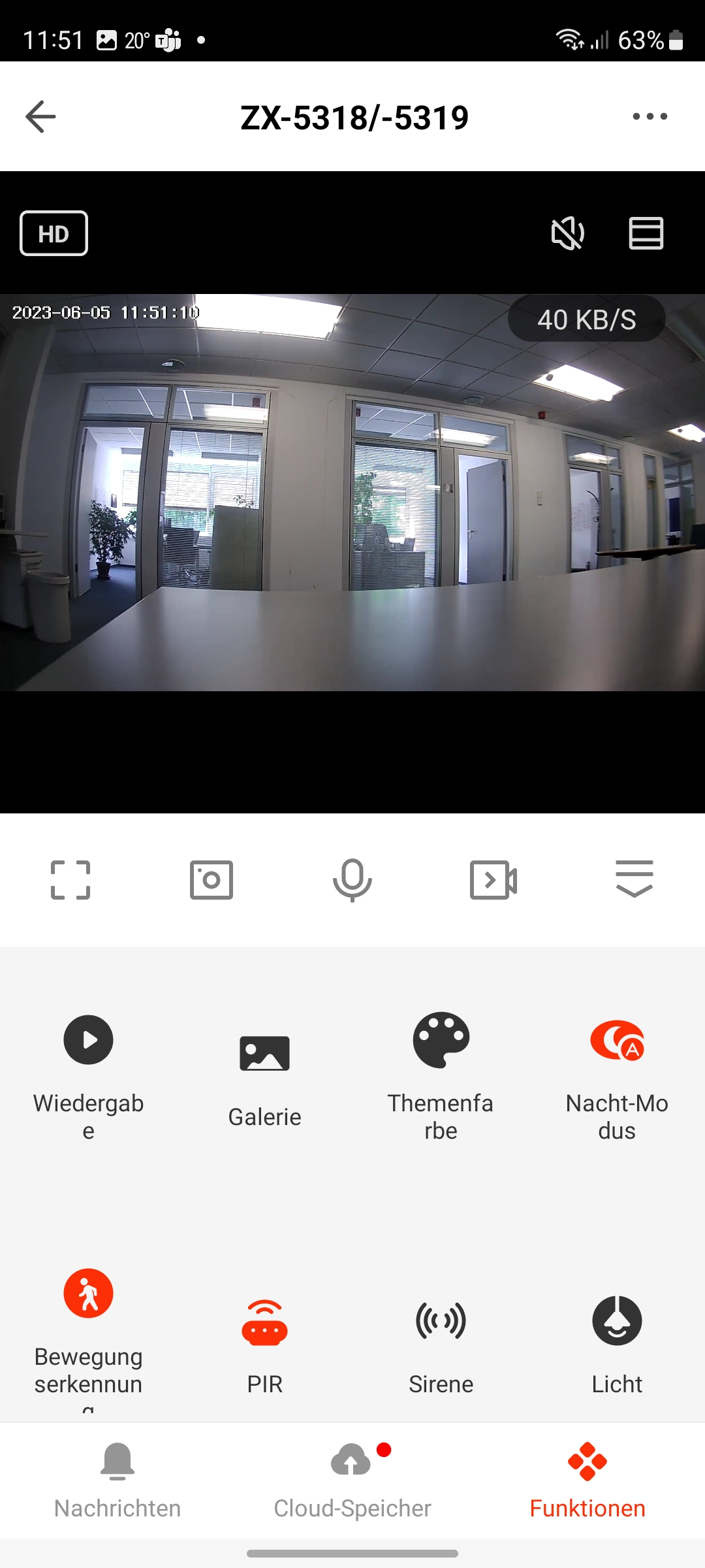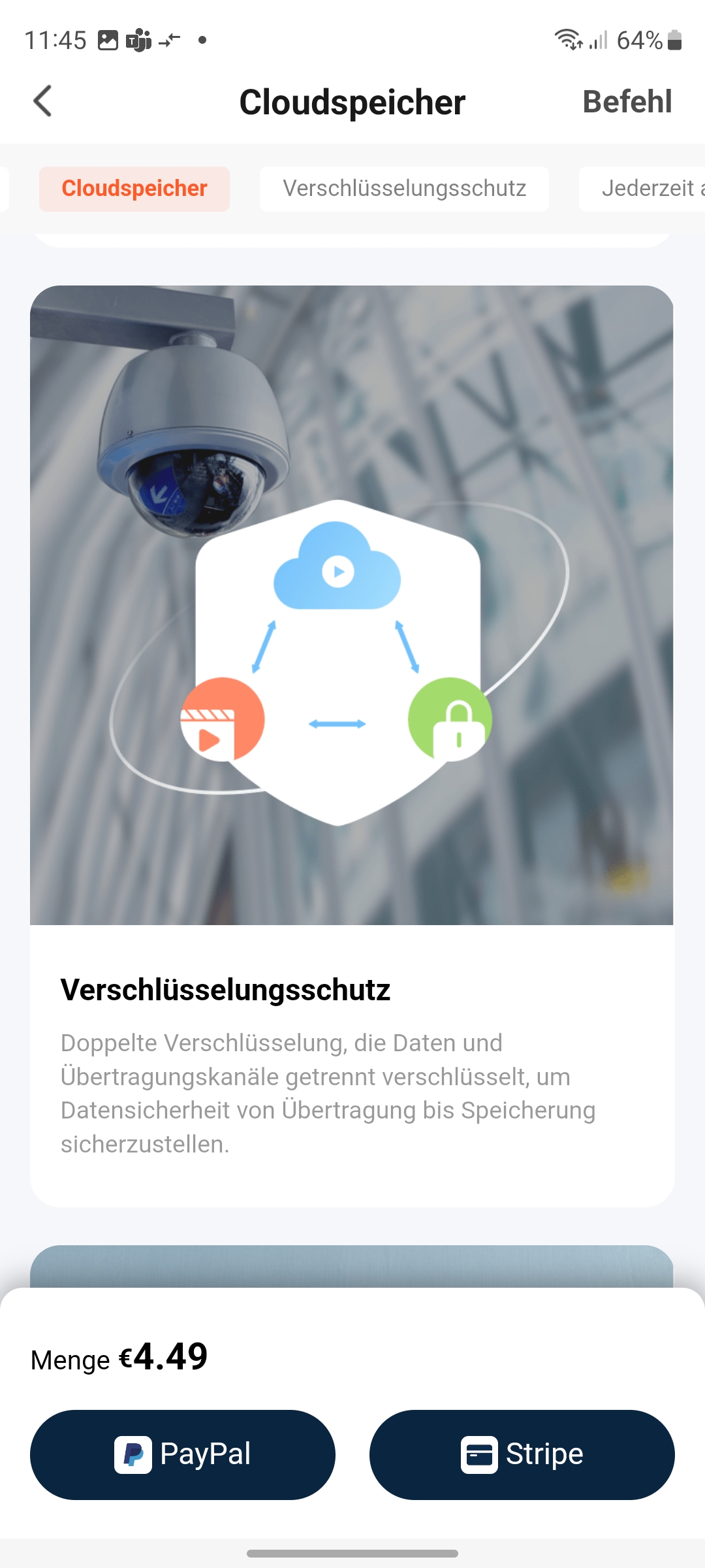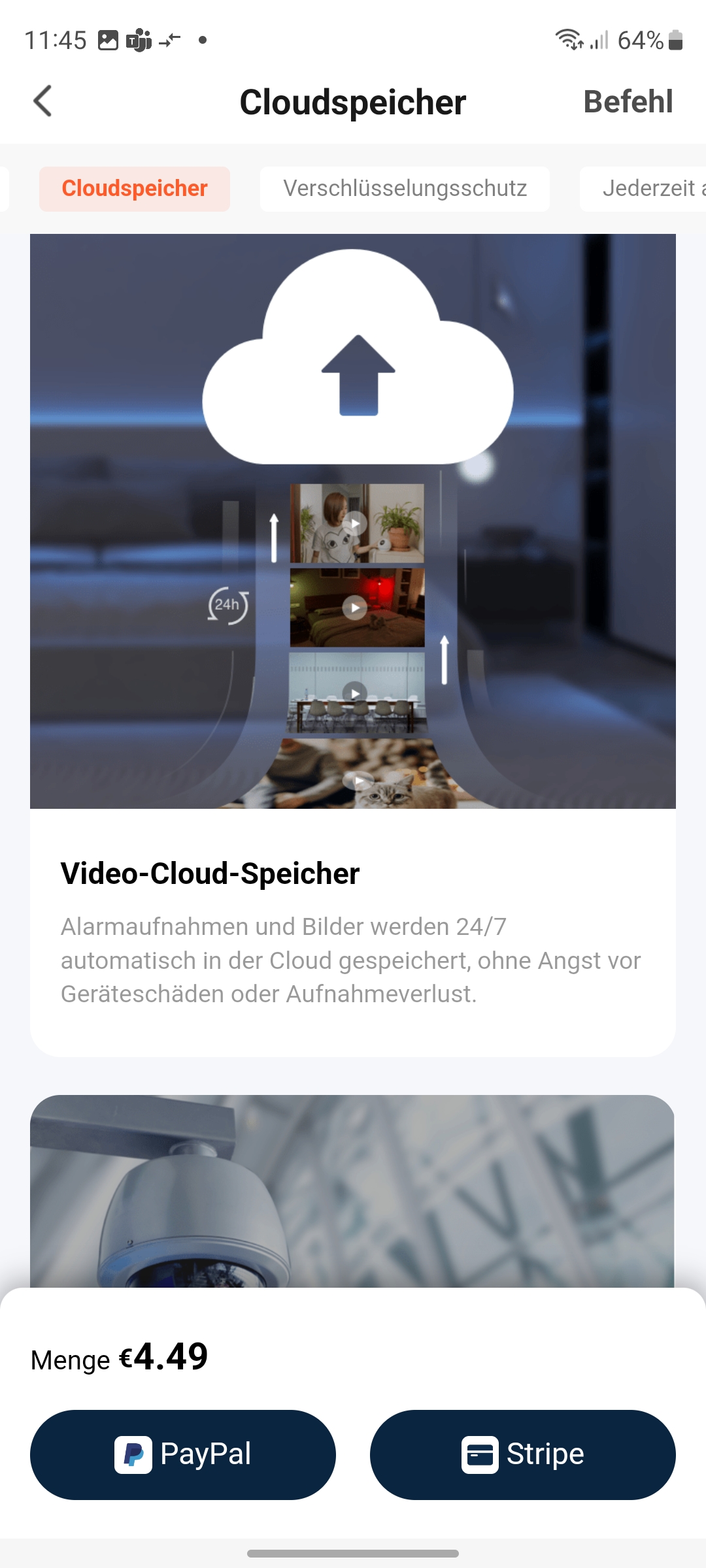 In der App wird das Gerät mit der Bezeichnung ZX-5318/-5319 registriert (5318 steht für das Modell in Schwarz). Tippt man auf die Kachel mit dieser Gerätebezeichnung, öffnet sich die Live-Ansicht. Im unteren Bereich können Anwender über Symbole die Vollbildansicht aktivieren, einen Screenshot erstellen, ein Gespräch mit einer Person vor der Kamera führen und ein Video aufzeichnen. Letztere nimmt die Kamera mit maximal 2304 × 1296 Pixel und 20 fps im H.264-Codec auf. Den deutlich platzsparenden Codec H.265 alias HEVC unterstützt das Modell nicht. Über das Symbol ganz rechts, dargestellt mit zwei Linien mit Pfeil nach oben, kommen weitere Schaltflächen zum Vorschein. Neben der Möglichkeit bestimmte Funktionen wie Bewegungserkennung, PIR, Sirene, Licht, Nachtmodus, Themenfarbe zu aktivieren, hat man über Wiedergabe und Galerie Zugriff auf die von der App (Wiedergabe) und die vom Anwender (Galerie) aufgenommenen Videos. Somit stehen viele wichtigen Funktionen direkt in der Live-Ansicht zur Verfügung. Weitere Einstellungen erreicht man über das Drei-Punkte-Symbol rechts oben. Hier können Anwender etwa die Empfindlichkeit bei der Bewegungserkennung inklusive den Aktivitätsbereich definieren. Auch das Aufnehmen von Videos, entweder kontinuierlich oder ereignisbasiert, kann man in den Einstellungen festlegen. Als Alternative zur Speicherung auf der microSD-Karte können Anwender außerdem ein kostenpflichtiges Cloud-Abo abschließen, das nicht nur Videos speichert, sondern weitere Erkennungsmethoden bietet. Während Visortech ZX-5319 standardmäßig Personenerkennung bietet, identifiziert die Kamera mit Cloud-Abo auch Fahrzeuge, Haustiere und Pakete. Die Preise für diesen Service liegen je nach Funktion und Geräteanzahl monatlich zwischen 6 und 12 Euro und zwischen 45 und 100 Euro bei jährlicher Abrechnung. Als Zahlungsdienstleister stehen Paypal und Stripe parat.