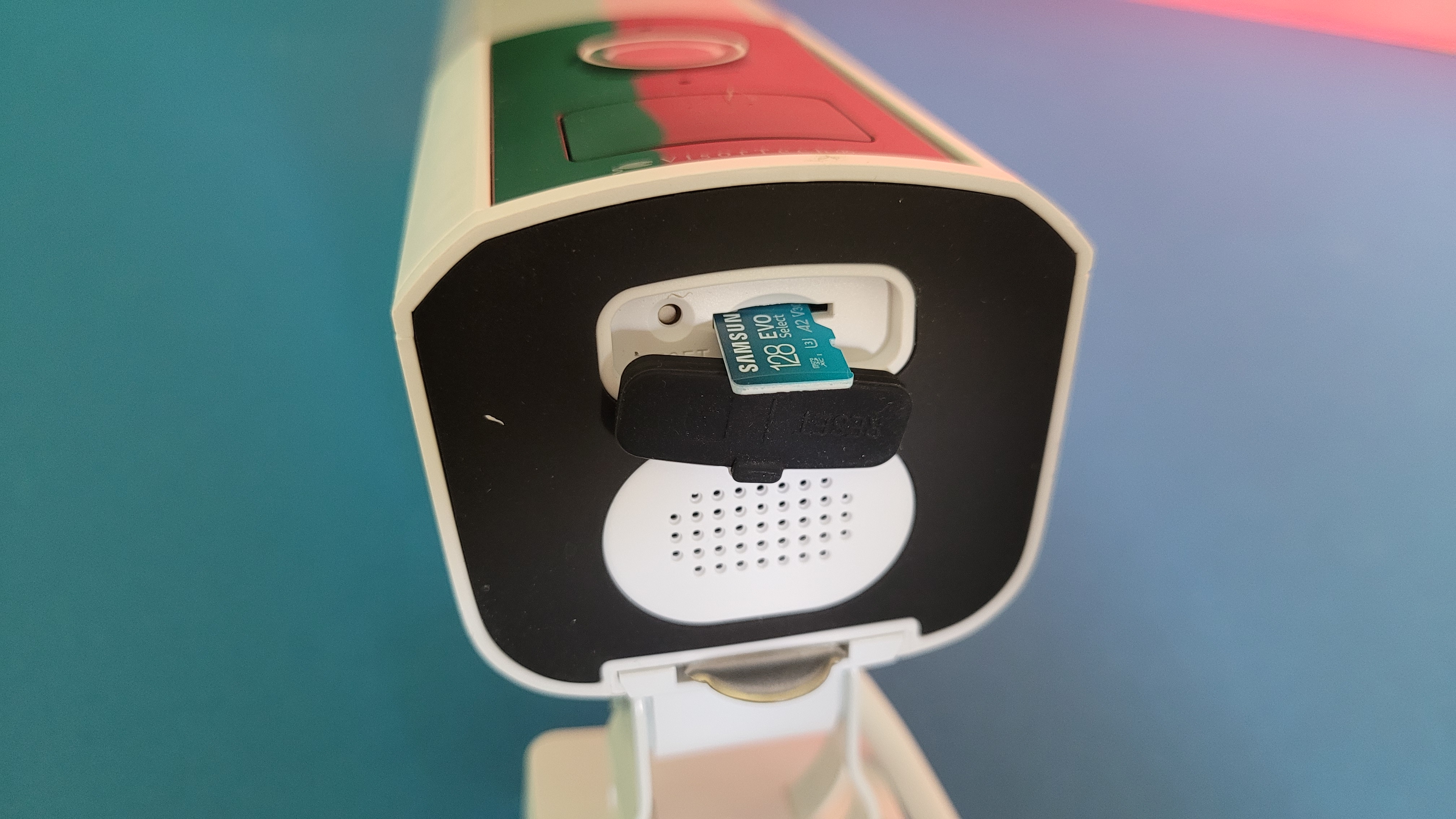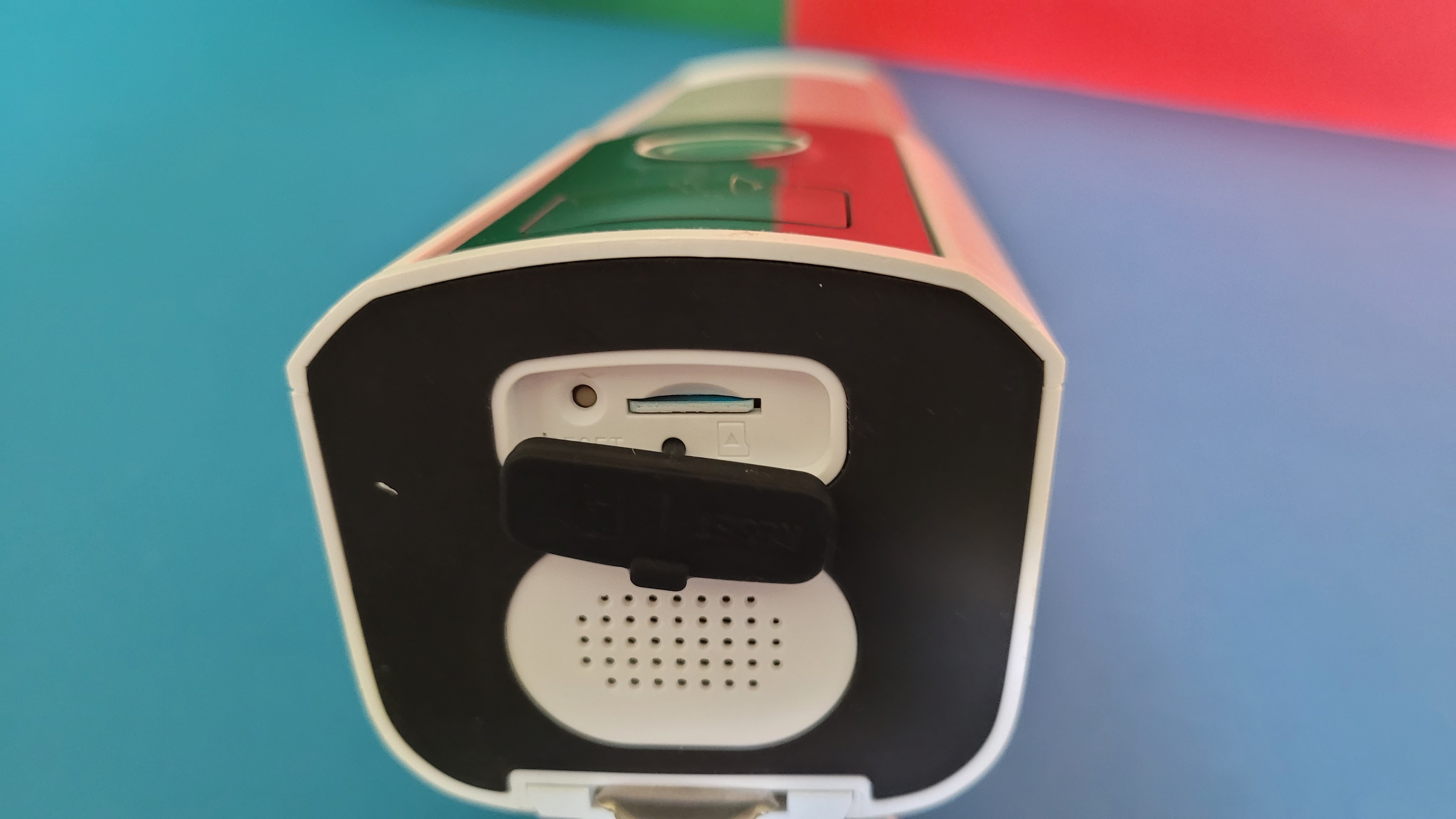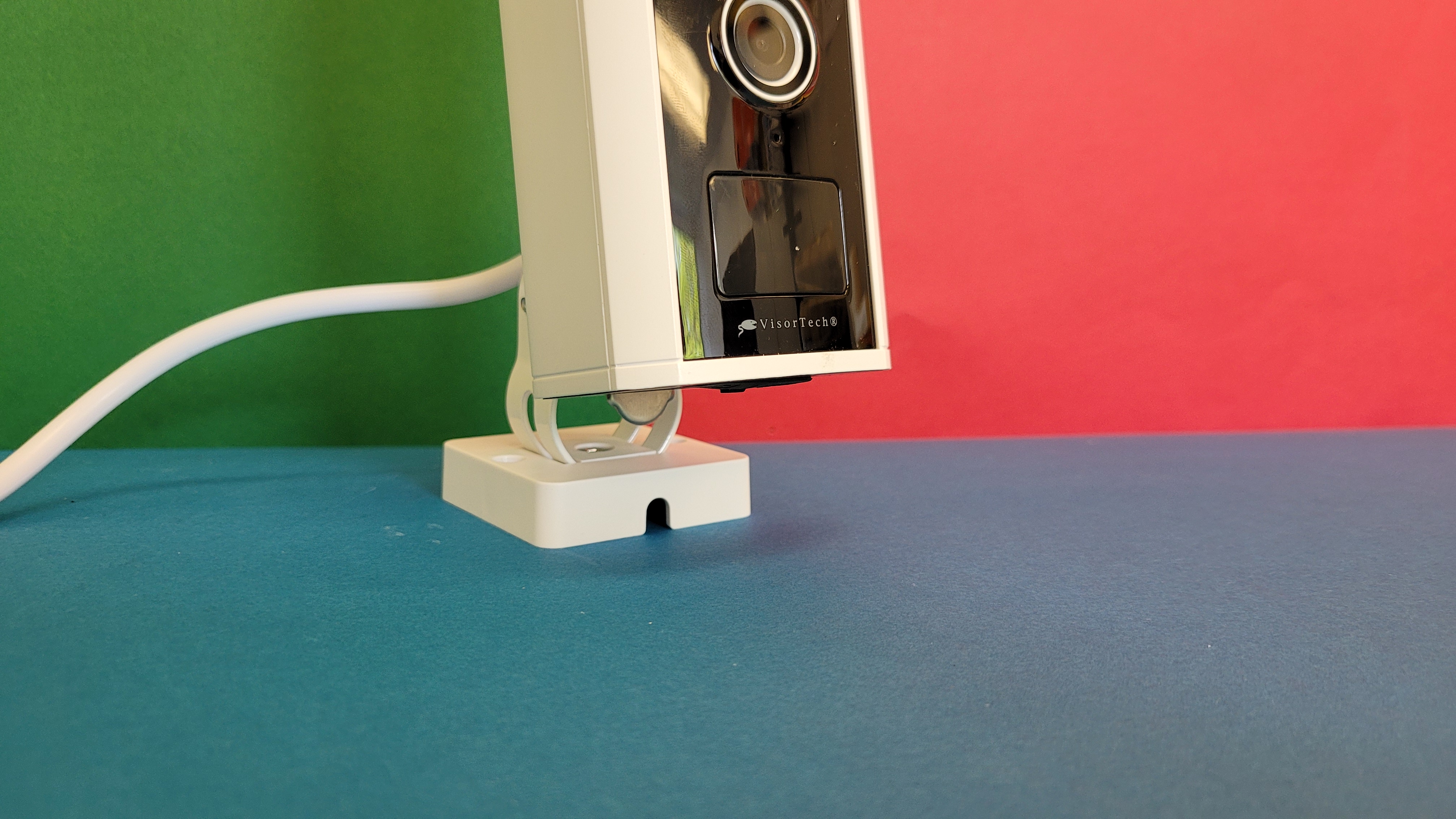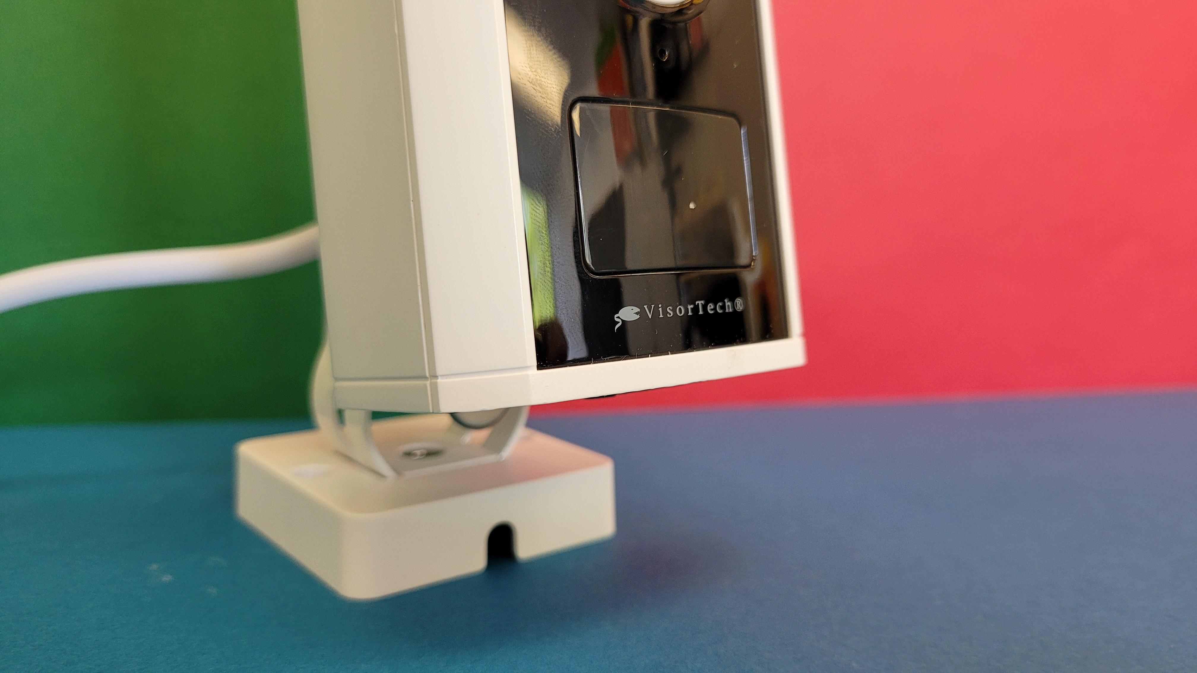An der Unterseite verstecken sich hinter einer Gummiabdeckung Reset-Schalter und microSD-Card-Slot. Daneben sitzt der Lautsprecher, der eine bis 110 dB laute Sirene ertönen lassen kann. Am hinteren Gehäuse gibt es im unteren Bereich eine Einkerbung, in die man den Plastikfuß einrastet. Dieser bietet ein justierbares Gelenk, das man mit dem mitgelieferten Sechskantschlüssel in der gewünschten Position zwischen 0° und 90° arretiert. So ist eine Montage an einer Wand genauso möglich wie auf einer flachen Oberfläche. Frei stehen kann die Visortech ZX-5319 auf einer flachen Oberfläche wie einem Tisch oder Regal ebenfalls, wenn man sie leicht nach hinten neigt. Stabiler ist der Halt natürlich, wenn man die mitgelieferten Schrauben und Dübeln zur Befestigung des Standfußes verwendet.
