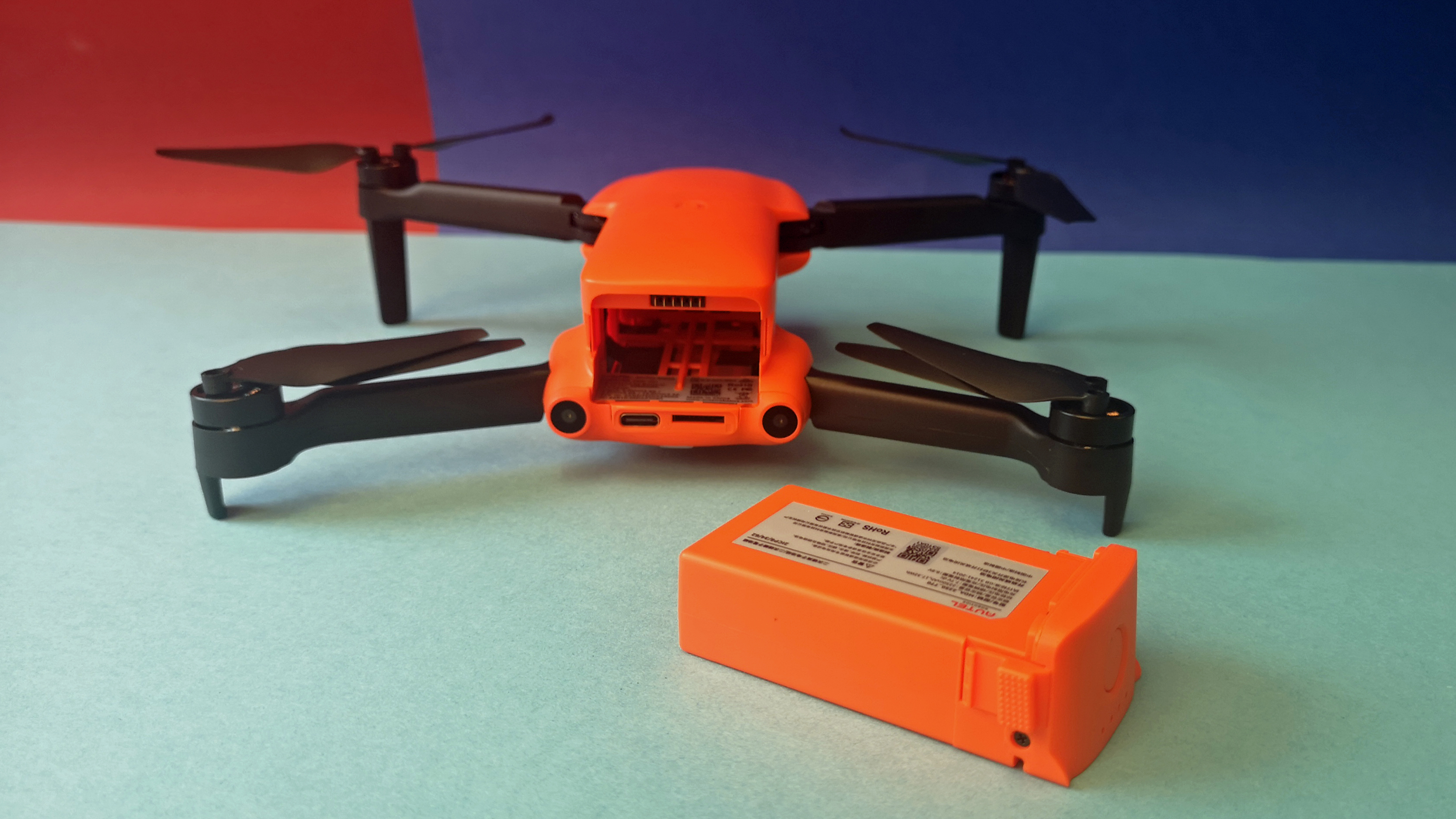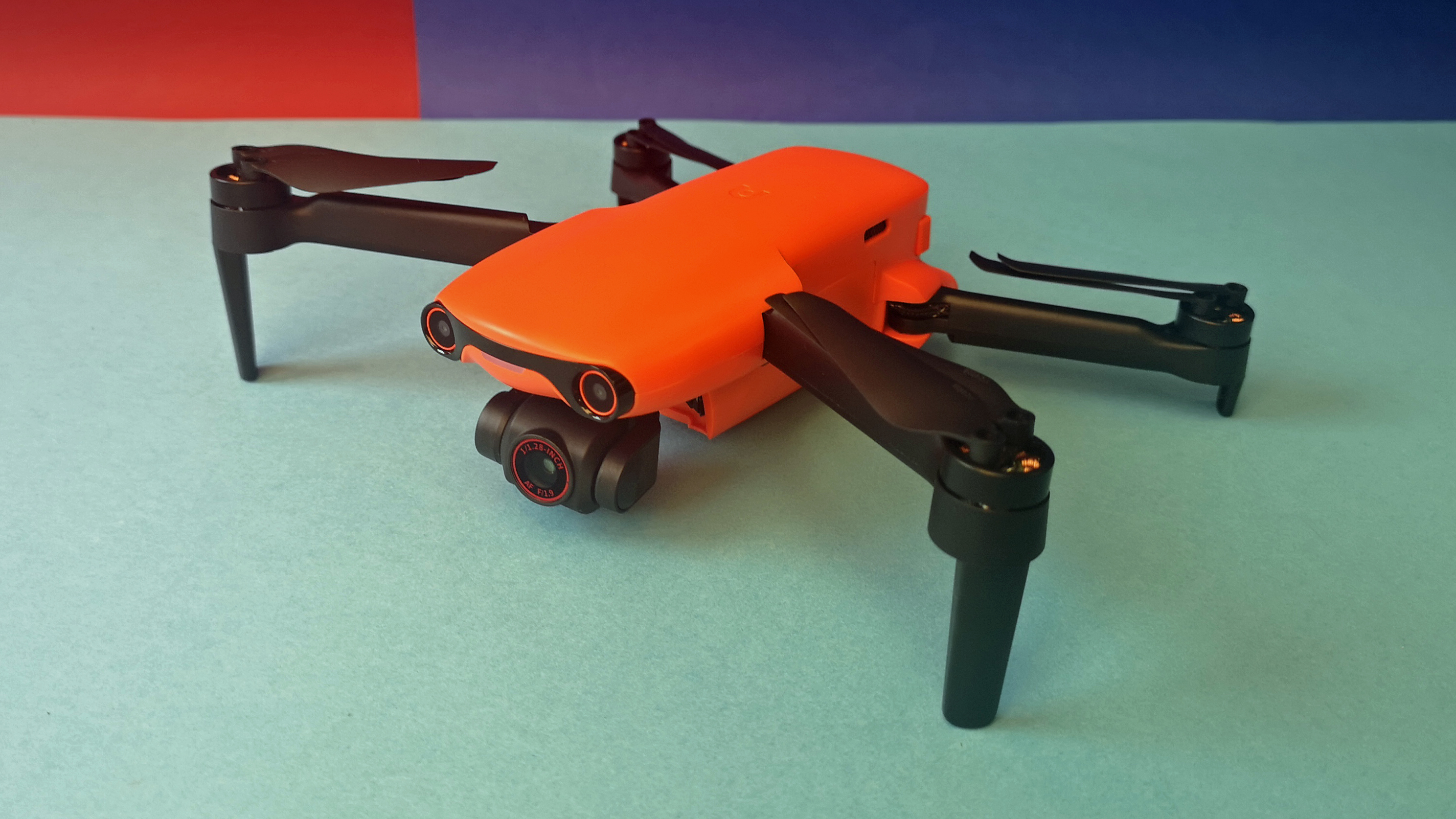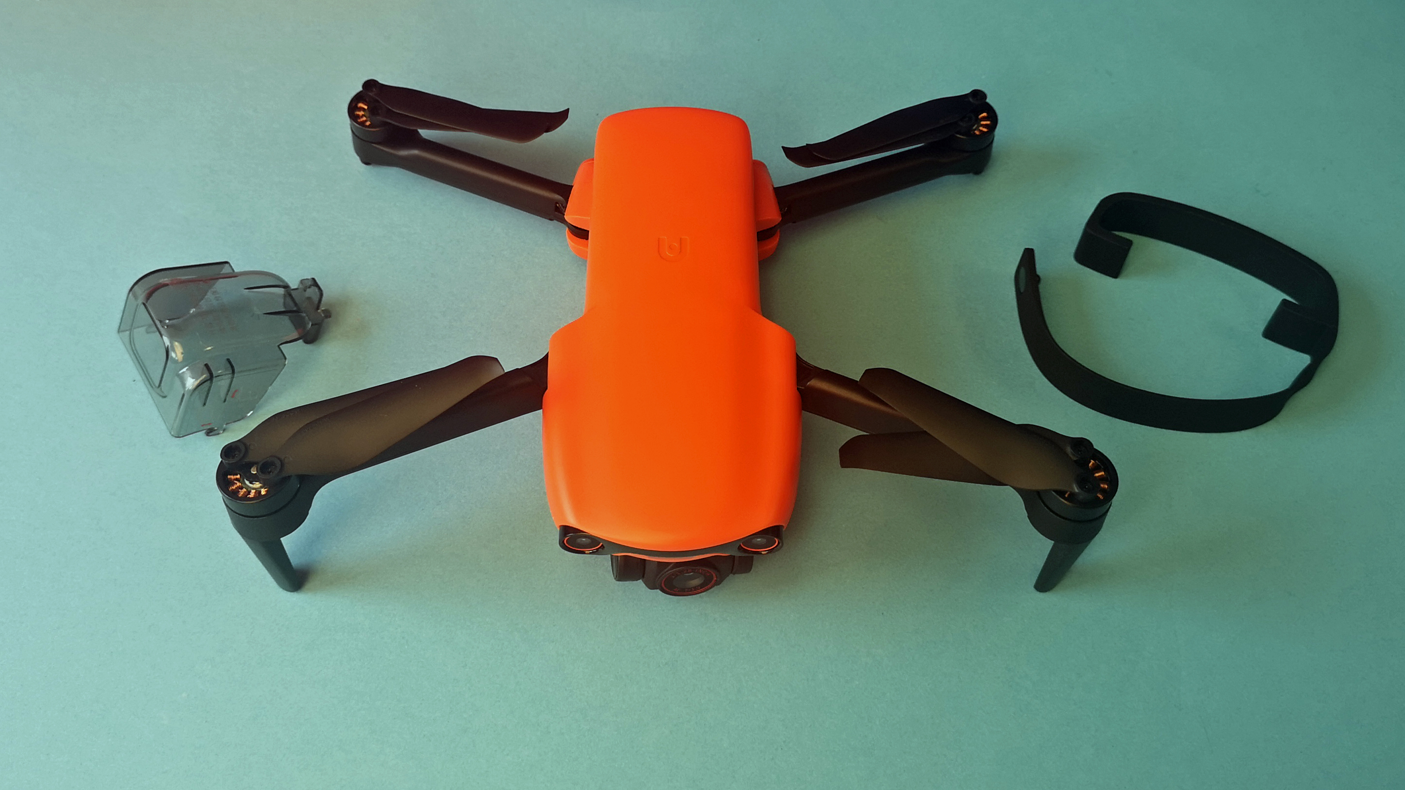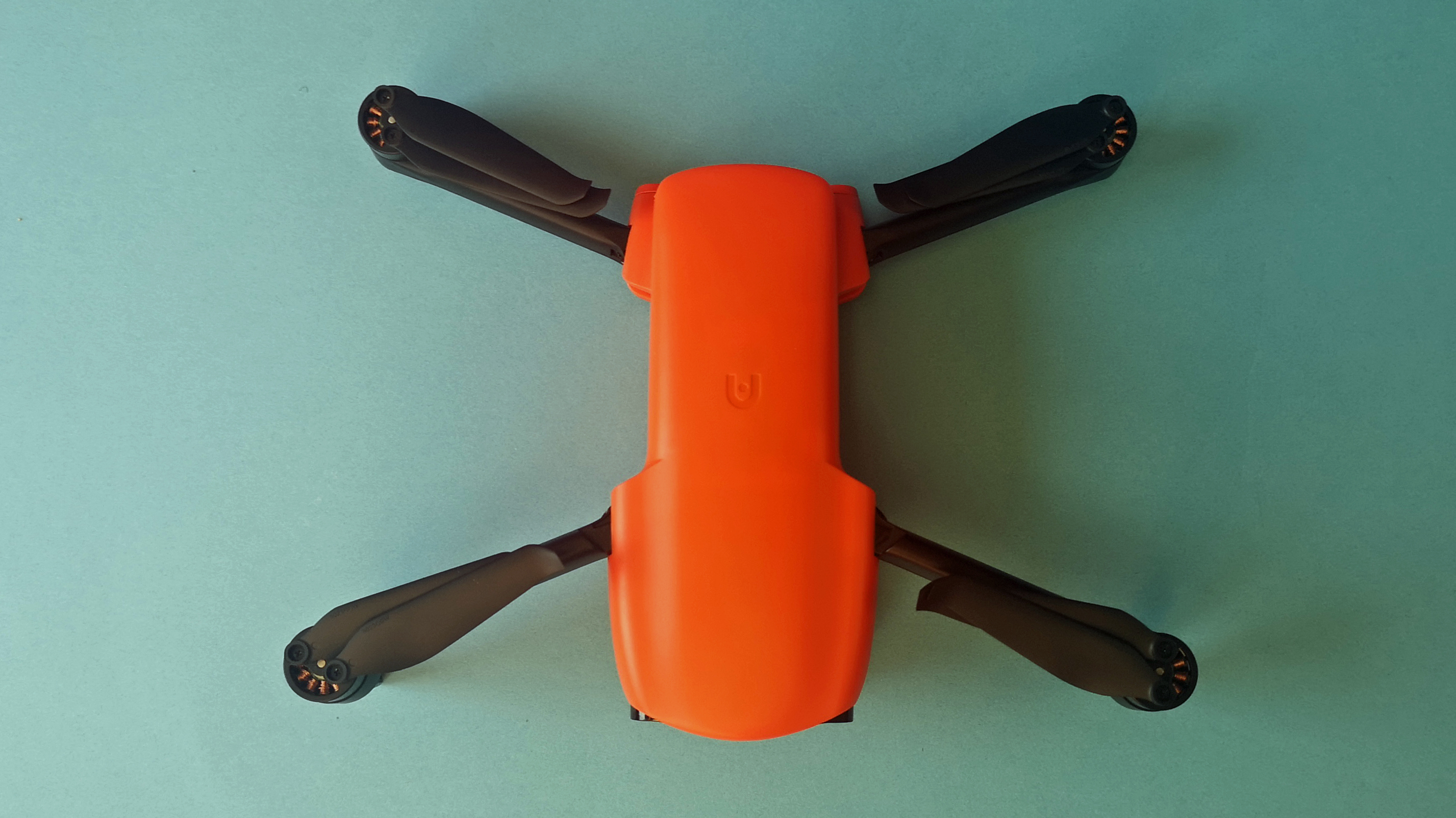 Zusammengefaltet misst die Evo Nano Plus gerade einmal 14 x 9 x 6 cm, auseinandergeklappt ist die Drohne dann knapp 26 x 33 x 6 cm groß und damit vergleichbar zur Mavic-Mini-Serie von DJI. Das Gewicht ist mit 249 g identisch zur Konkurrenz. Die Verarbeitung unseres Modells ist tadellos, das Modell ist zwar leicht und filigran, aber trotzdem stabil und verwindungssteif. Der glänzend glatte, orange Kunststoff wirkt im Vergleich zur rauen Oberfläche einer Mavic weniger hochwertig.