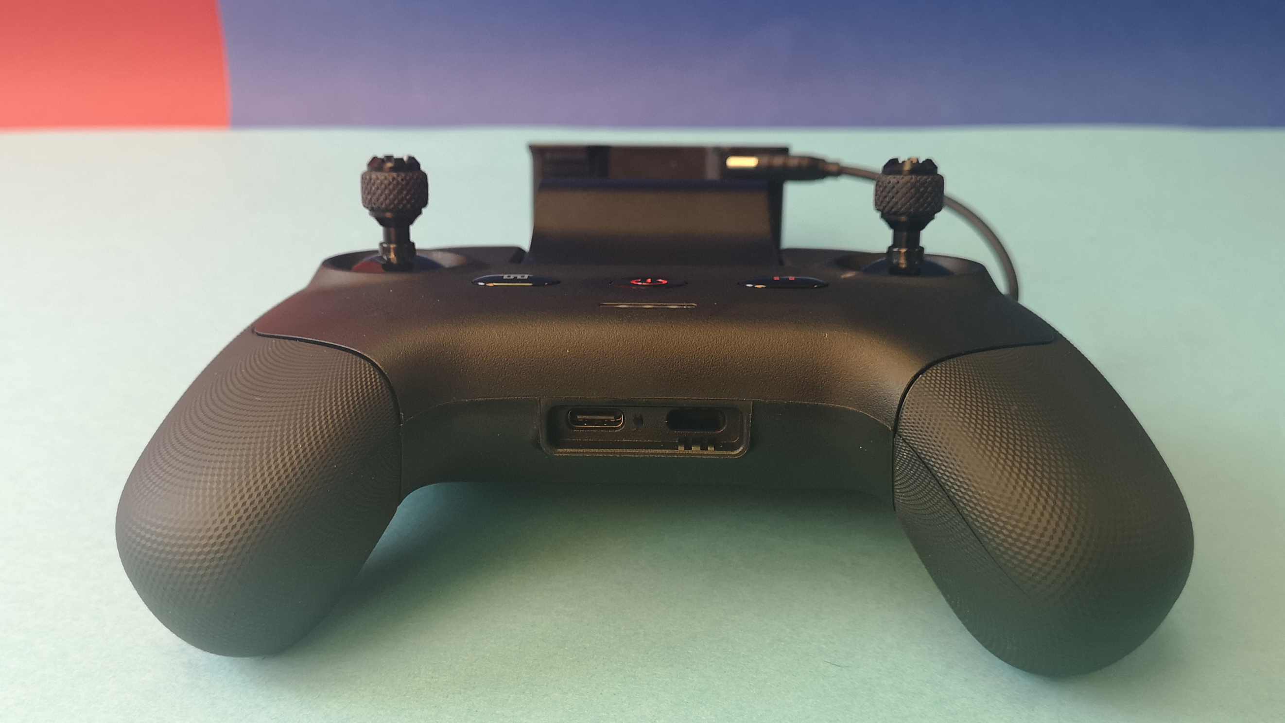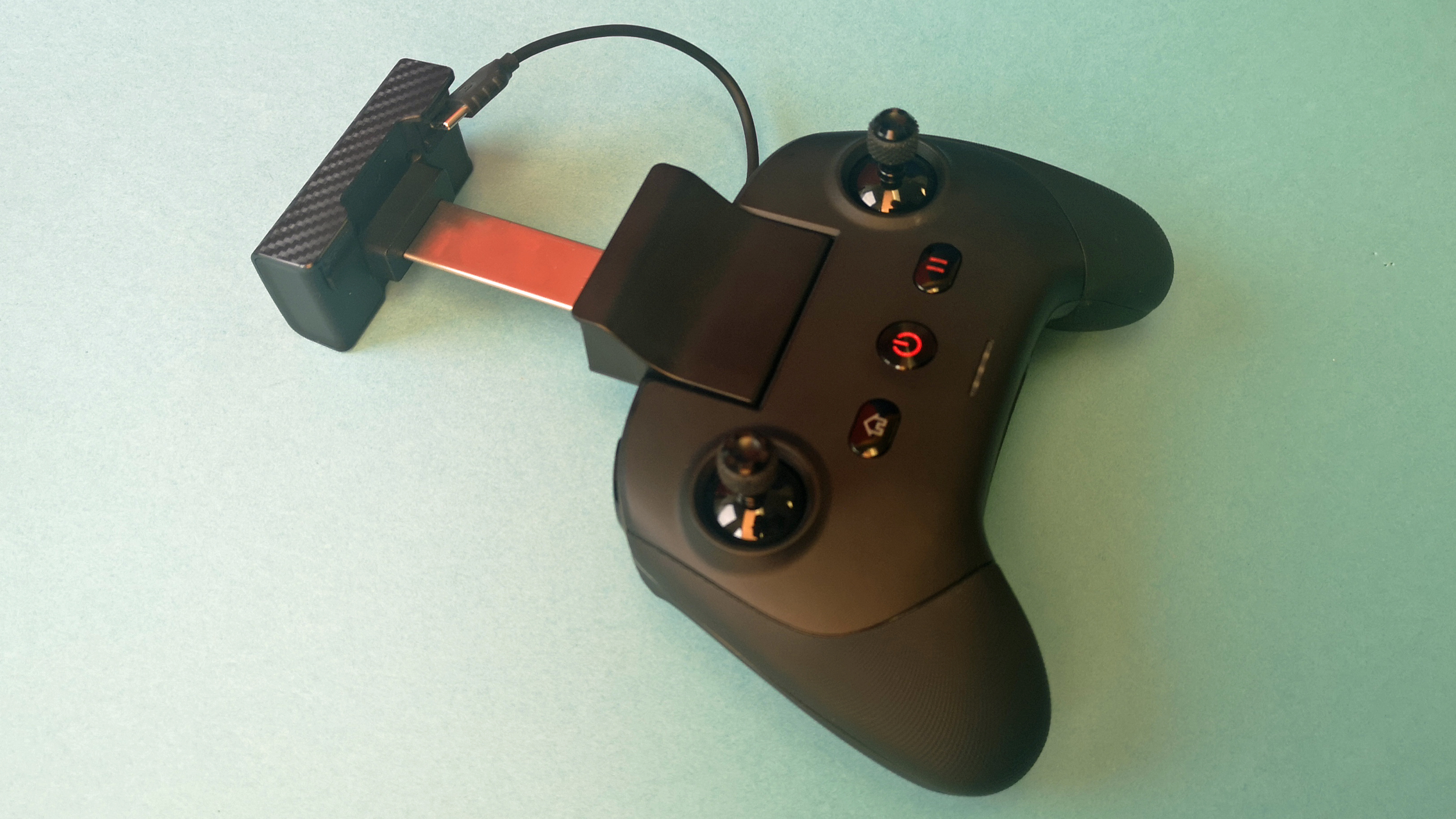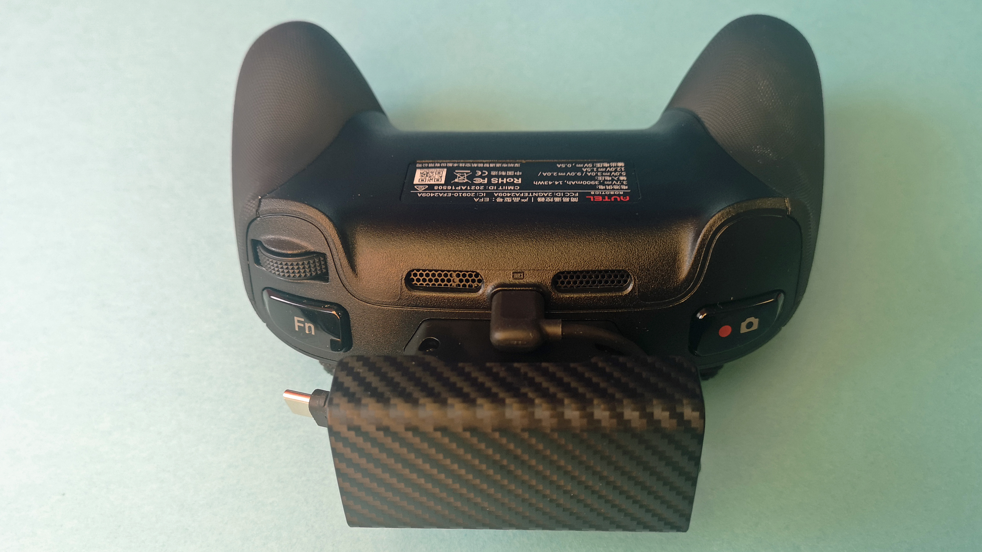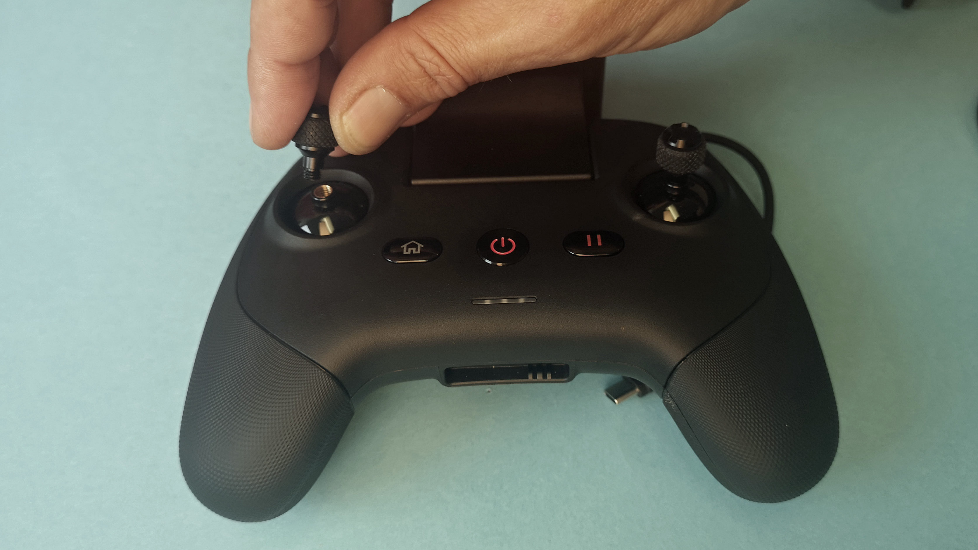 Der schwarze Handsender ist deutlich moderner gestaltet als der Standard-Sender von DJI. Design und Haptik erinnern an einen Xbox-Controller und so liegt die Fernsteuerung super in der Hand. Die beiden Steuersticks sind für den Transport abschraubbar. Leider gibt es weder Ersatzknüppel im Lieferumfang noch eine Aufbewahrungsmöglichkeit direkt am Sender und so muss man aufpassen, die kleinen Metallsticks nicht zu verlieren. Ein weiterer Negativpunkt ist das aus unserer Sicht unglückliche Design der Smartphone-Halterung. Diese ist derart klobig, dass der Controller im direkten Vergleich zu DJI sogar noch etwas größer ist – obwohl er auf den ersten Blick kompakter wirkt. Neben den beiden Steuerhebeln stehen am Sender ein Power-Button, vier Bedientasten und ein Rad zur Ausrichtung der Kamera zur Verfügung. Das für das Livebild zuständige Smartphone wird per USB-C angeschlossen. Zusätzlich steht ein zweiter USB-C-Port zum Laden des Handsenders bereit.