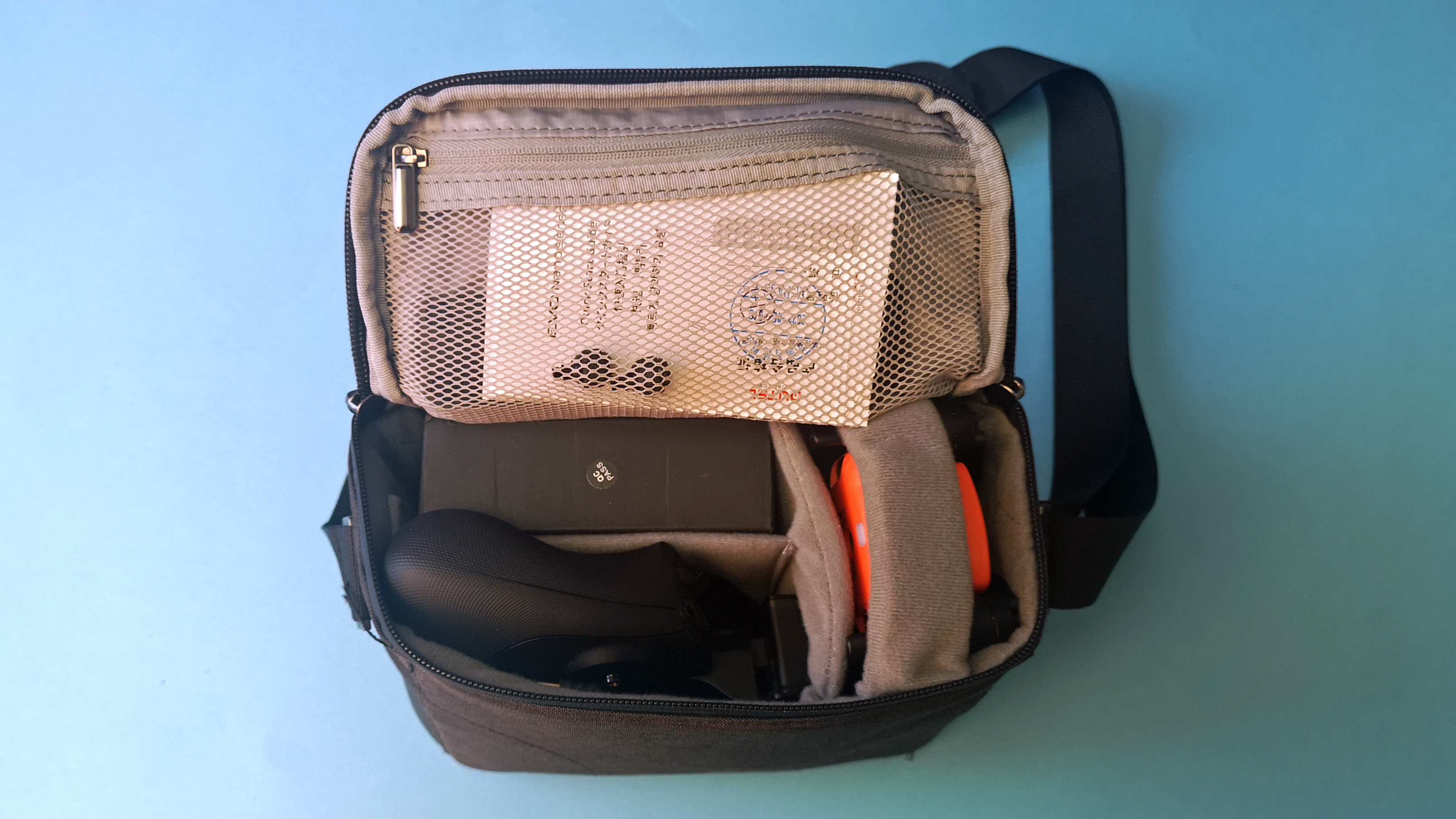Bei dem uns zur Verfügung gestellten Modell handelt es sich um das sogenannte Premium-Bundle. Dieses beinhaltet neben Drohne, Controller, Ladegerät und Akku noch zwei zusätzliche Flugakkus und eine geeignete Umhängetasche – welche ebenfalls stark an die der Mavic Mini erinnert. Das Kunststoff-Chassis unserer Drohne ist knallig orange. Alternativ gibt es das Fluggerät auch in Grau und Weiß. Was uns gut gefällt, ist der Propeller-Schutz, der die Luftschrauben während des Transports fixiert und gegen Beschädigungen schützt. Dieser ist so nahezu identisch auch bei der Mini 2 verfügbar. Bei der Mini 3 hat DJI darauf verzichtet.