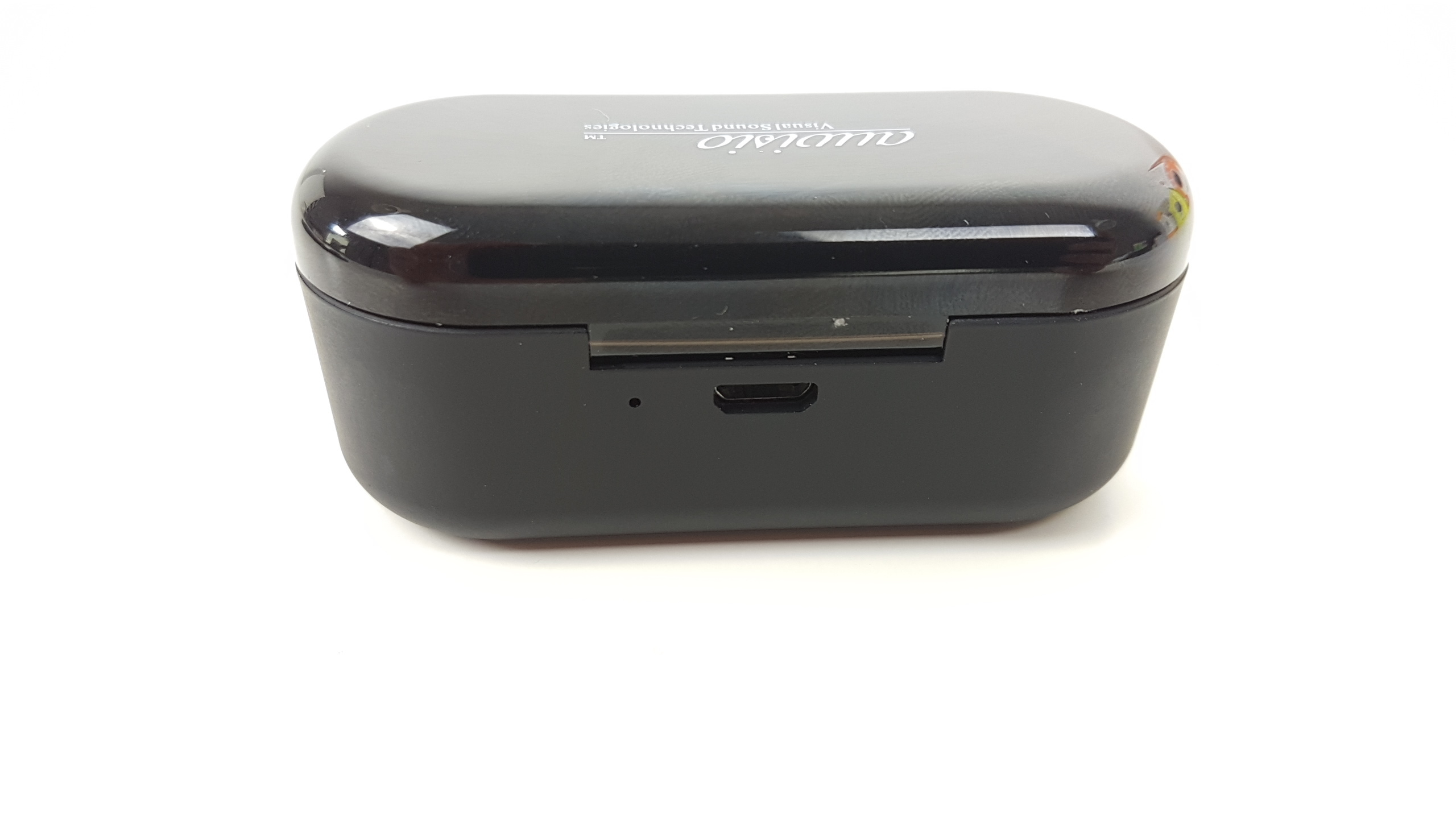 Das In-Ear-Stereo-Headset von Auvisio (IHS-620.bt) steckt in einer größtenteils mit leicht gummiertem Material versehenen Transportbox. Der Deckel hingegen ist aus dunklem, aber dennoch transparenten Kunststoff, durch den der Nutzer die Status-LEDs leuchten sieht. Auf der Rückseite des Etuis befindet sich ein microUSB-Anschluss zum Aufladen des integrierten Akkus.