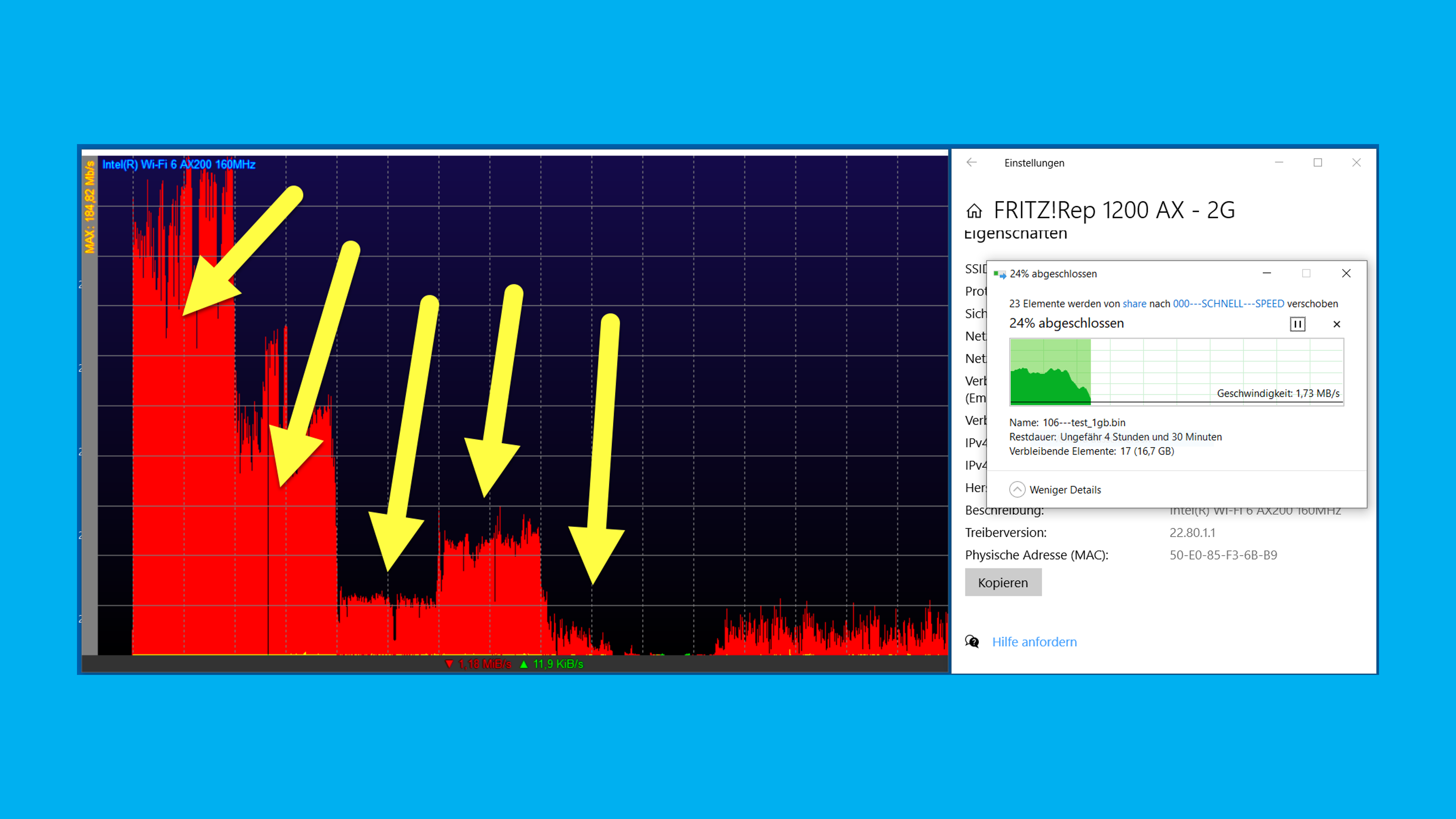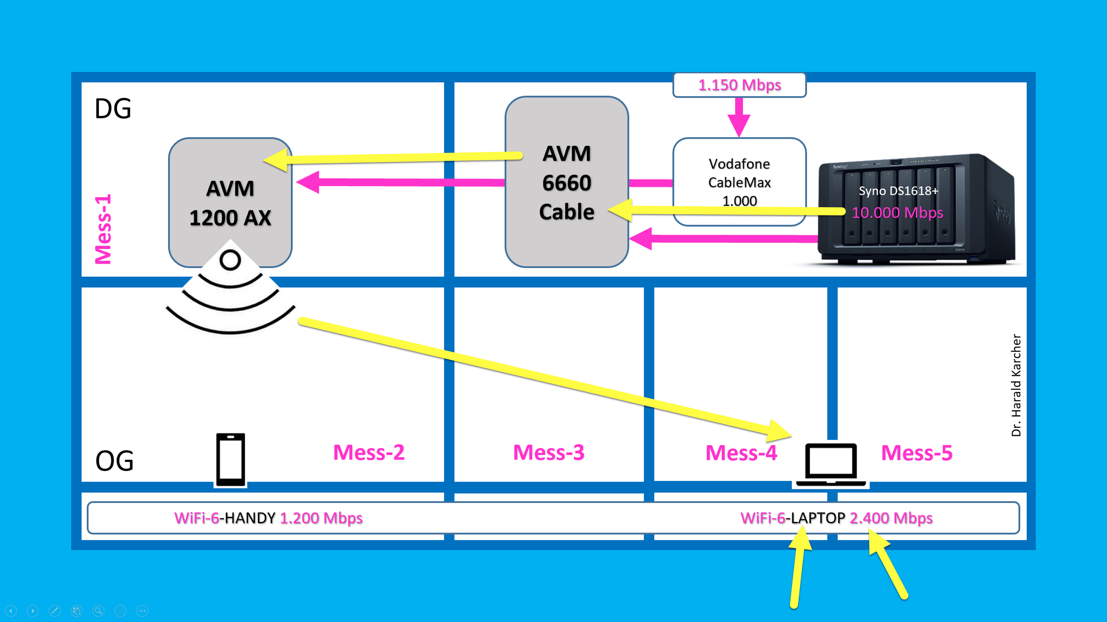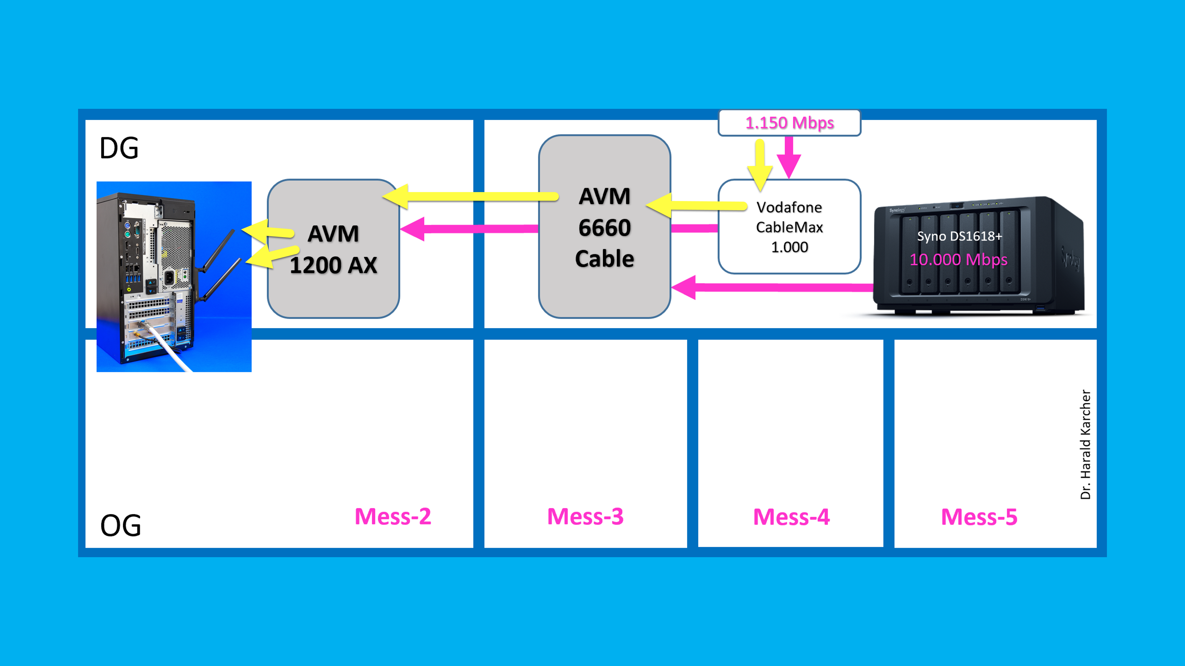 Bei diesem ersten stationären Messtest ziehen wir große Testdateien vom 10-Gigabit-NAS-Server via Fritz Box und Fritz Repeater bis in die Wifi-6-Workstation herunter. Das ist die Strecke an den gelben Pfeilen. Danach senden wir große Dateien wieder vom Rechner bis in die NAS-Station hoch.