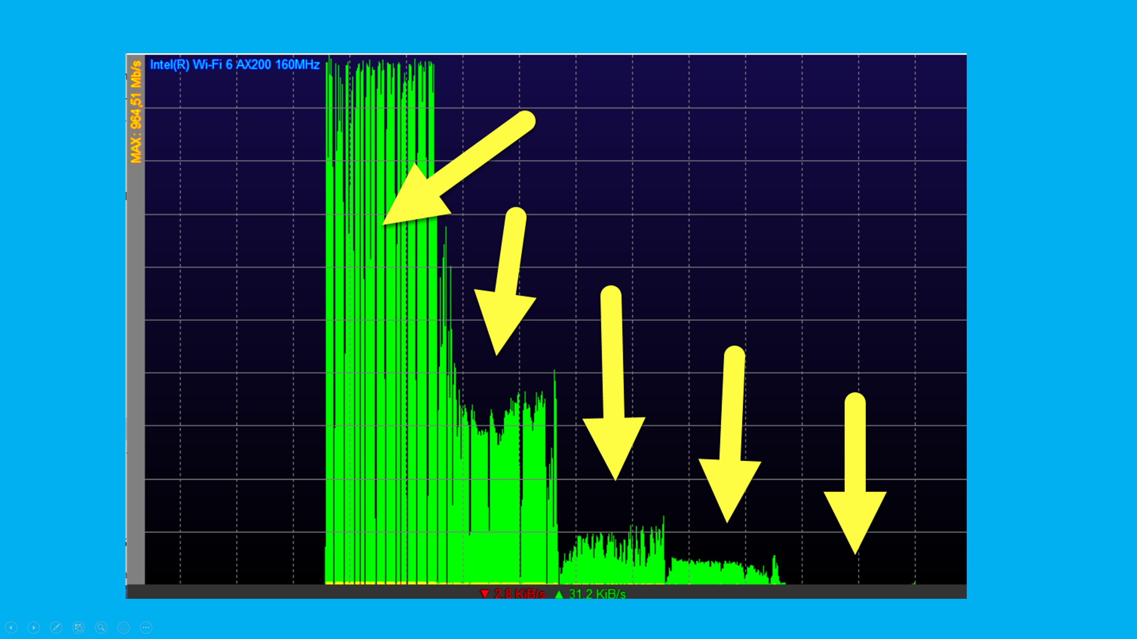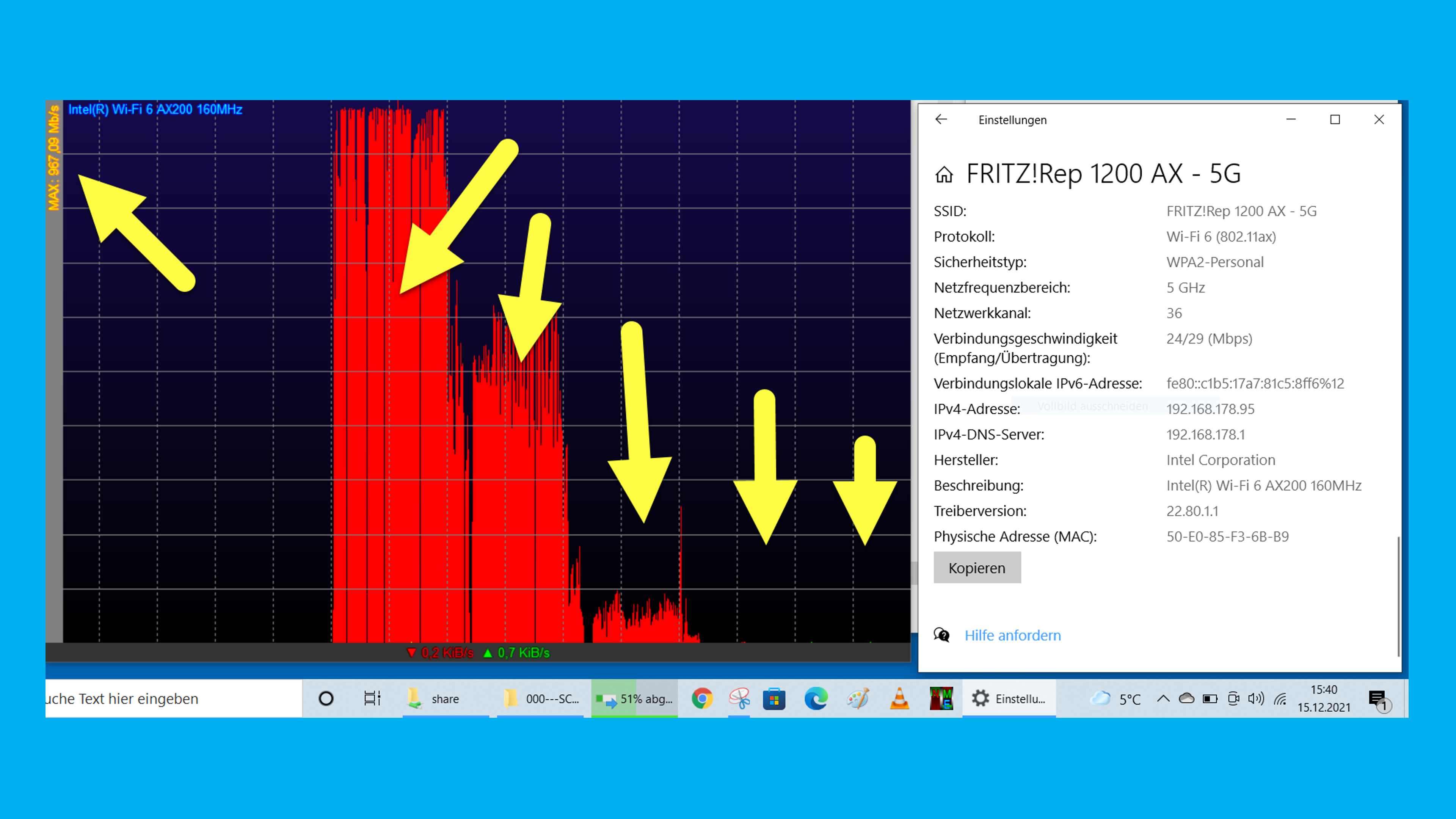 Es fällt auf, dass das Gespann aus Laptop und Wifi-6-Repeater auch noch außerhalb dieser Grafik den Speed sehr lange nicht mehr hochschaltet, obwohl wir schon längst wieder in Zimmer 1 direkt neben dem Repeater stehen. Im Test des AVM Fritz Repeaters 1200 (Testbericht) haben wir das als „Kleben“ in den unteren Gängen bezeichnet. Ende 2021 gibt es diesen unerwünschten Effekt wohl immer noch. Sogar bei brandneuen Wifi-6-Funkern, und das nicht nur bei AVM.