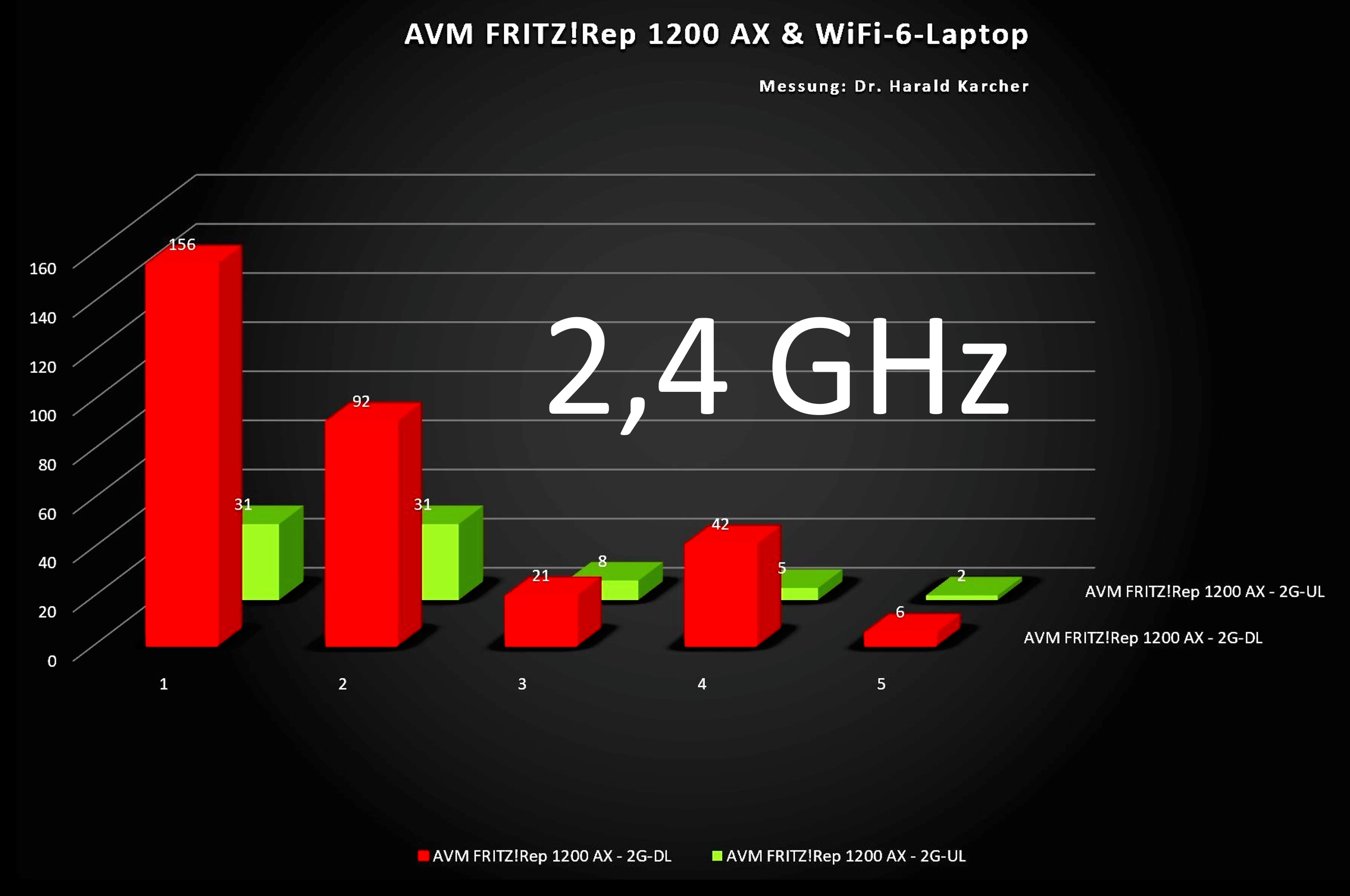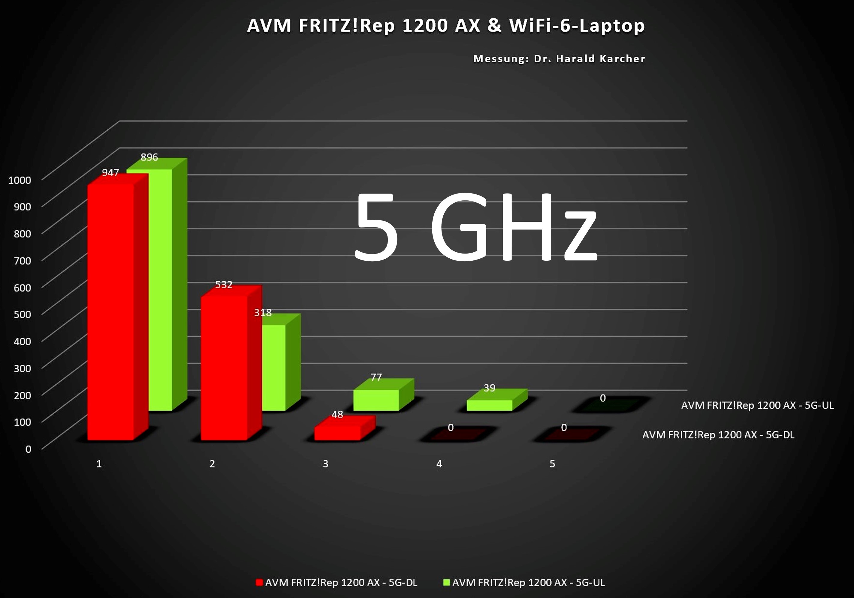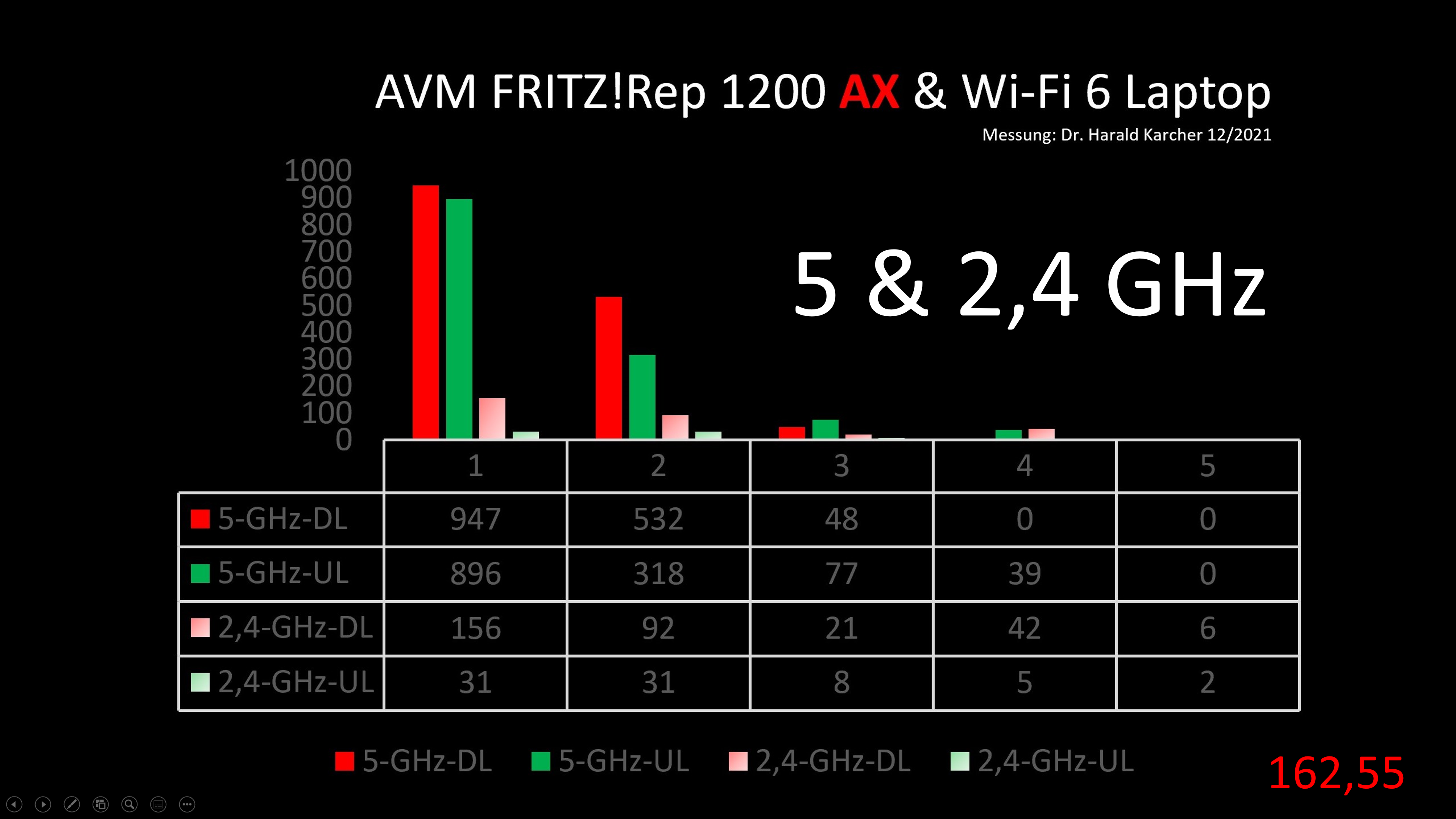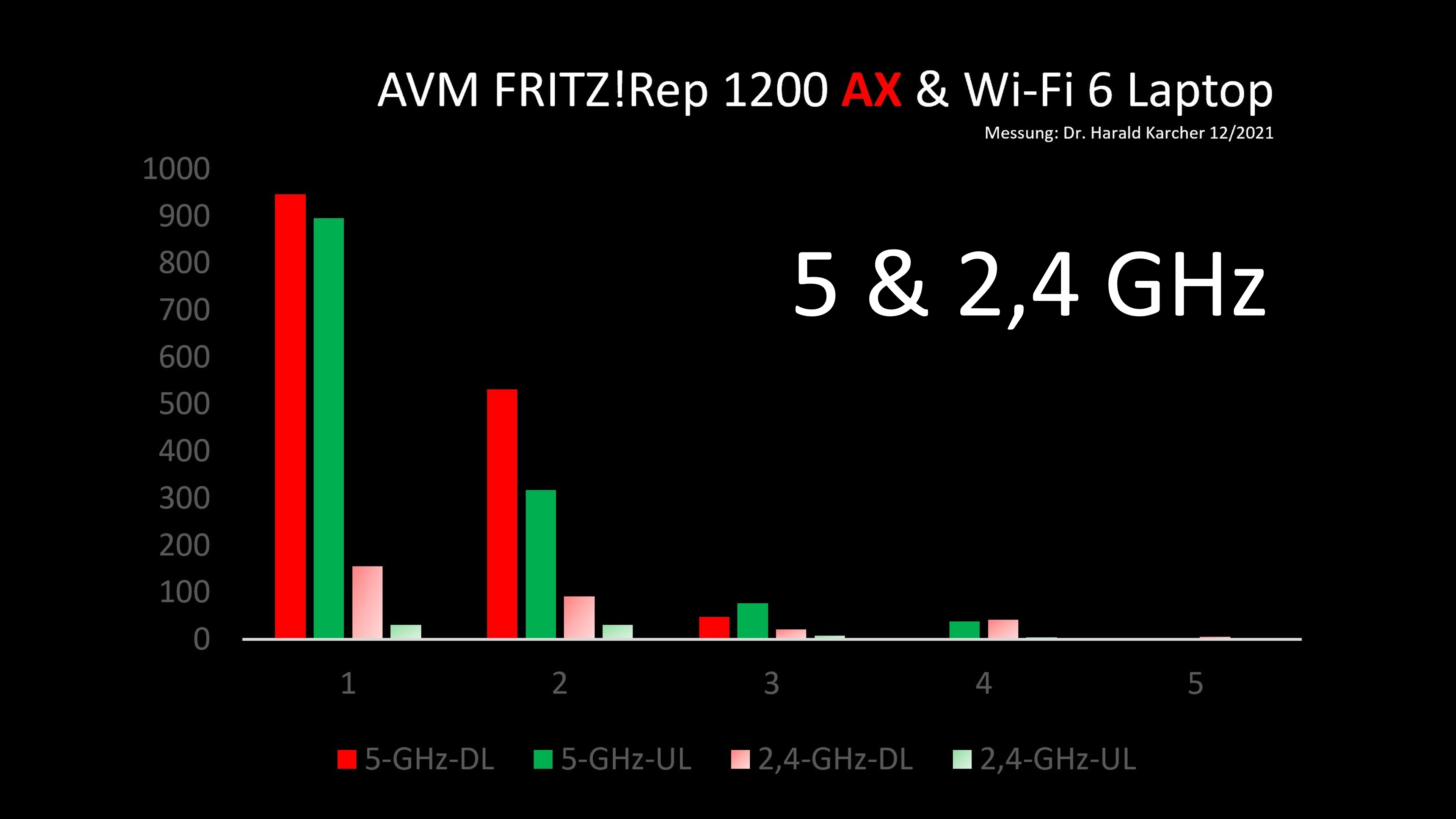 Der Wifi-6-Dual-Band-Fritz Repeater1200 AX aus Dezember 2021 verspricht 600 MBit/s bei 2,4 GHz plus 2400 MBit/s bei 5 GHz. Seine 1-GbE-LAN-Buchse bremst den Durchsatz beim Übergang ins kabelgebundene Heimnetz aber auf knapp 1000 MBit/s herunter.