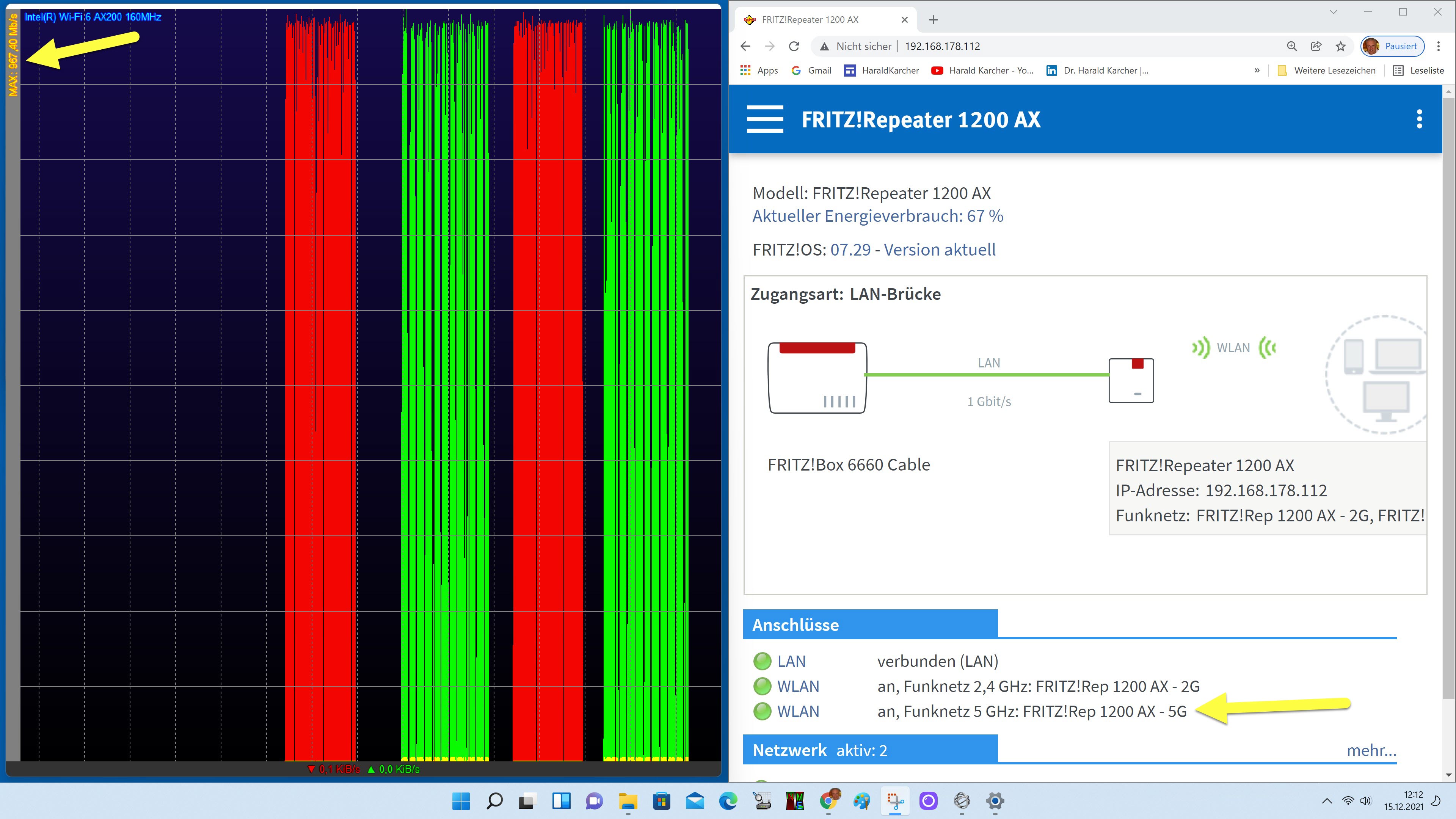 Bei intensiven Downloads großer Dateien von der NAS-Station auf den Wifi-6-Laptop konnten wir den Repeater auf gut 7 Watt hochtreiben. Laut AVM-Handbuch Seite 84 hat der Repeater 1200 AX eine durchschnittliche Wirkleistung von circa 3,8 Watt. Das passt, wir haben im Stand-by nach wie vor knapp 3,6 Watt gemessen.