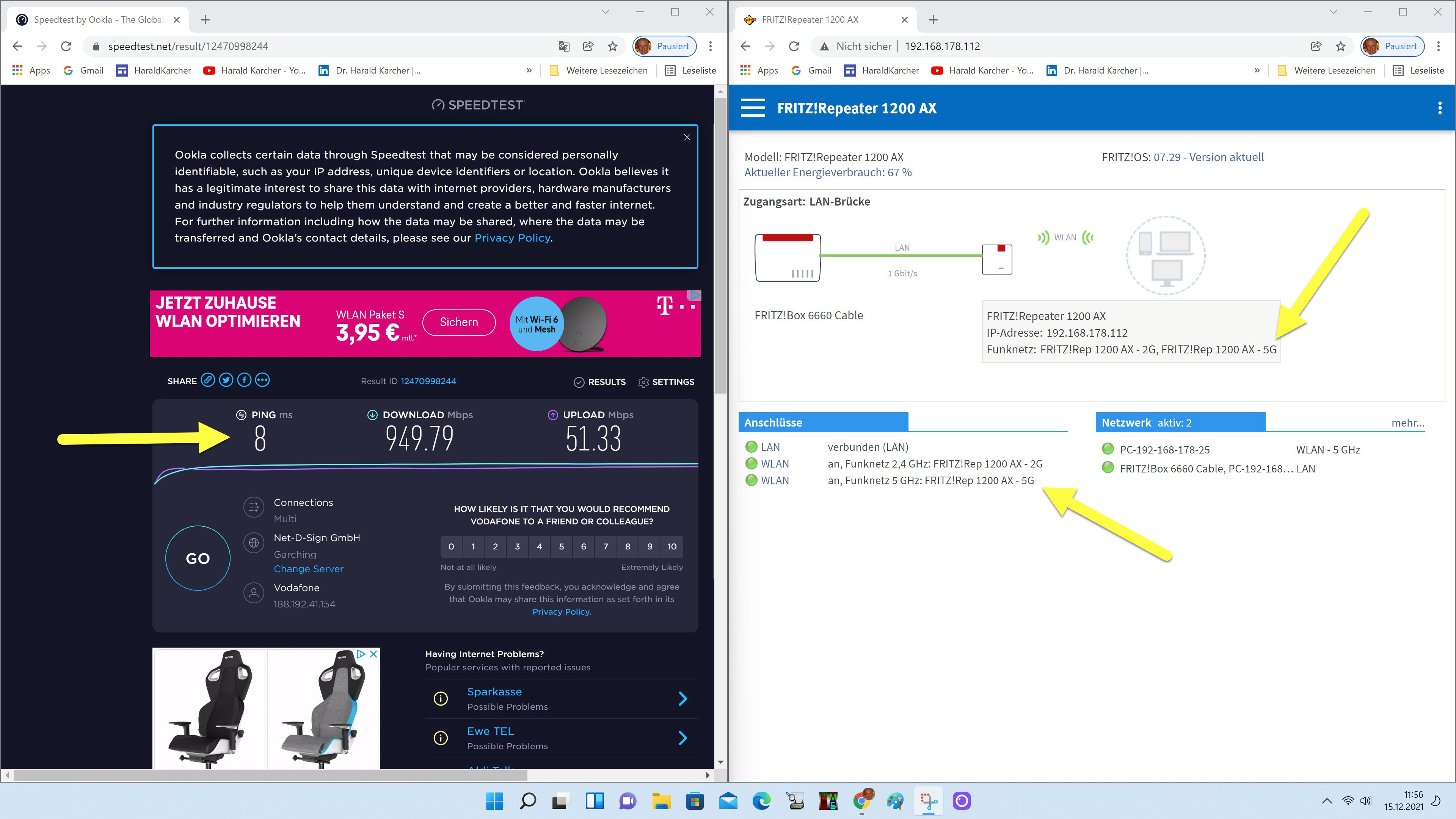 Es kommen auf Anhieb knapp 950 Megabit über die 5 GHz-Zelle des Repeaters im Wifi-6-Rechner an. Auch dies kein schlechter Wert. Was will man mehr bei einem Repeater für 89 Euro UVP.