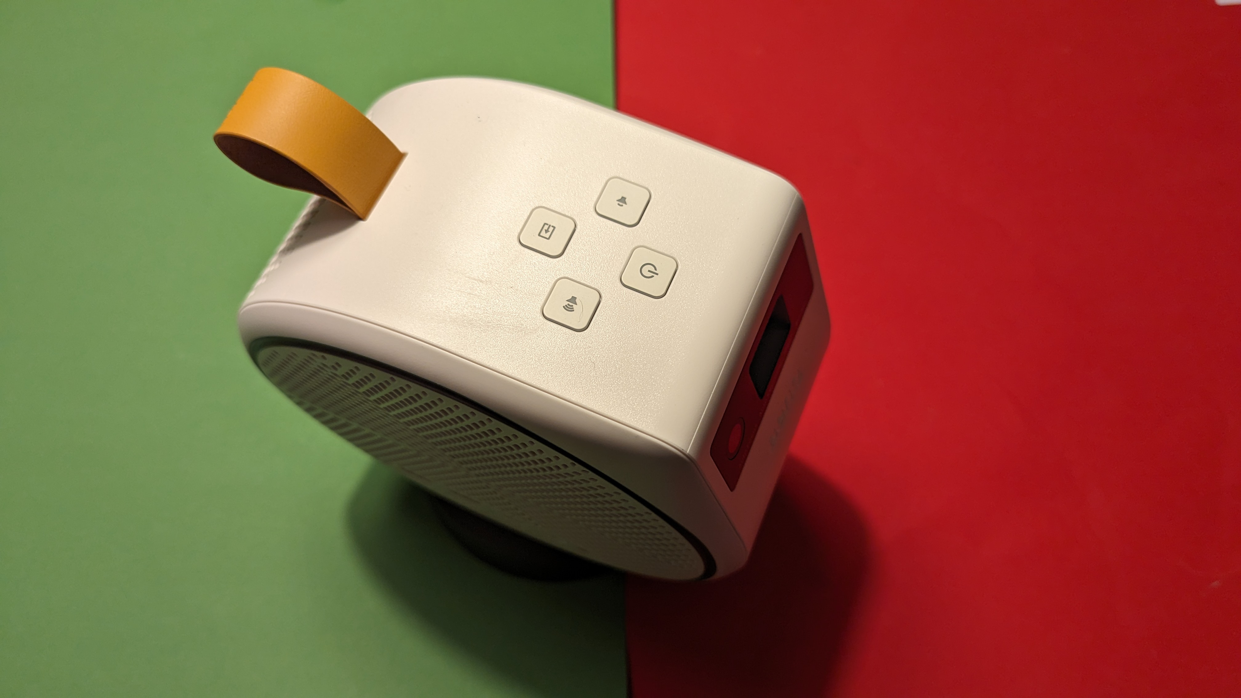 Benq setzt beim GV31 Mini-Beamer auf ein ungewöhnliches Design: Das Gehäuse erinnert an einen übergroßen Eishockey-Puck, besitzt aber dort, wo die Linse sitzt, eine Ecke. Dadurch lässt sich der Beamer flexibel auf dem Standfuß platzieren, sodass wir das Bild in einem stufenlos verstellbaren Winkel auf die Projektionsfläche werfen können.