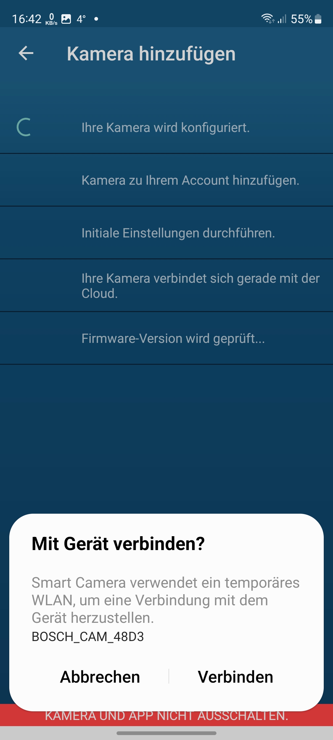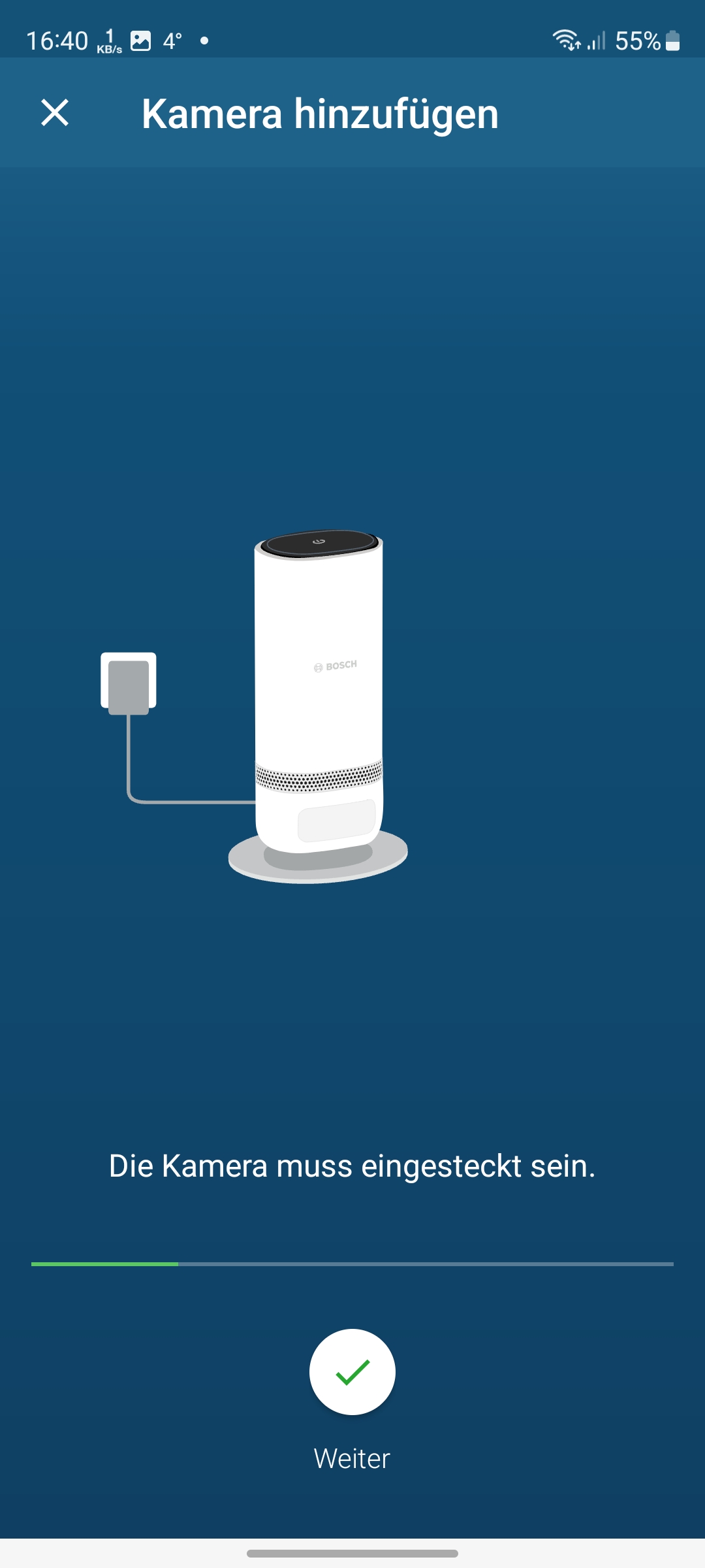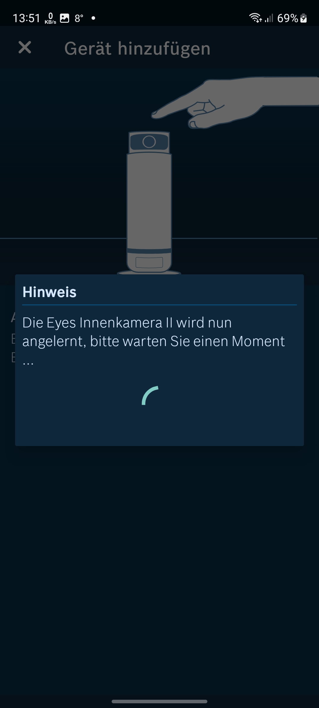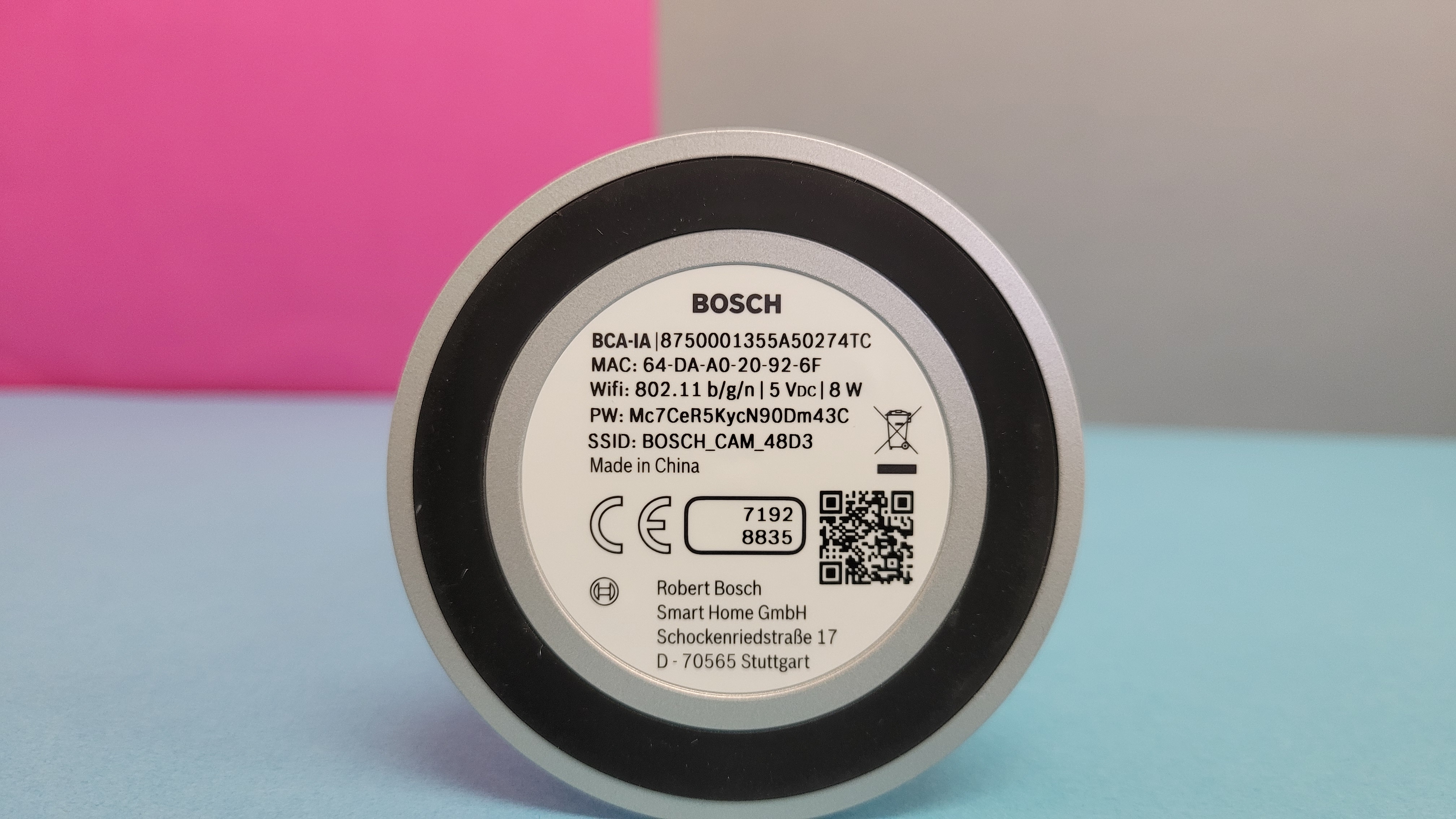 Die Einrichtung der Bosch Eyes Innenkamera II mit der App verläuft über das Einscannen des an der Unterseite der Kamera befindlichen QR-Codes und anschließenden Koppelung mit dem heimischen WLAN unproblematisch (siehe auch Bildergalerie). Allerdings unterstützt die Kamera nur 2,4-GHz-Netze.