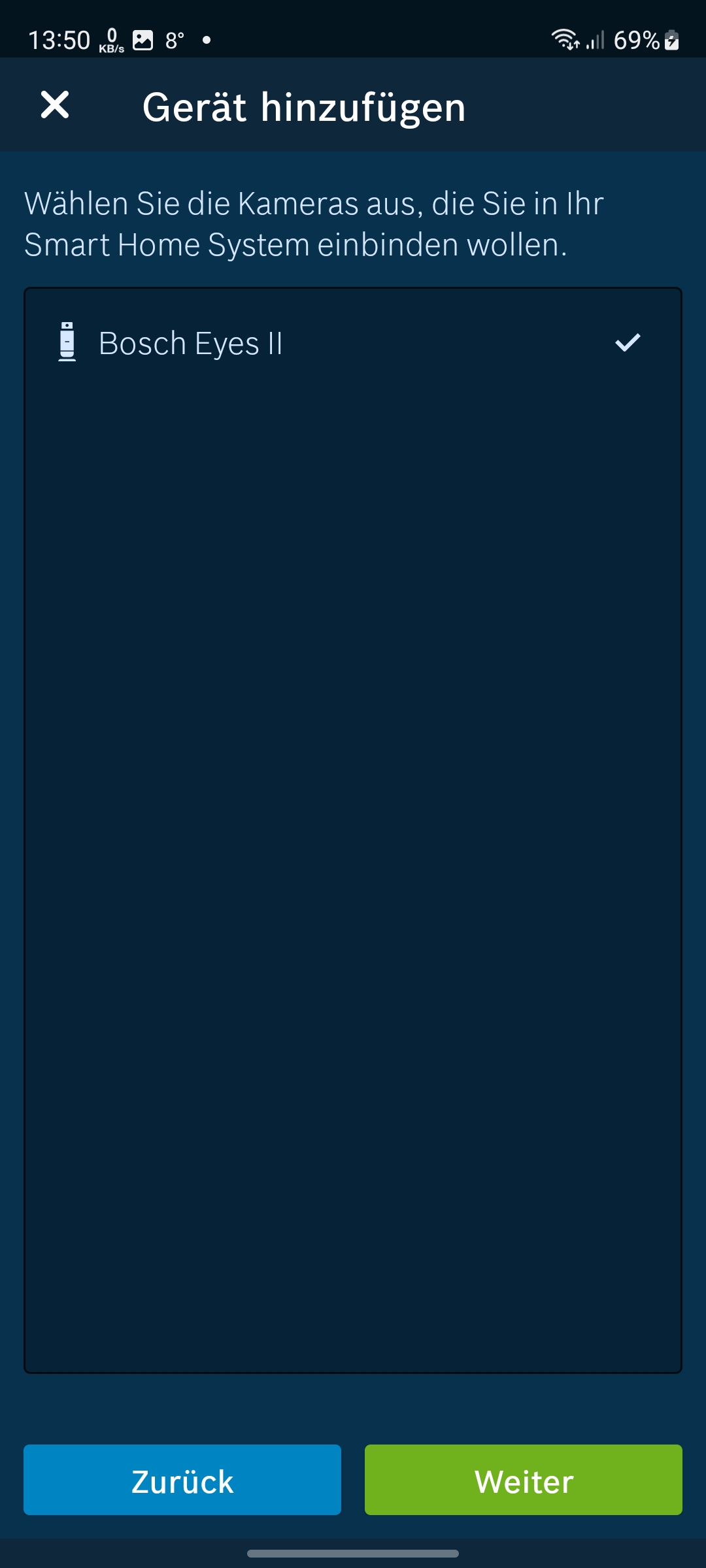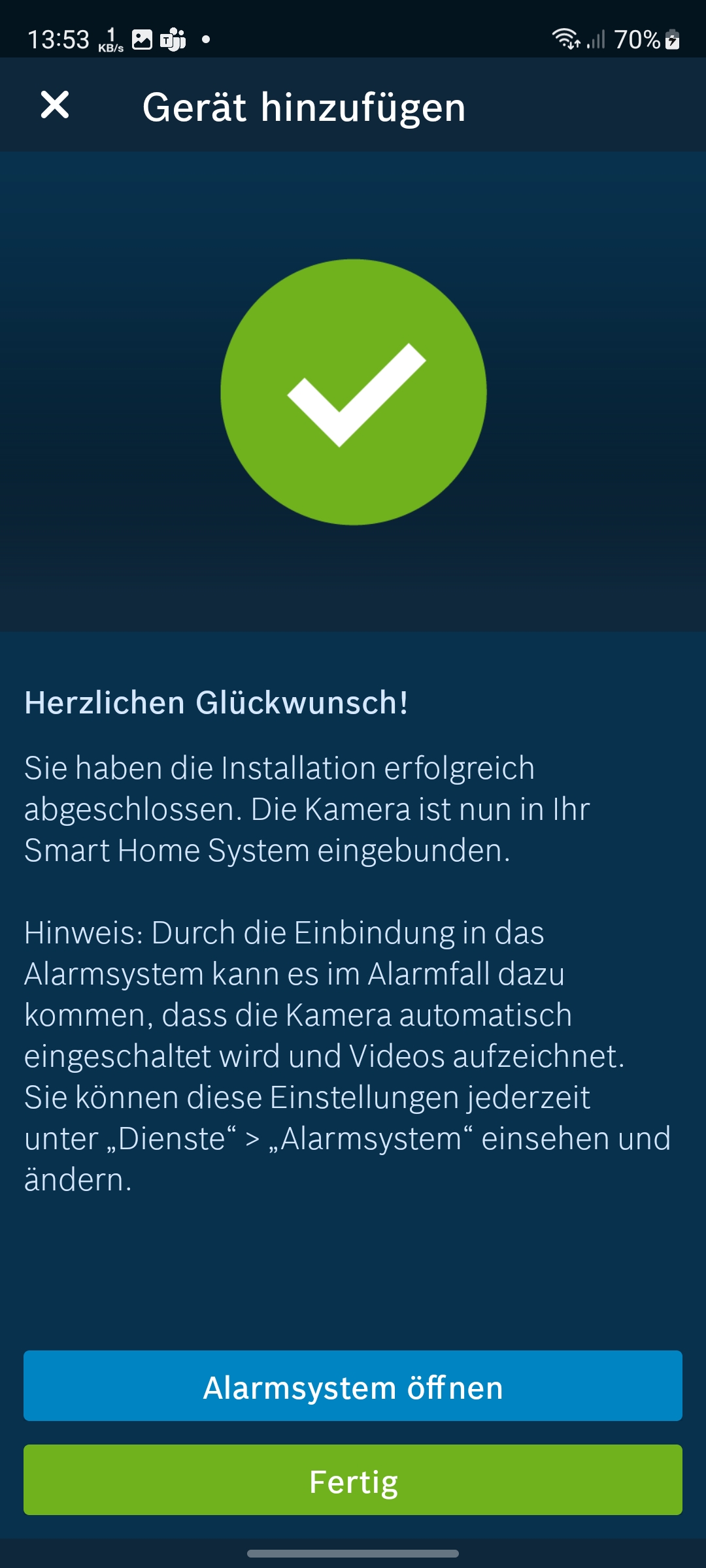 Eines der Highlights der Bosch Eyes Innenkamera II besteht in der Möglichkeit, sie in das Smart-Home-System von Bosch integrieren zu können. So können Anwender sie für Automatisierungen und Szenarien mit anderen Komponenten kombinieren. Und auch zu Amazon Alexa ist die Bosch-Kamera kompatibel. Allerdings hat Alexa lediglich das integrierte Alarmsystem erkannt, stellt aber den Livestream nicht dar.