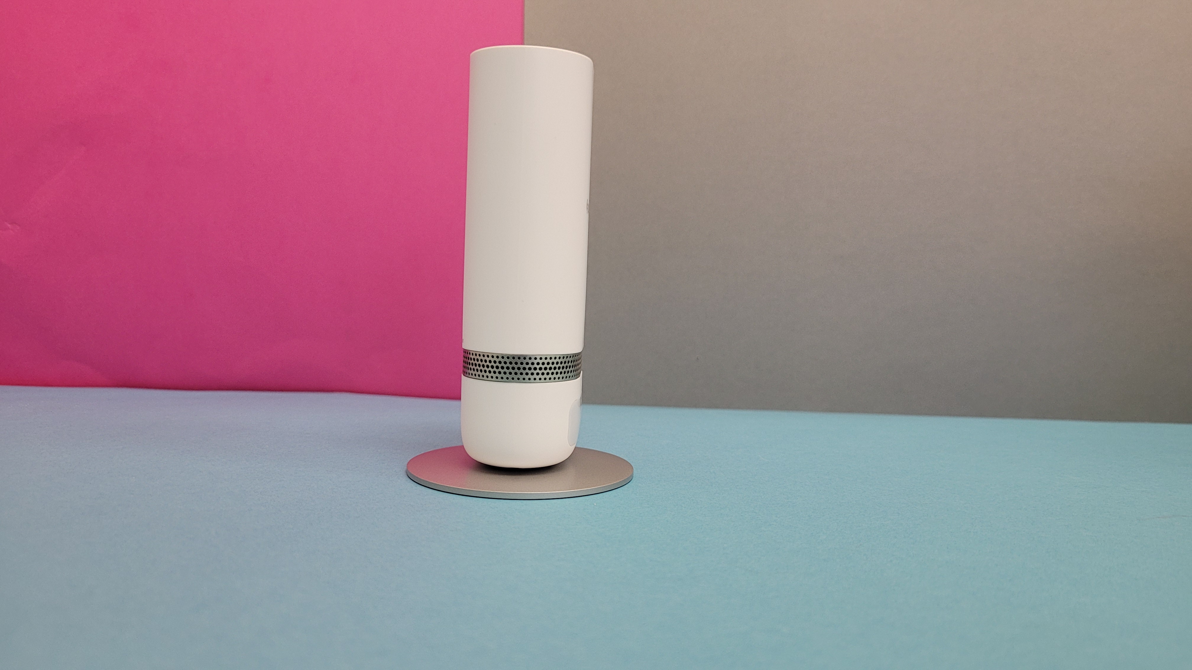 Über der Abdeckung des Bewegungsmelder verläuft um das Gehäuse ein in Silber lackiertes und mit runden Öffnungen versehenes Plastikband, hinter der sich ein Lautsprecher verbirgt. In Kombination mit einem integrierten Mikrofon stellt dieser auch die Gegensprechfunktion bereit. Man kann sich also mit Personen vor der Kamera unterhalten. Trotz der geringen Abmessungen des Lautsprechers sind Sprachansagen gut verständlich – auf beiden Seiten.