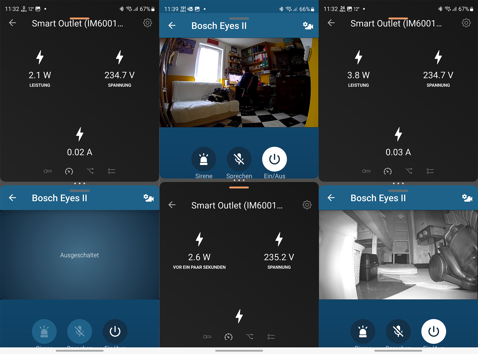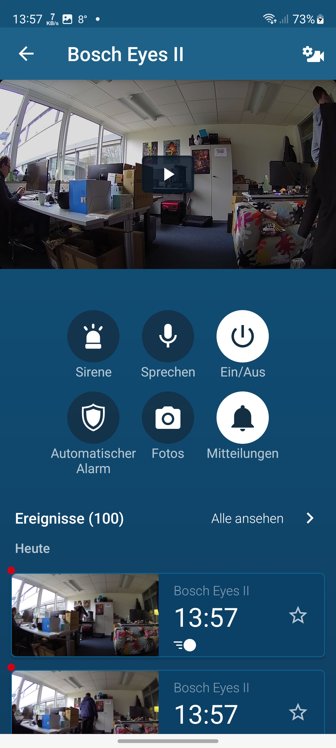 Unter der Vorschauansicht gibt es sechs Schalter, mit denen man etwa die Sirene manuell auslösen, die Gegensprechfunktion nutzen oder den automatischen Alarm aktivieren kann. Außerdem gibt es noch einen Schalter zur Nutzung der Gegensprechfunktion und für das Pausieren von Benachrichtigungen, sowie einen Ein-/Ausschalter. Darunter werden die bislang aufgenommenen Videos angezeigt.