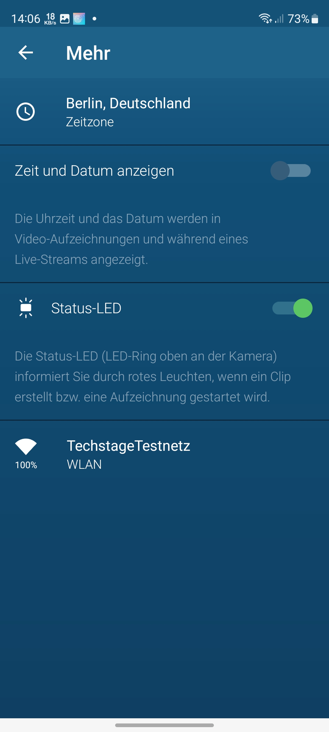 In der Hauptansicht zeigt sich im oberen Bereich ein Vorschaubild des Kamera-Livestreams, das alle paar Sekunden aktualisiert wird. Tippt man auf den Play-Button startet der Livestream. Unter Android dauert es etwa vier bis fünf Sekunden, bis dieser erscheint, während der Livestream unter iOS schon nach zwei bis drei Sekunden parat steht.