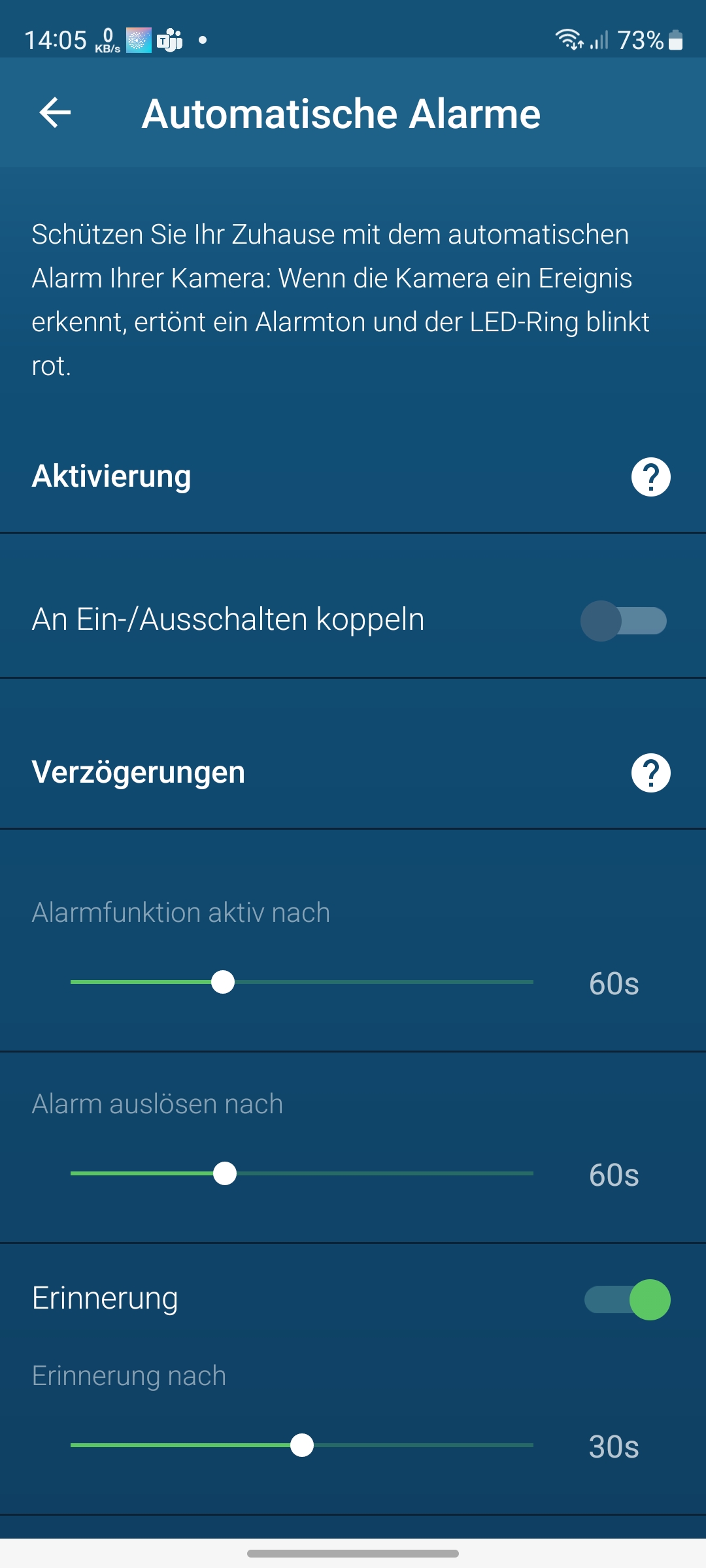 Unter Einstellungen – Nachrichten können Anwender Pushbenachrichtigungen auf Bewegung, Personen, Audio, Alarmfunktion sowie Störung ein- und ausschalten. Eine Störungsmeldung, etwa wenn die Kamera offline ist, wird außerdem per E-Mail übertragen.