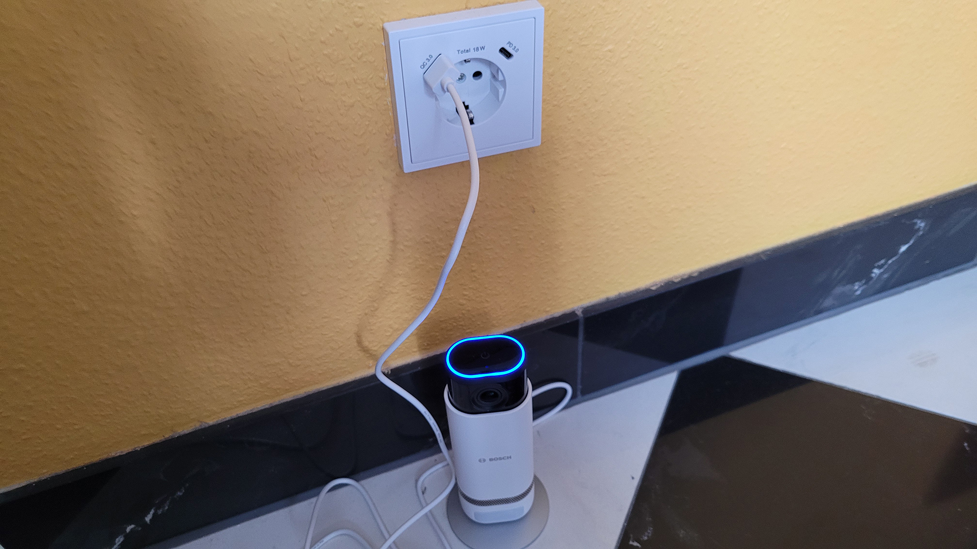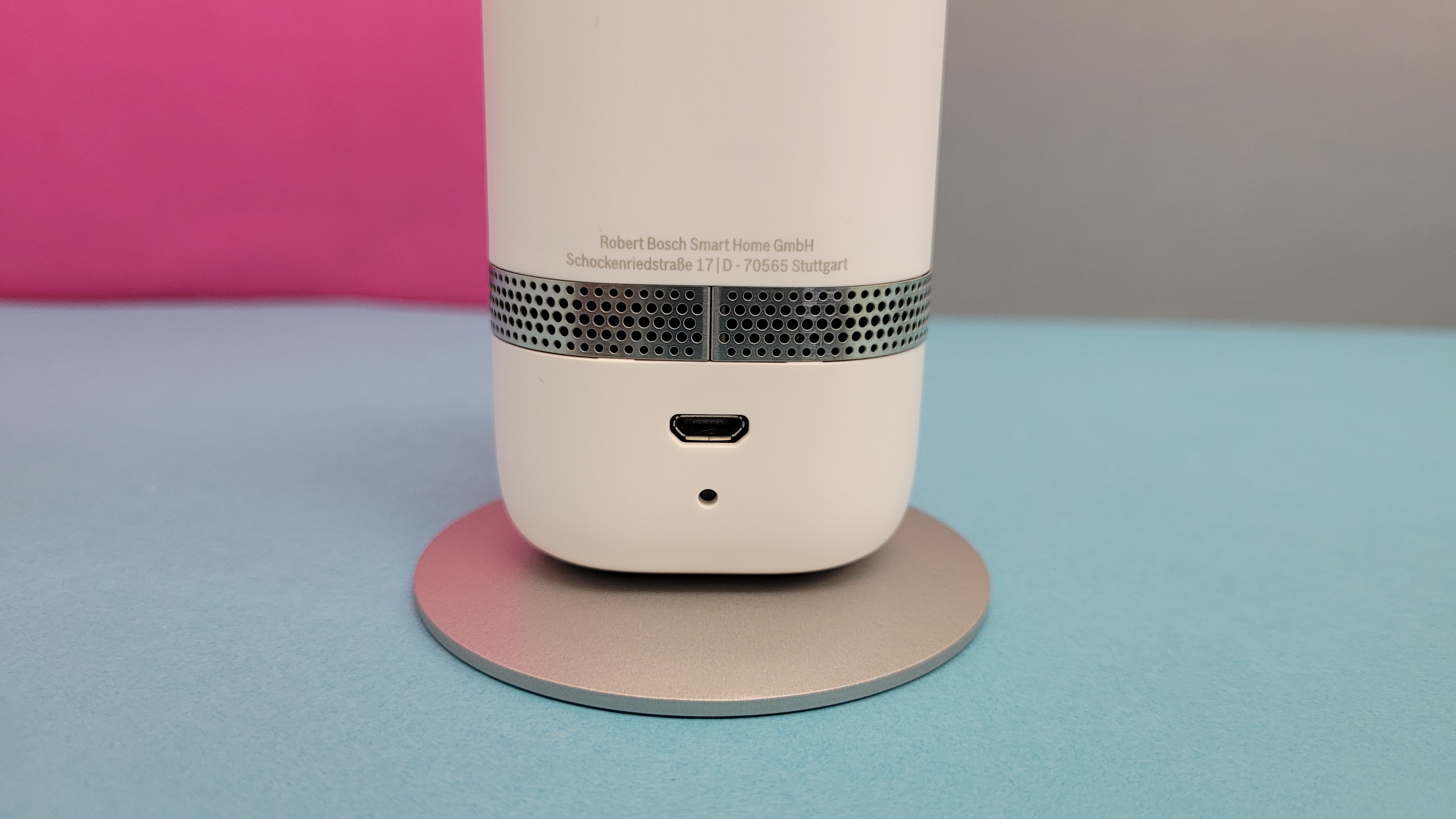 An der Rückseite versteckt sich im unteren Bereich in einer Öffnung ein Reset-Schalter, der durch ein zweimaliges Drücken mit einer SIM-Pin das Gerät in den Auslieferungszustand versetzt. Darüber gibt es eine Micro-USB-Buchse, über die die Bosch Eyes Innenkamera II über das mitgelieferte 10-Watt-Netzteil und einem zwei Meter langen USB-Kabel mit Strom versorgt wird. Die maximale Leistungsaufnahme ist im Datenblatt mit 8 Watt angegeben, gemessen haben wir im Standby mit ausgeschalteter Kamera 2,1 bis 2,3 Watt. Ist sie aktiv, erhöht sich die Leistungsaufnahme auf 2,4 bis 2,6 Watt bei Tageslicht und bis zu 3,8 Watt bei Dunkelheit, wenn die zusätzlichen Infrarot-LEDs zum Einsatz kommen, um für ein klares Bild trotz Dunkelheit zu sorgen. Als alternative Stromversorgung kann auch eine Steckdose mit integriertem USB-Port (Ratgeber) dienen. Im Test mit der USB-Steckdose von MC Power hat die Bosch Eyes Innenkamera II einwandfrei funktioniert.