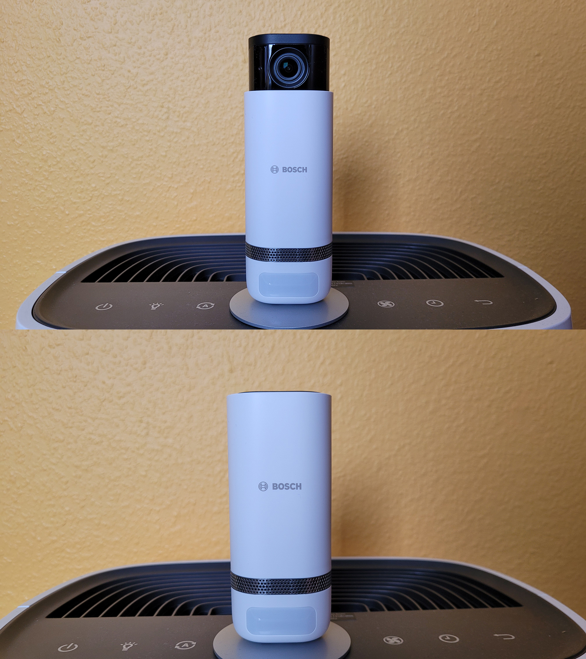Die Bosch Eyes Innenkamera II steckt in einem länglich ovalen und weißen Gehäuse aus Kunststoff mit einer Höhe von 13 Zentimeter und einem Umfang von knapp 16 Zentimeter. Wird die Kamera eingeschaltet, fährt das Objektiv aus dem Gehäuse und verlängert dieses um etwa drei Zentimeter, sodass die Gesamthöhe 16 Zentimeter beträgt.