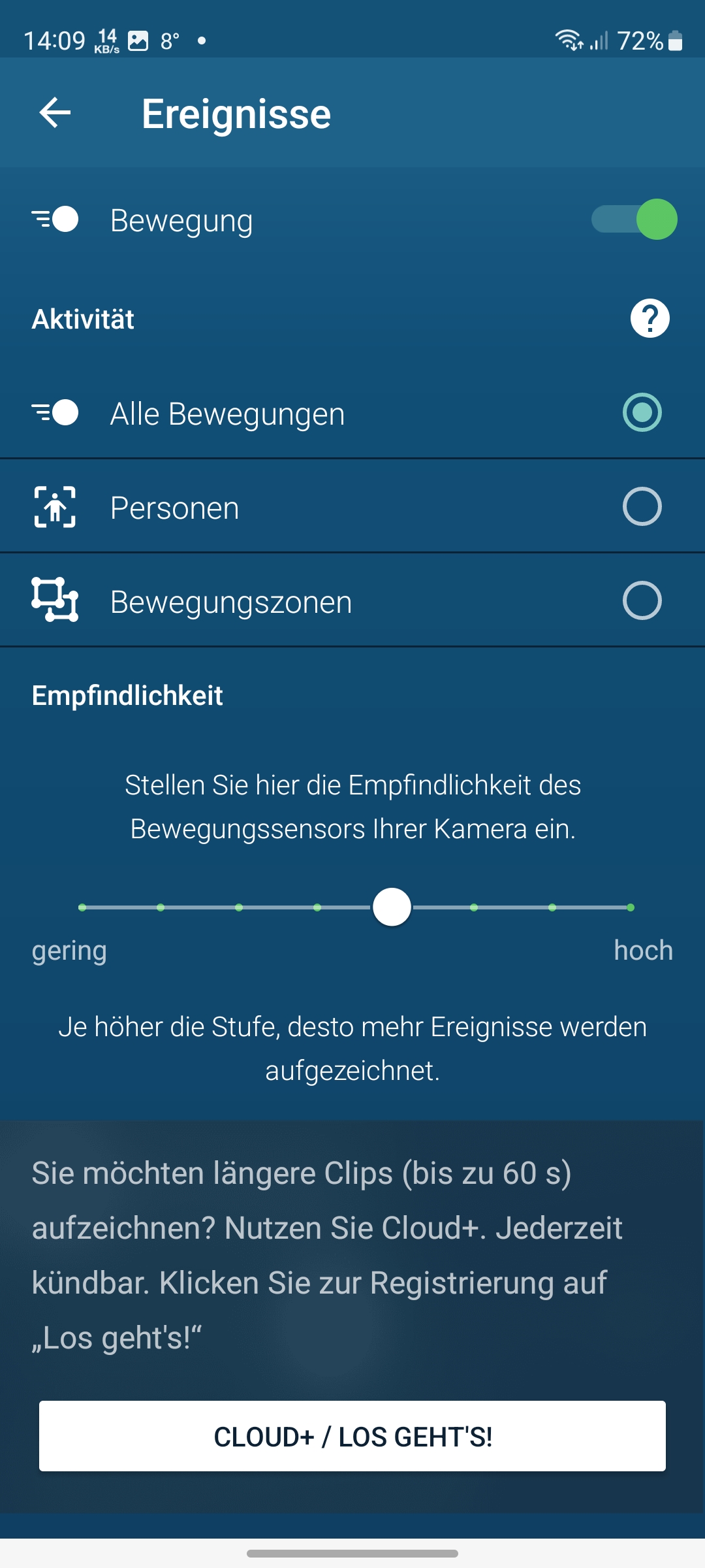 Alarme können Anwender in den Einstellungen unter Ereignisse auf Alle Bewegungen, Personen oder Bewegungszonen limitieren. Letztere schränkt die Bewegungserkennung auf vom Anwender definierte Zonen ein. Weiter unten kann man auch die standardmäßig deaktivierte Geräuscherkennung einschalten und die Empfindlichkeit bei der Bewegungs- und Geräuscherkennung steuern.