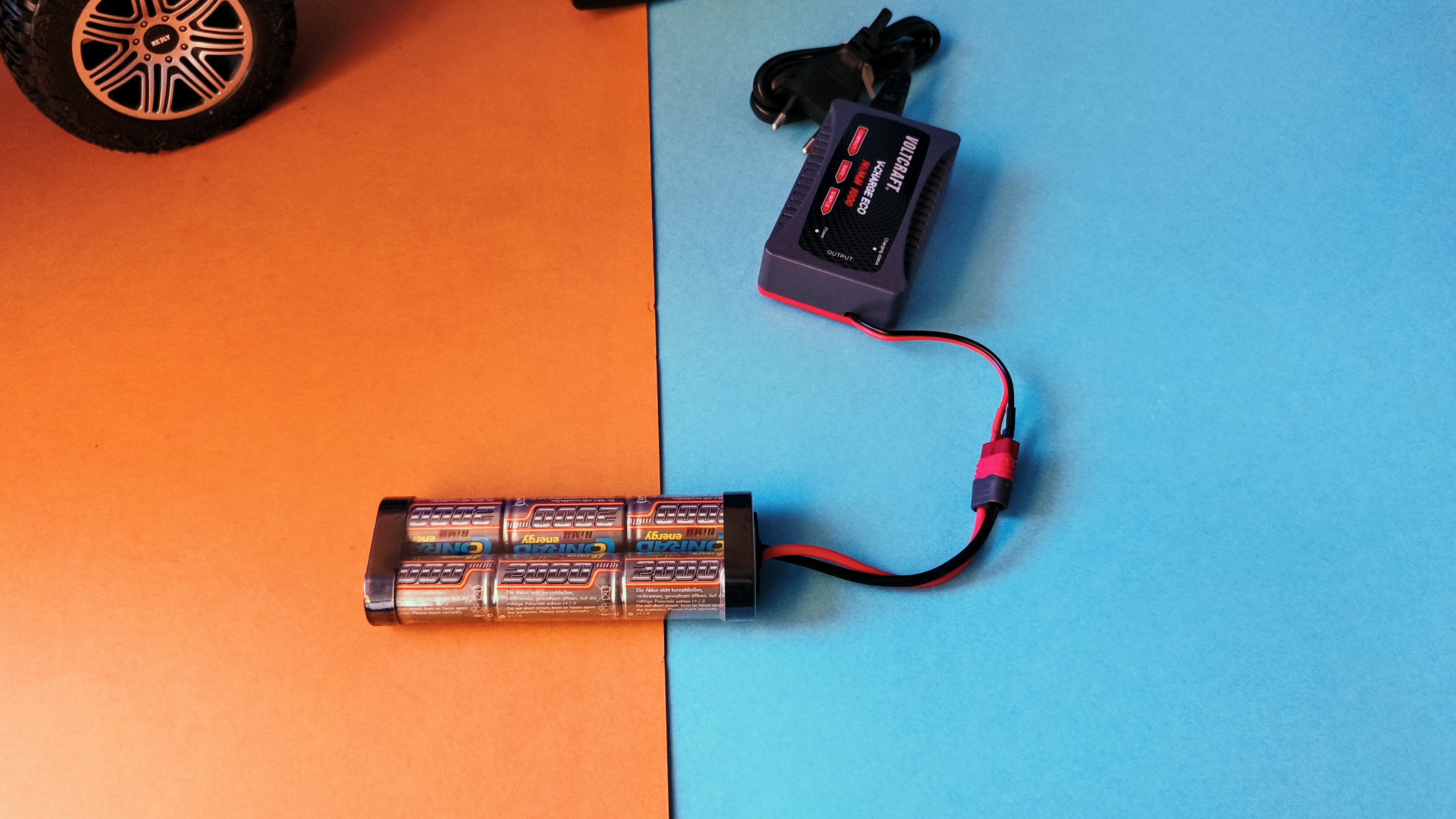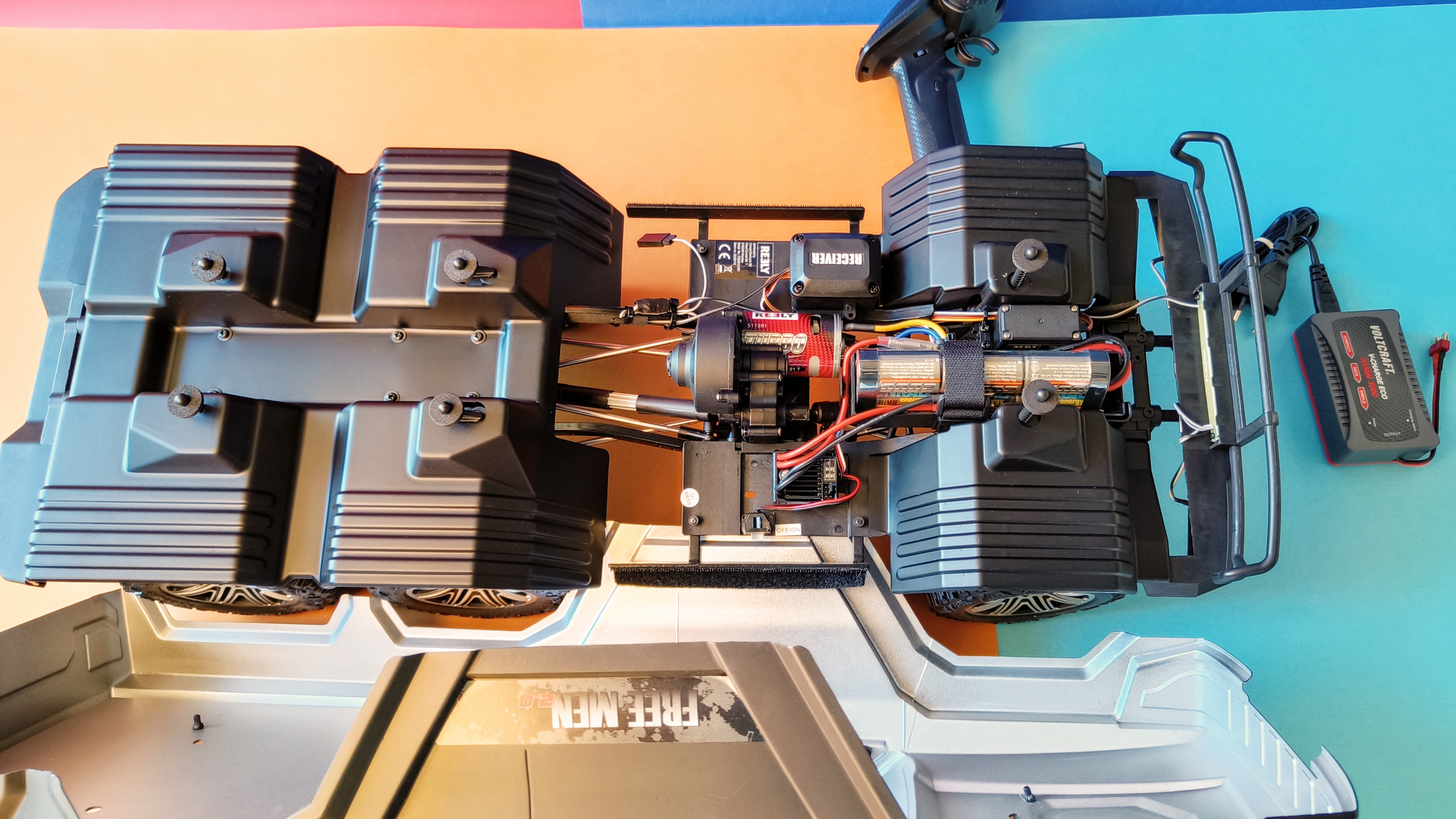 Als Energiequelle dient ein NiMH-Akku mit 7,2 Volt und sechs Zellen. Ein passendes Ladegerät liegt bei, für einen vollständige Ladevorgang sollte man etwa 2 Stunden veranschlagen. Hier sollte man folgendes beachten: Der NiMH-Akku entfaltet seine vollständige Kapazität erst nach etwa drei bis fünf Ladezyklen. Damit fährt der Crawler etwa 13 Minuten lang durchs Gelände, bevor der Akku wieder ans Netz muss. Das klingt kurz, ist aber nicht ungewöhnlich für ein Fahrzeug dieser Art. Der Reely Free Men 2.0 6x6 eignet sich zudem für den Betrieb mit einem LiPo-Akku. Dafür benötigt man aber ein separates Ladegerät.