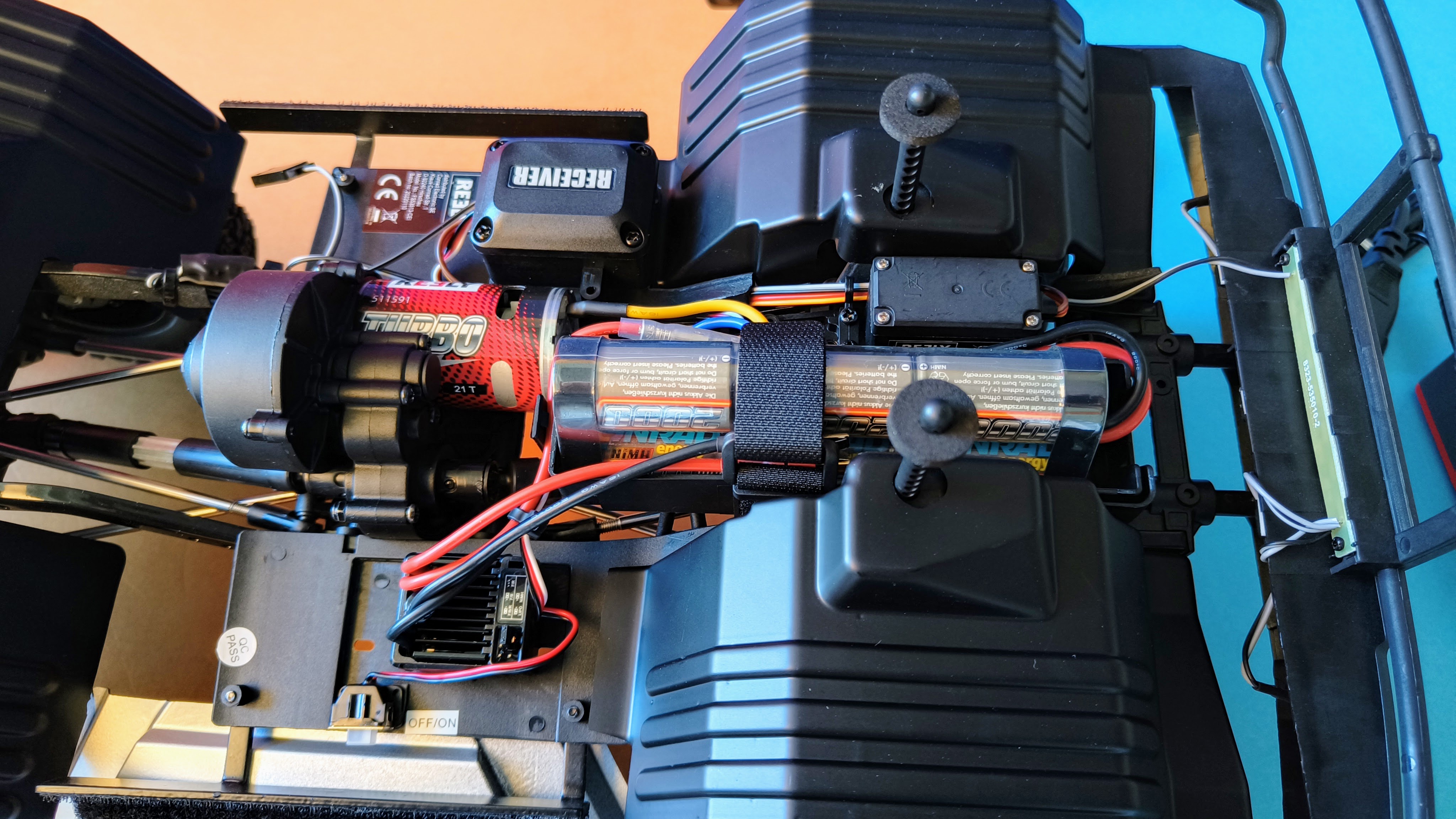 Um die Karosserie abzunehmen, löst man sechs Klemmen an der Motorhaube und der Ladefläche sowie die beiden Klettverschlüsse an den Seiten des Chassis. Darunter findet sich der Elektromotor sowie der Akku, der von einem Klettverschluss zusätzlich in einer Wanne fixiert ist. Die Elektronik ist spritzwassergeschützt. Es spricht also nichts dagegen, auch bei Regen oder auf feuchtem Untergrund eine Spritztour durchs Gelände zu machen. Nach Benutzung darf man sich allerdings auf einige Putzarbeiten gefasst machen, da das Innere nicht vollständig abgeschirmt ist durch die Karosserie. Sollte sich das Fahrzeug überschlagen, schützt ein Überrollkäfig in der Pritsche vor größeren Schäden.